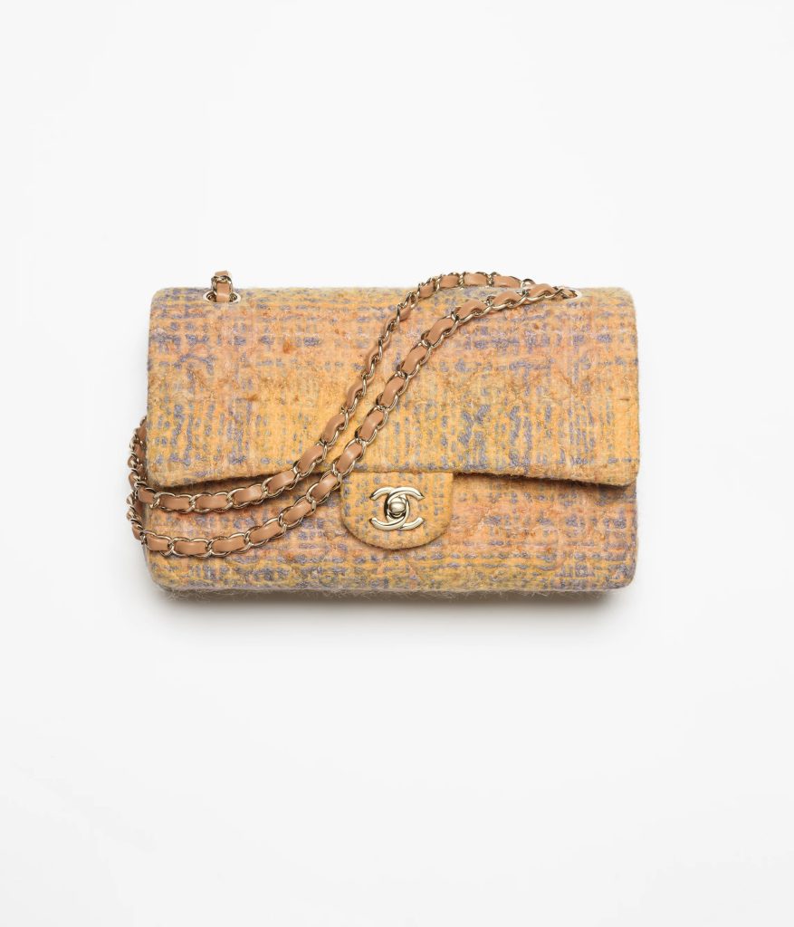 The Chanel Classic 11.12 is one of the most iconic designs in the Chanel bag collectsion; tweed fabric is the most iconic design element in Chanel’s clothing. So what would happen when these two most iconic elements are combined? I was instantly captivated when The model in a yellow wool tweed suit and an Tweed Classic 11.12 walked down the runway. The Chanel Classic 11.12 tweed features orange as the main color, with gray and yellow threads woven into it, creating an impressionistic painting-like color palette that is gentle, romantic, and refined!