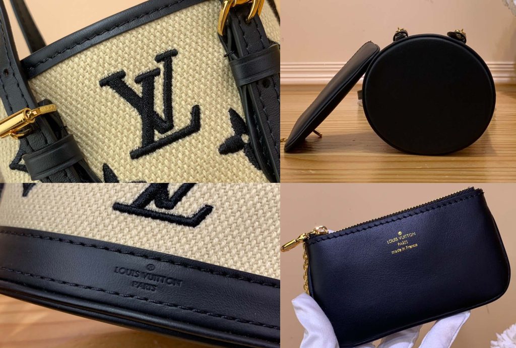 The LV Nano Bucket Bag is made of a new material that looks like natural cotton, kind of like raffia grass The trims, base, and shoulder strap are made of leather, which is highly durable and practical. The bag is adorned with Monogram canvas embroidery, adding a touch of richness and timeless charm. For those who are fans of the Monogram pattern, it’s hard to resist the allure of this design!