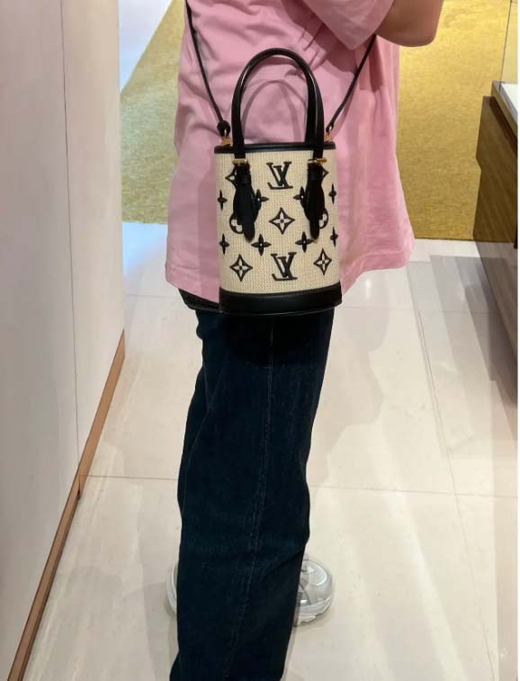 Take a close look at the details of this mini Monogram bucket bag. The delicate texture of the cream-colored woven cotton intertwines with the classic black embroidery, creating an exquisite, warm, and elegant texture. The level of craftsmanship displayed in this piece is truly remarkable, capturing the essence of summer and vacation fashion with stunning intricacy. Its light, romantic, and graceful style exudes an air of exclusivity that makes it a must-have for any discerning collectsor seeking to acquire a Monogram item from LV.