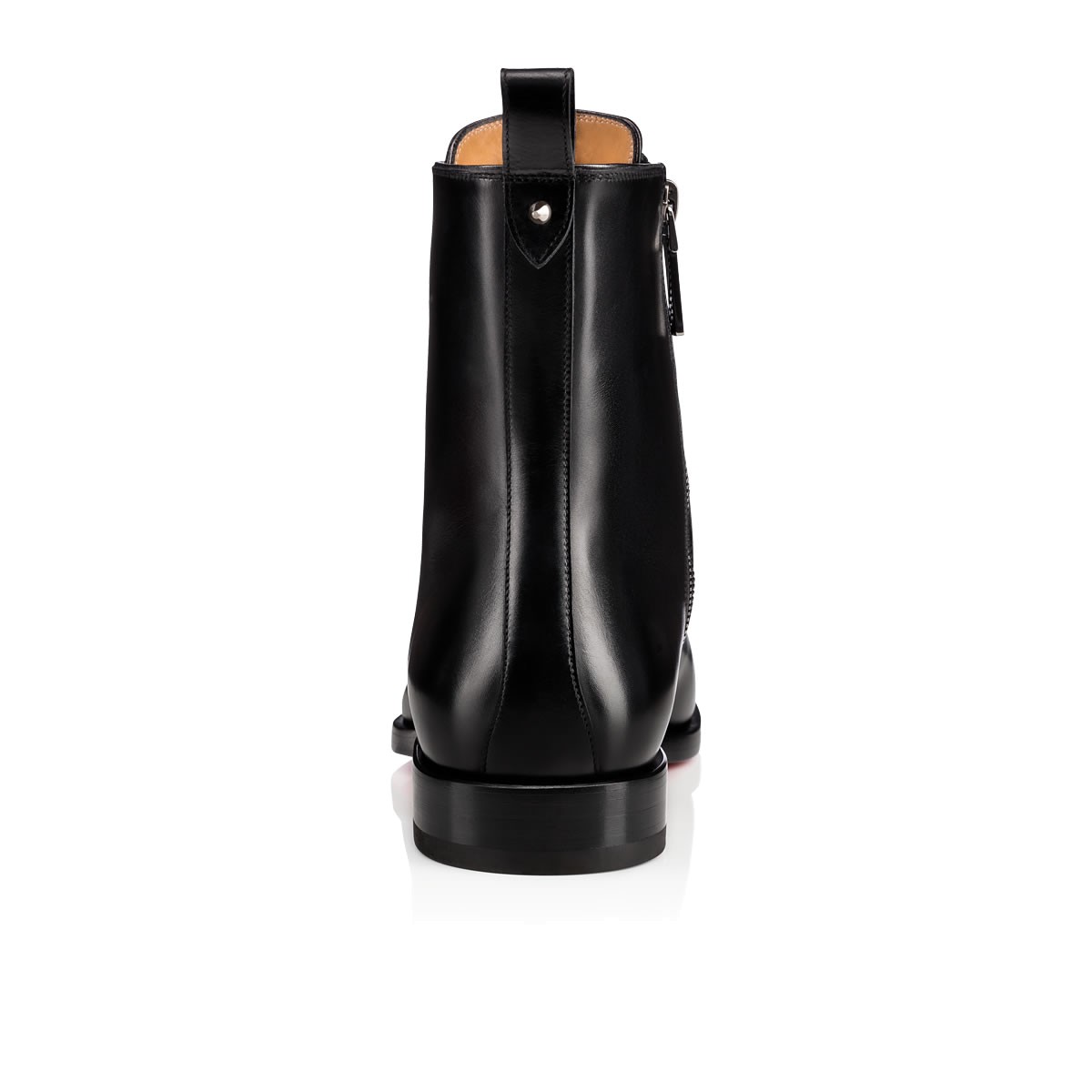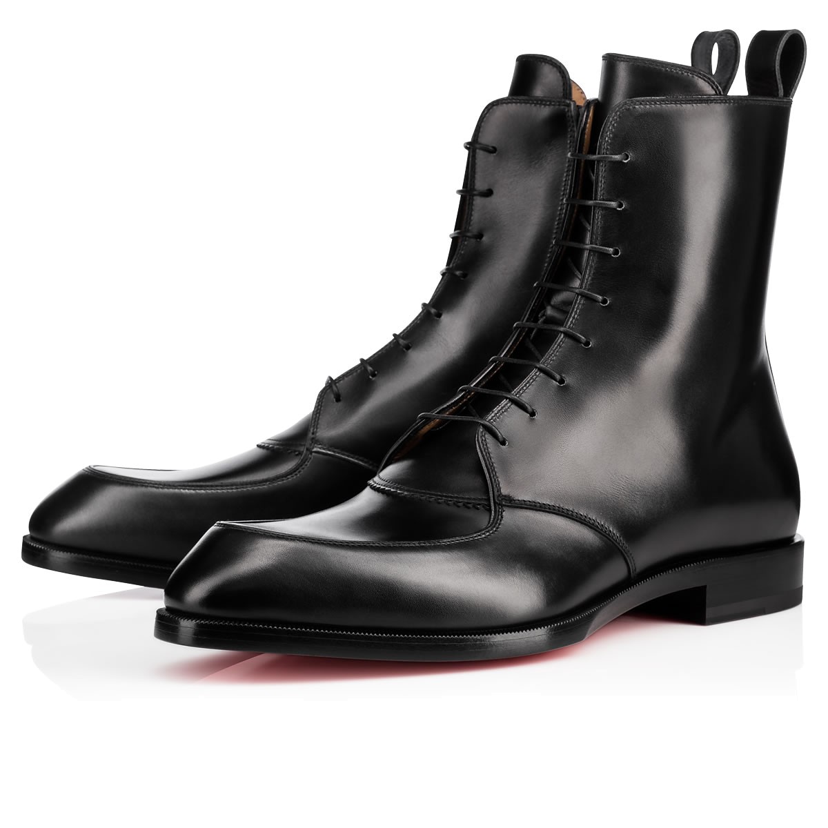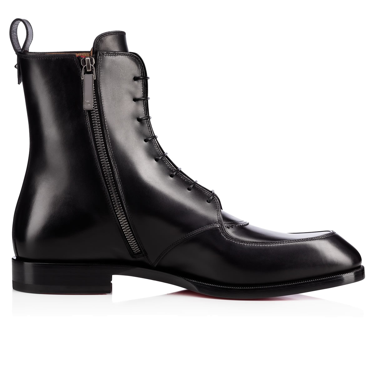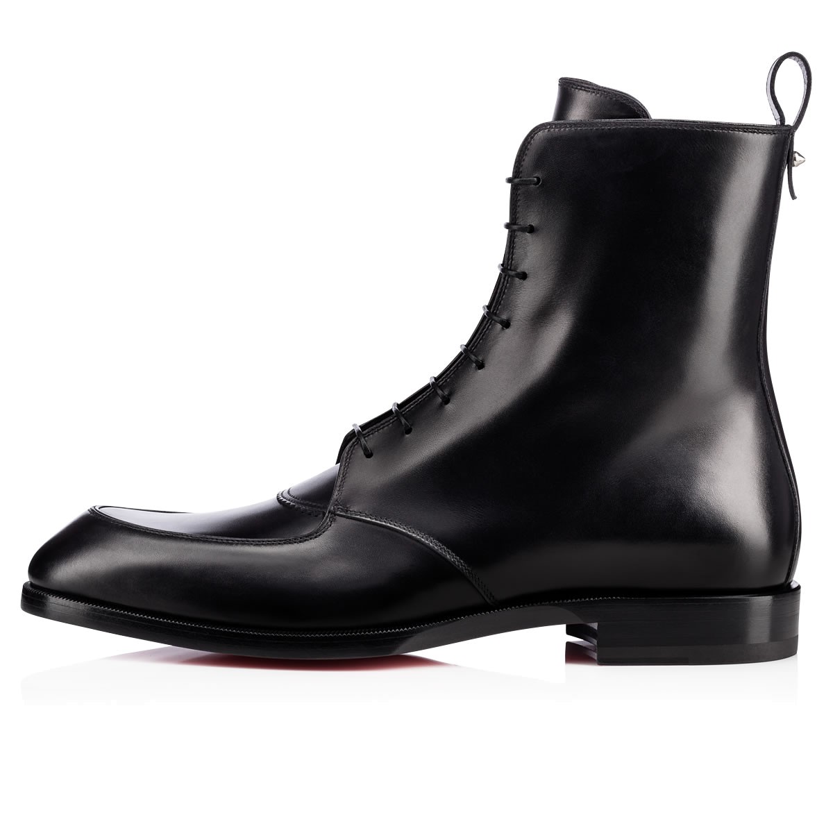 “Ajmone Flat” is the smoothest new city boot on the scene this season. Featuring structured stitching at the toe box and across the vamp, this lace-up boot in black patina-effect leather is finished with a removable metallic bar feature and a single signature spike at the pull loop.