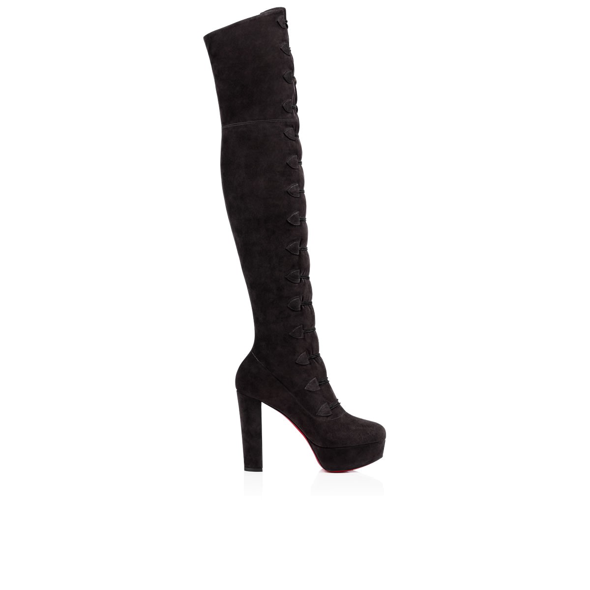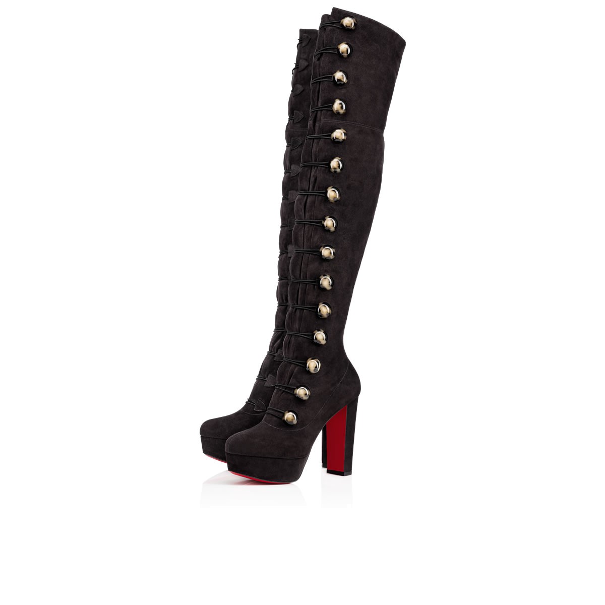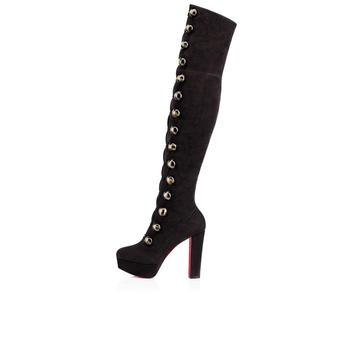 “Alta Manuela” hugs the leg in an ultra chic slim fit. Fastening manually with 21 tortoise shell effect buttons and elastic loops, this 120mm thigh-high style in supple charbon suede brings rock star status to your wardrobe this season.