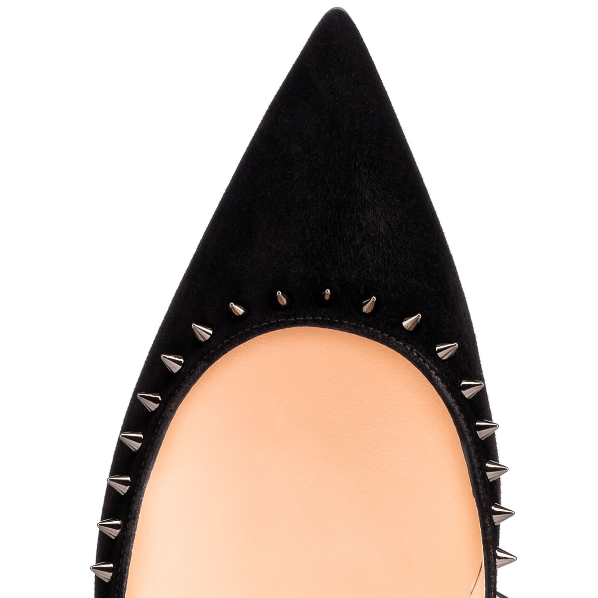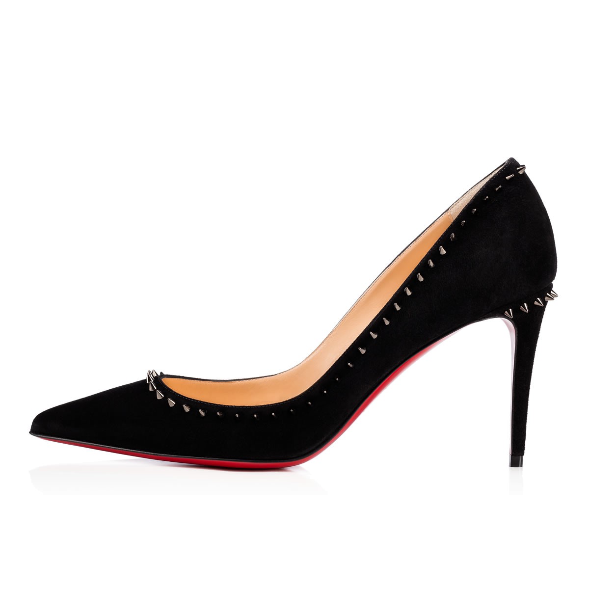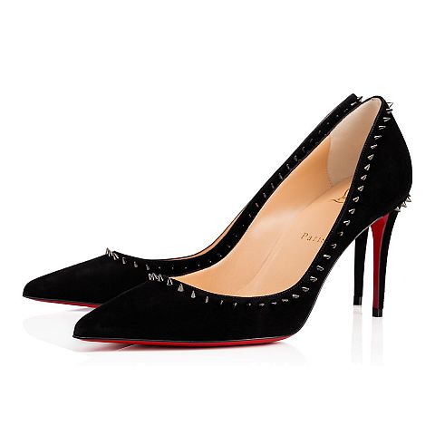 “Anjalina’s” slender pointed toe and 85mm spike heel are accompanied by a delicate trace of signature mini spikes, giving this classic silhouette an iconic Louboutin touch. In black suede with black gunmetal spikes, she is the perfect punctuation from day to dark.