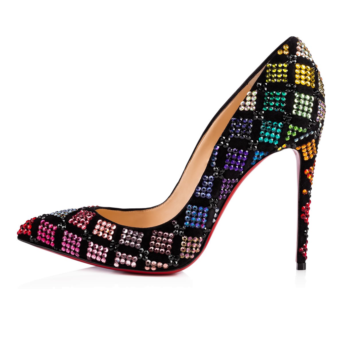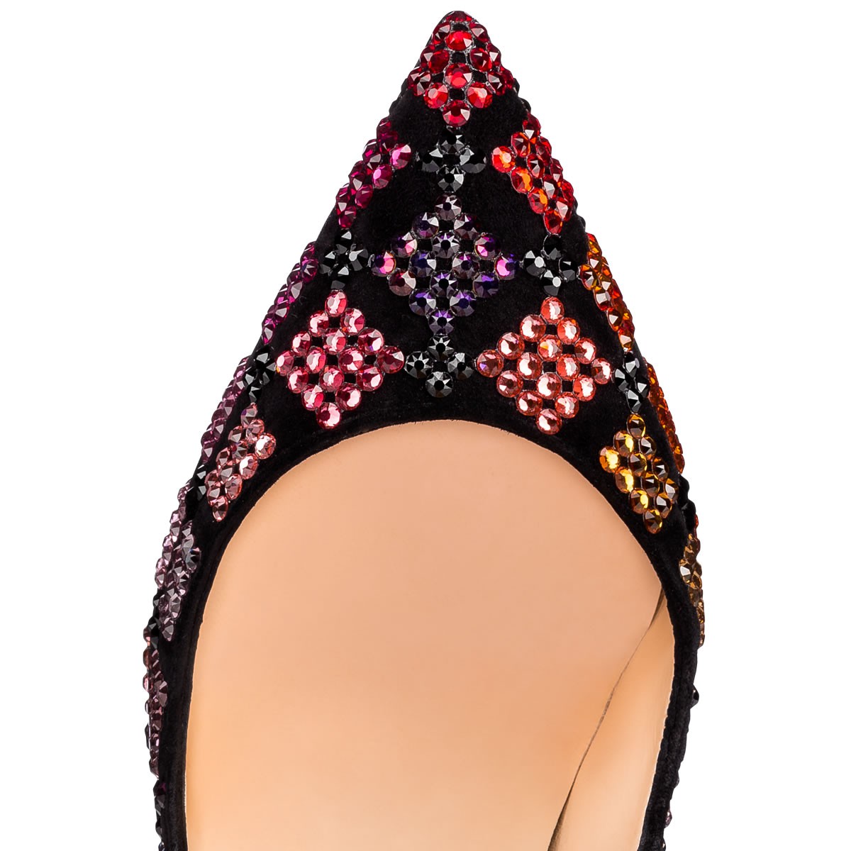 “Arletta” takes inspiration for its exquisite crystal pattern from the traditional commedia dell’arte harlequin. Embellished in an irresistible array of hand-placed Swarovski crystals over a base of black suede, this 100mm pointed-toe court shoe is a Louboutin collectsor’s item.