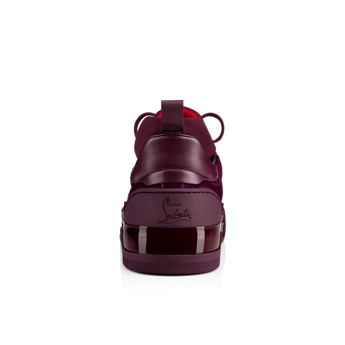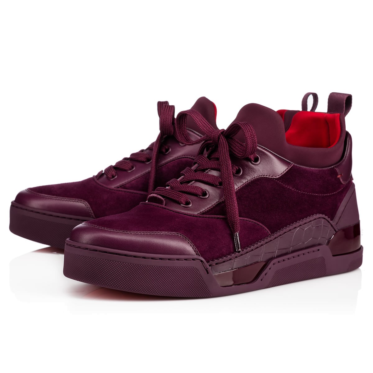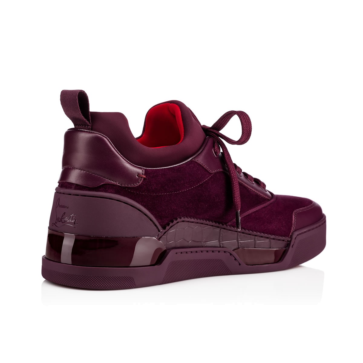 “Aurelien Flat” takes the Louboutin lowtop in a new direction this season. Inspired by the ’90s classic basketball shoe, this mixed-material style in tonal merlot, featuring an embossed crocodile print leather accent, is expertly crafted for style performance off the court.