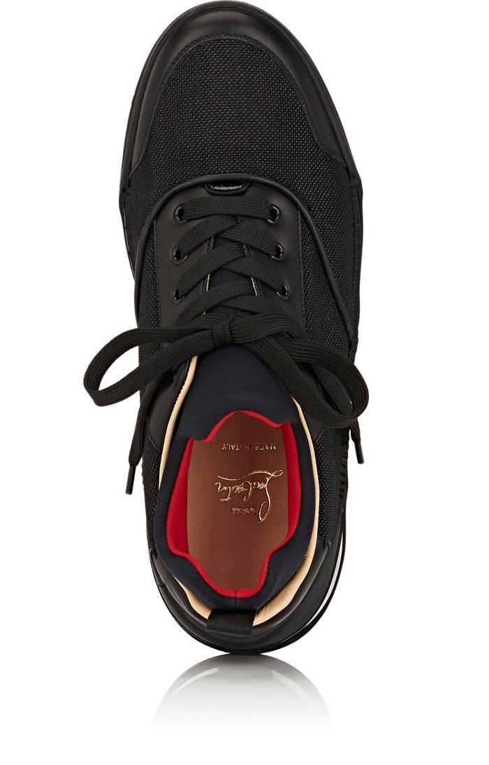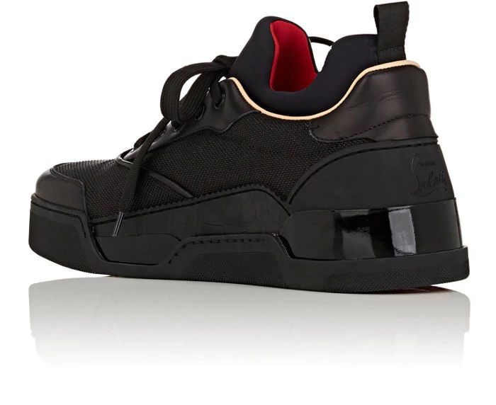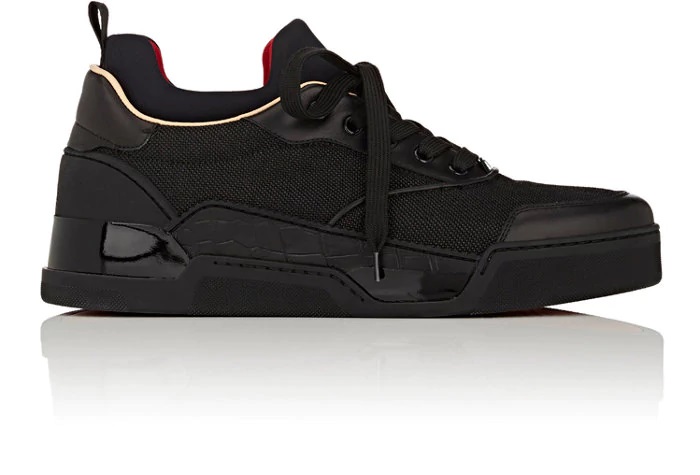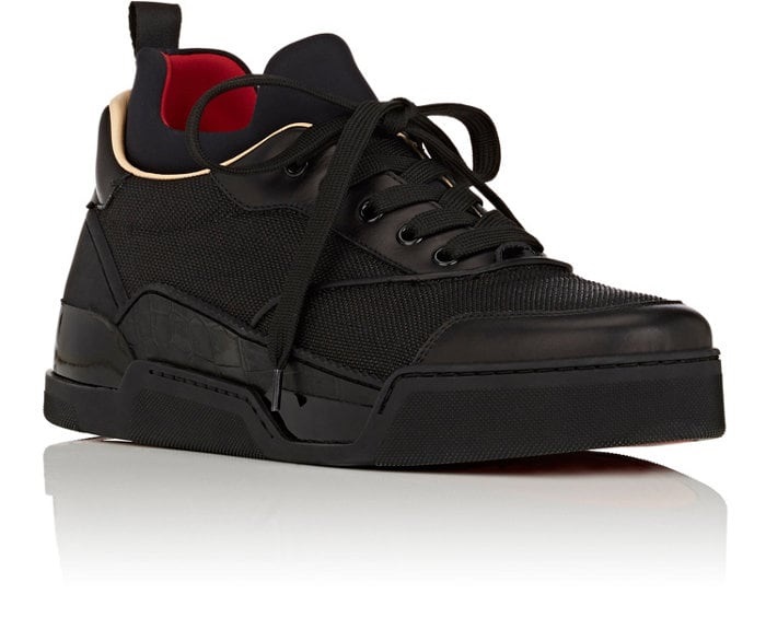 Designed with a neoprene sock liner, Christian Louboutin’s Aurelien Flat low-top sneakers are crafted in a mix of black textured-weave nylon, smooth leather, patent leather and croc-stamped rubber.