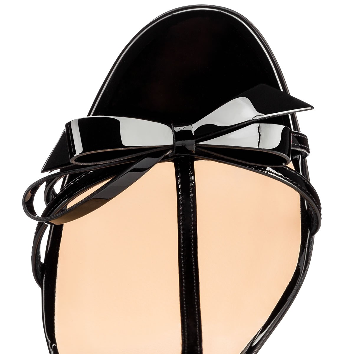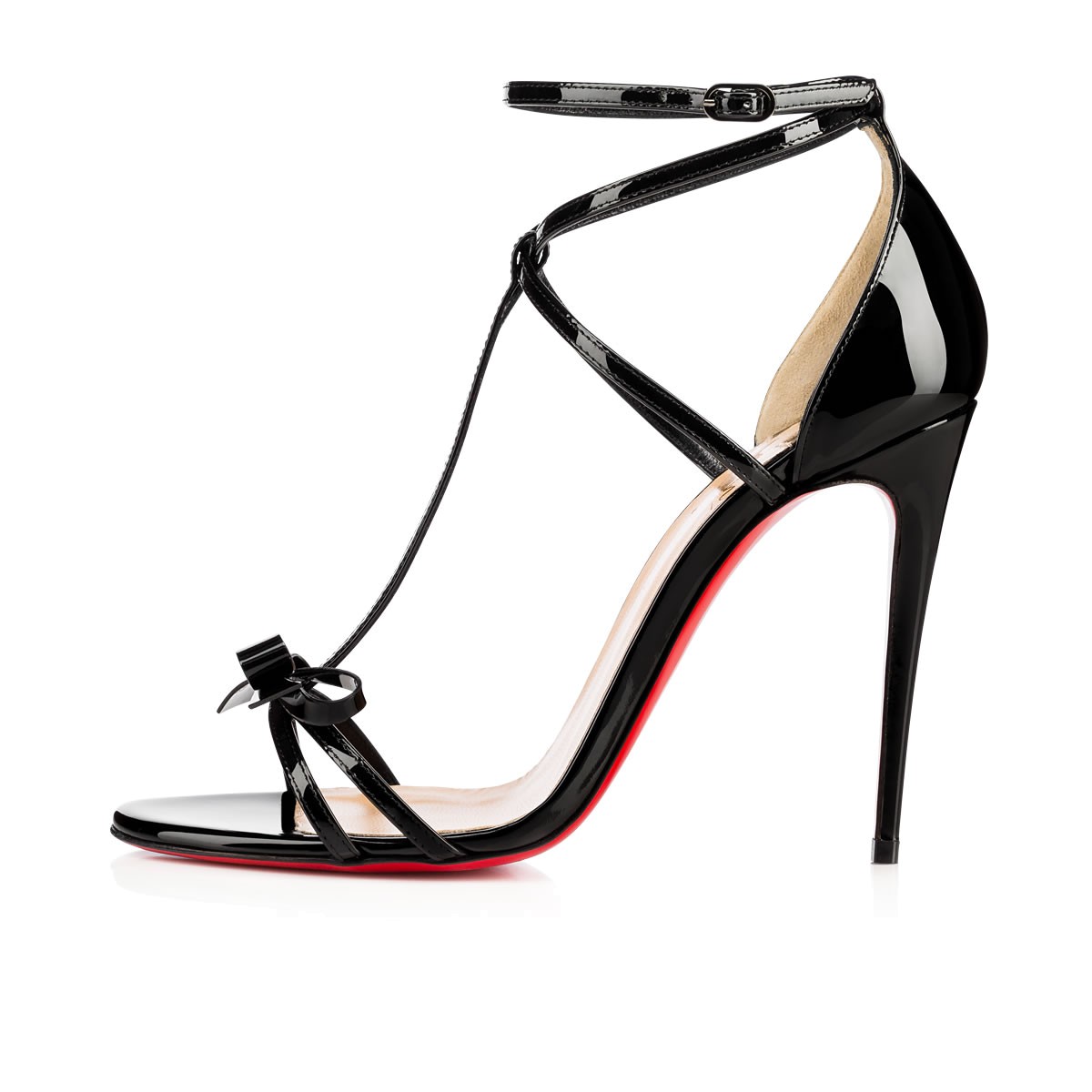 Named after Louboutin devotee Blake Lively, “Blakissima” is inspired by the star’s feminine glamor. Combining a sophisticated T-strap and wrap around ankle feature, this slender 100mm sandal in black patent is finished with a signature Louboutin bow.
