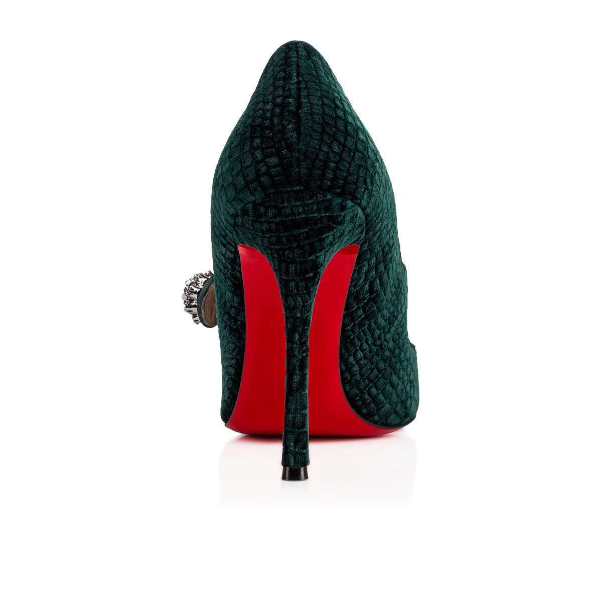 “Booton MJ” brings back the signature classic “Charleen” silhouette in a regal new look. Dressed in verde crocodile print embossed velvet, this ladylike Mary Jane is finished with a 100mm fetish heel and a gorgeous flower shaped crystal button.