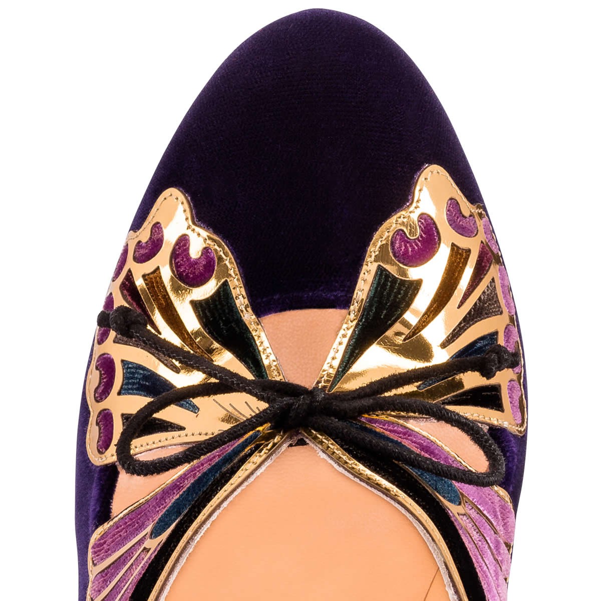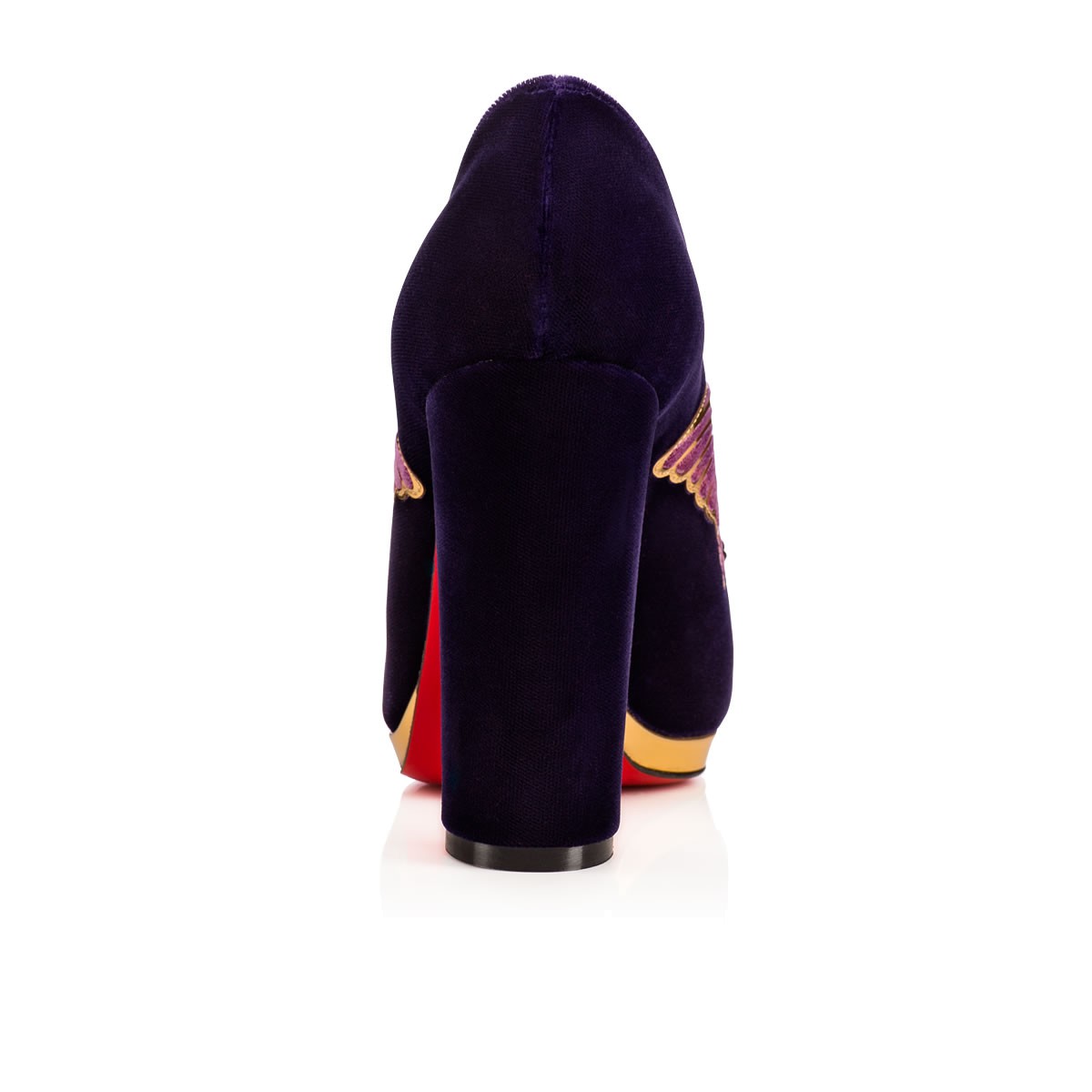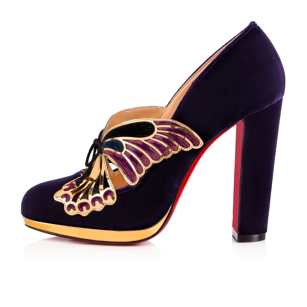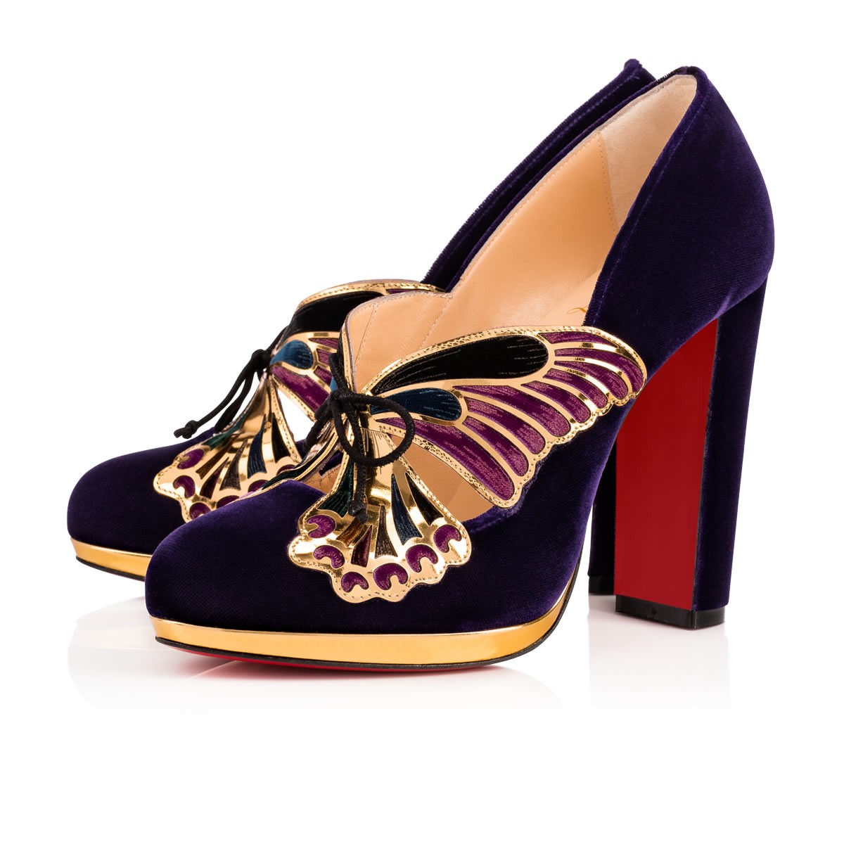 “Barboleta” is one of Christian Louboutin’s favorite styles in the Fall/Winter ’17 collectsion. Adorned in a divine butterfly appliqué vamp feature that ties together with leather laces, this violet velvet pump stands tall atop a 120mm block heel and slender specchio leather platform.