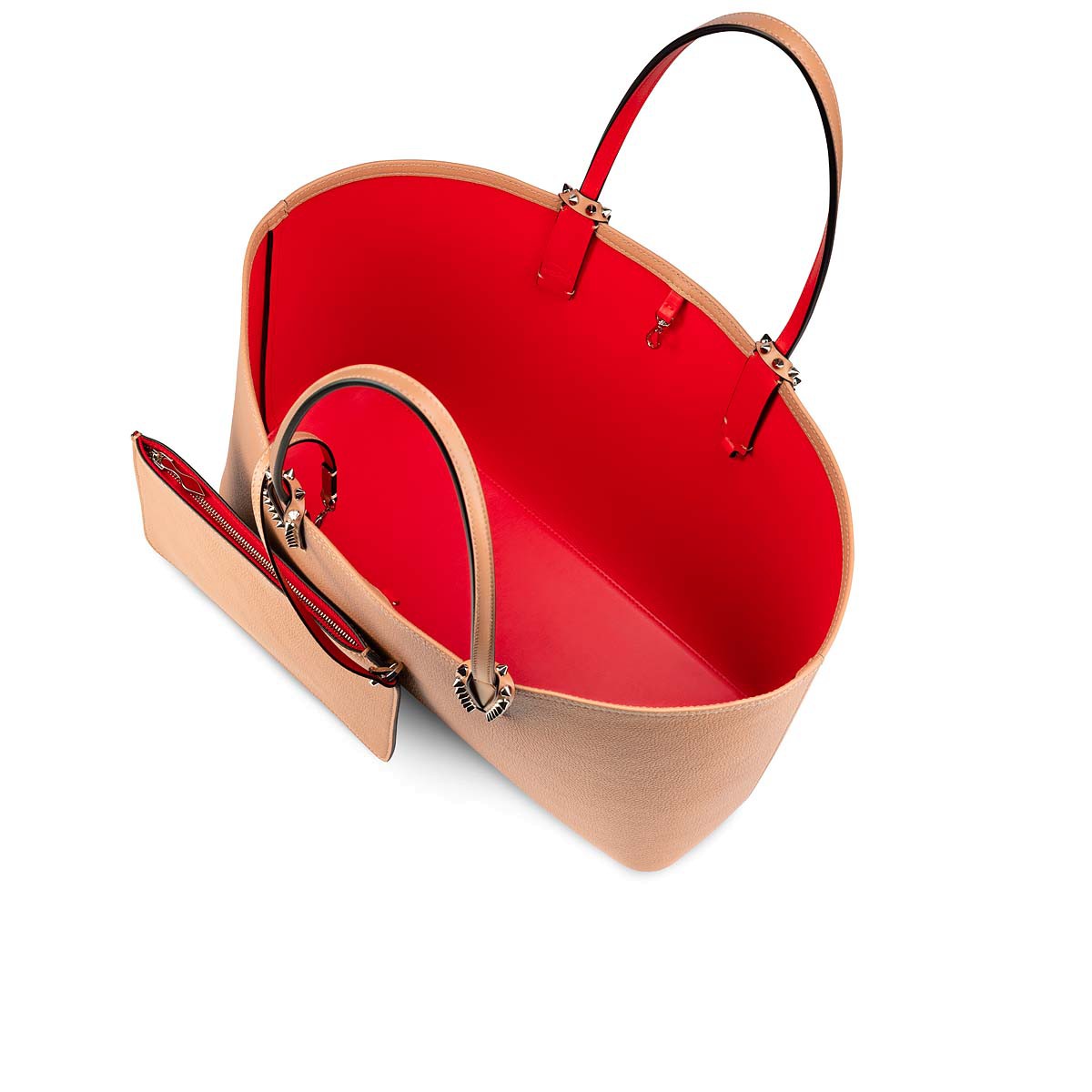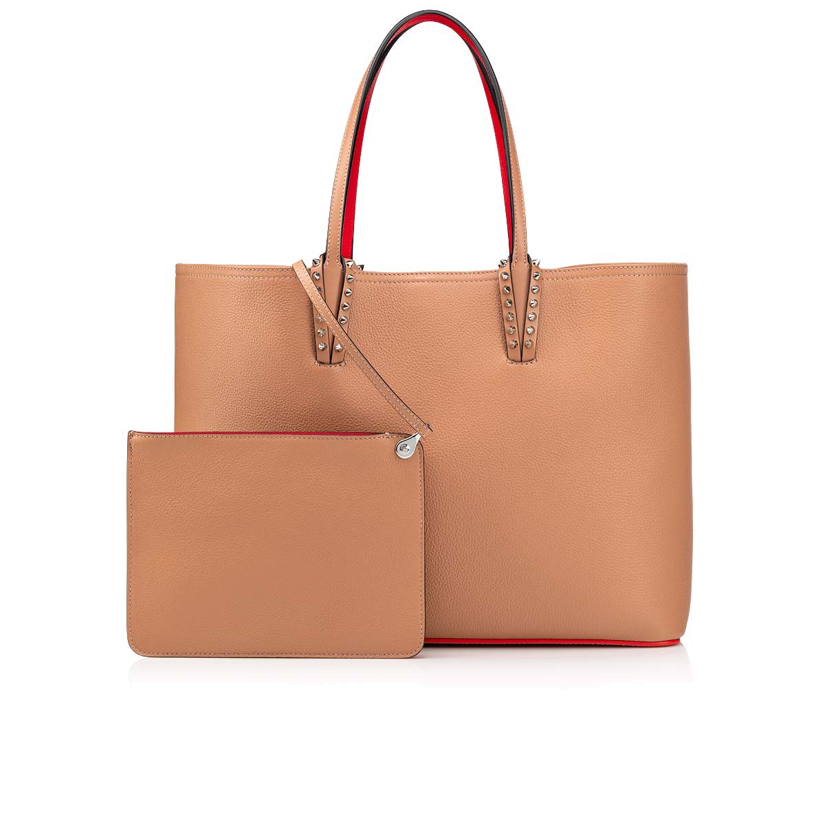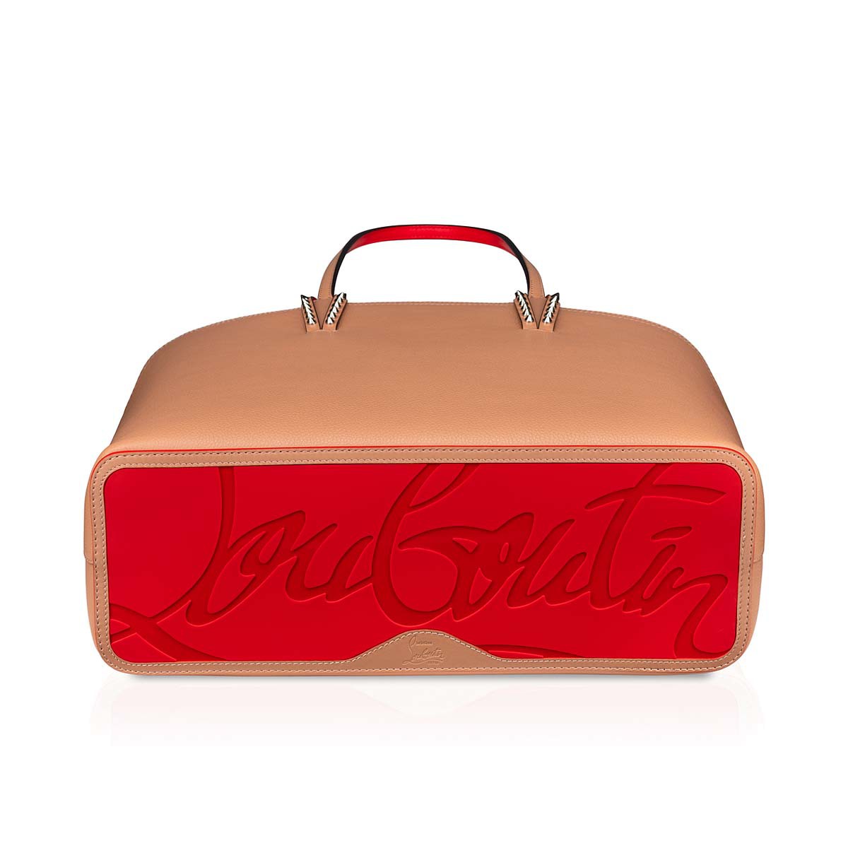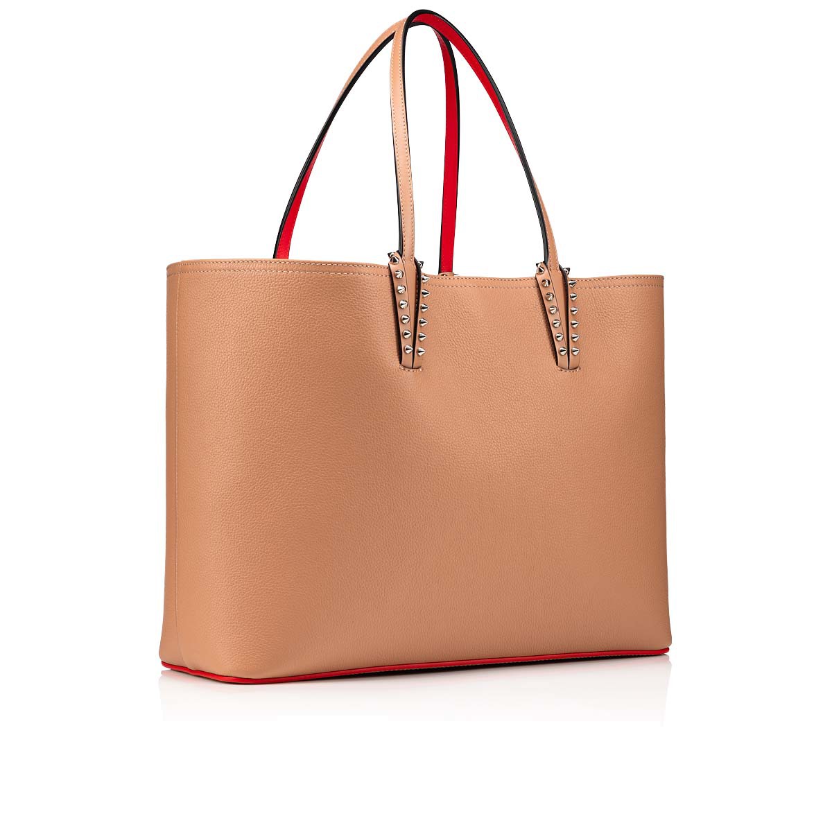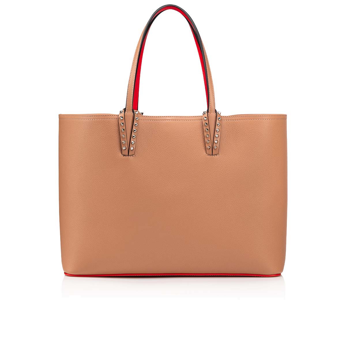 A Maison Christian Louboutin icon, the Cabata tote has a spacious, light design, and timeless appeal. The clean lines feature signature glossy spikes adorning the bottom of the handles and a signature red sole and lining. This model in all-over Nude showcases Christian’s love of blending different textures. Smooth Calf-Paris meets textured Calf Empire on this gorgeously classic yet modern design.