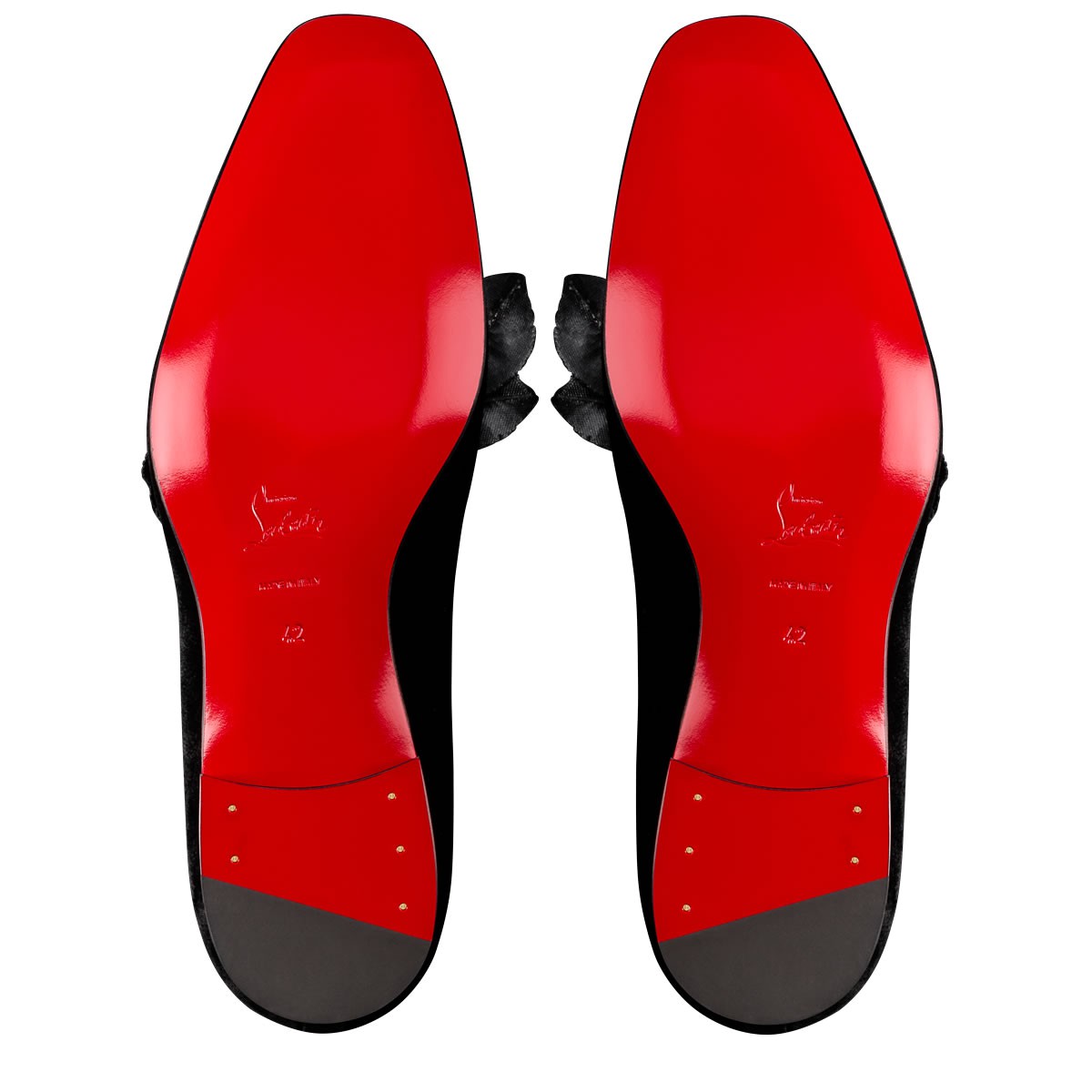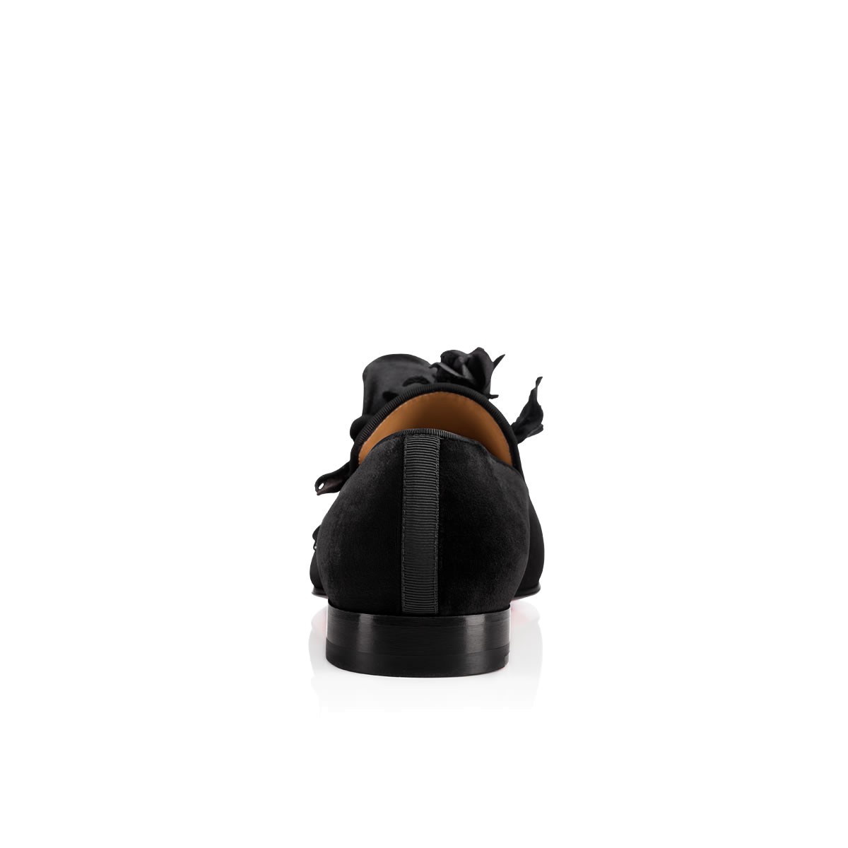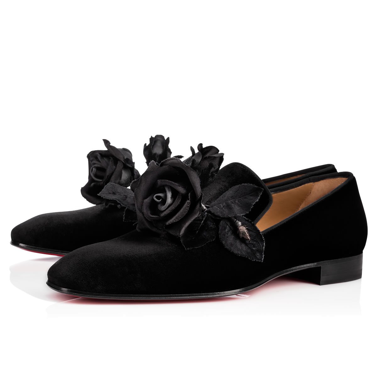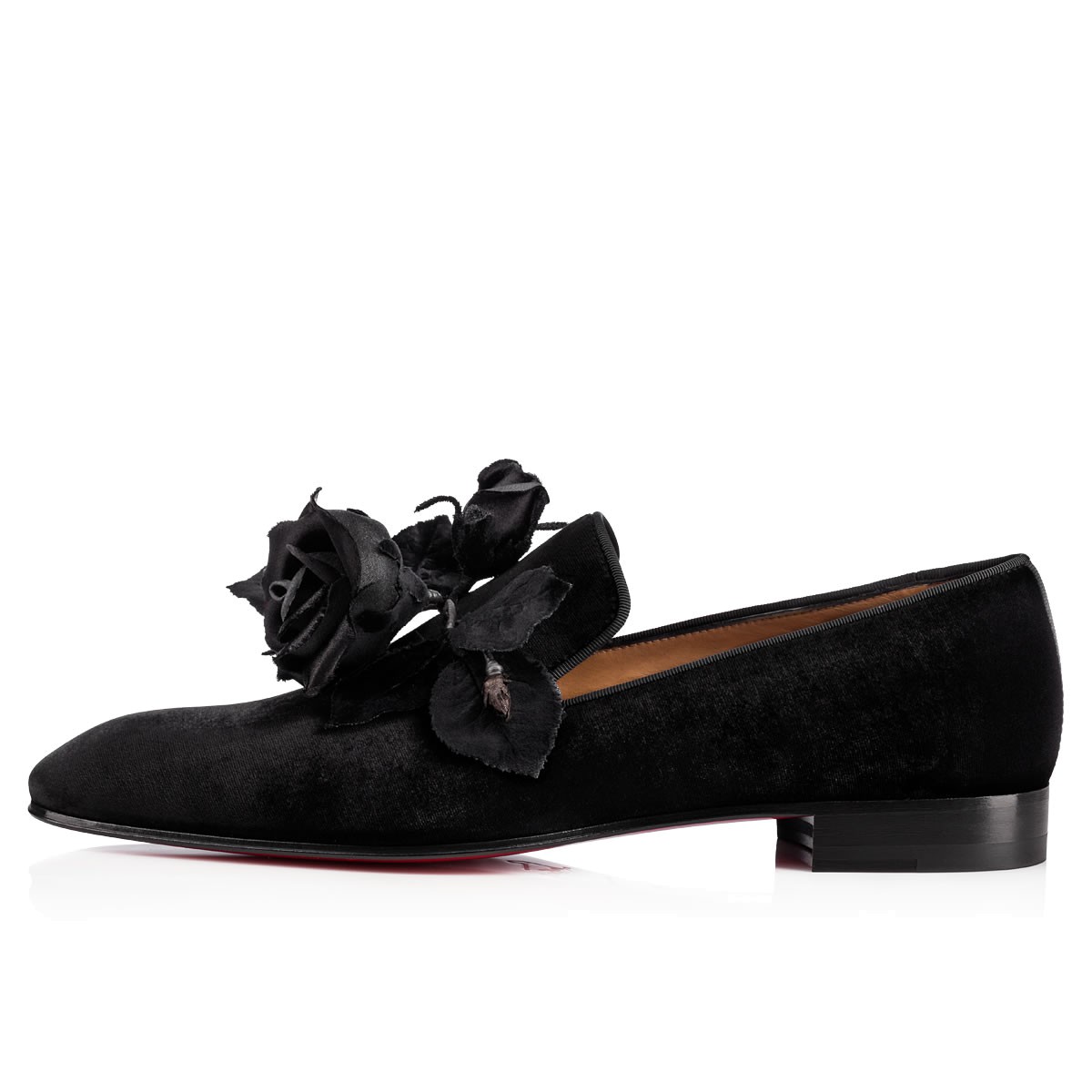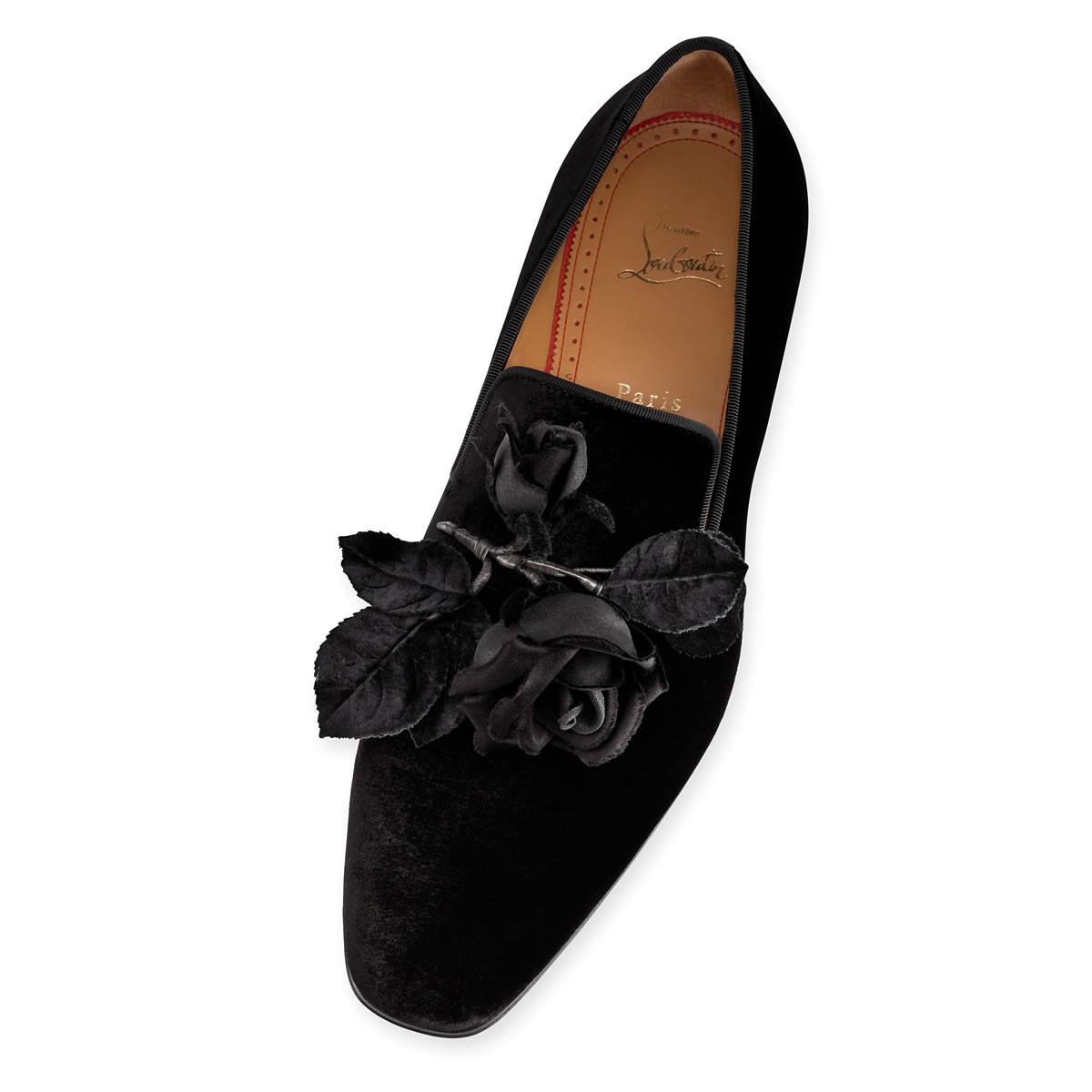 Named after the legendary 18th-century seductor, “Casano Flat” is an evening charmer. This black velvet smoking slipper is the signature classic “Dandy Flat”, adorned with a black satin rose hand-made by a Parisian studio that has been crafting the very same life-like roses for its haute couture clients since the 1700’s. Stored in their Louboutin shoe box, the roses will keep their shape forever.