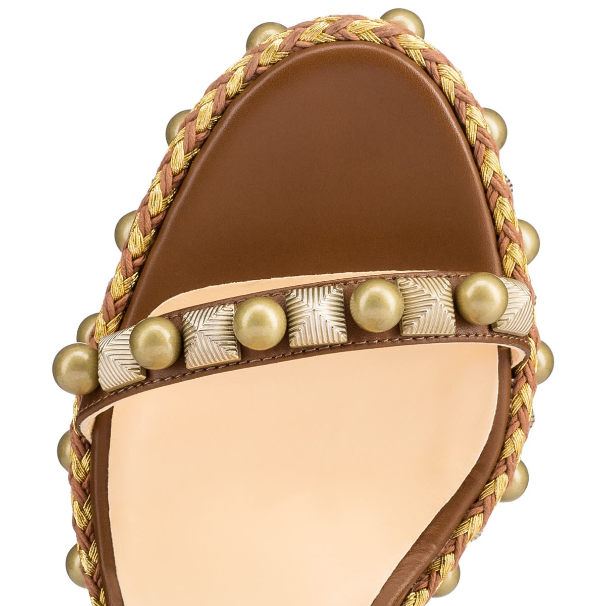 “Cataconico” is a Spring/Summer ’17 update on the classic beauty, “Cataclou”. The same 120mm sandal shape, this version is decorated in an alternating pattern of gold beads and striated pyramids with a braided wedge detail that adds a luxurious contrast to the rich indiana leather.