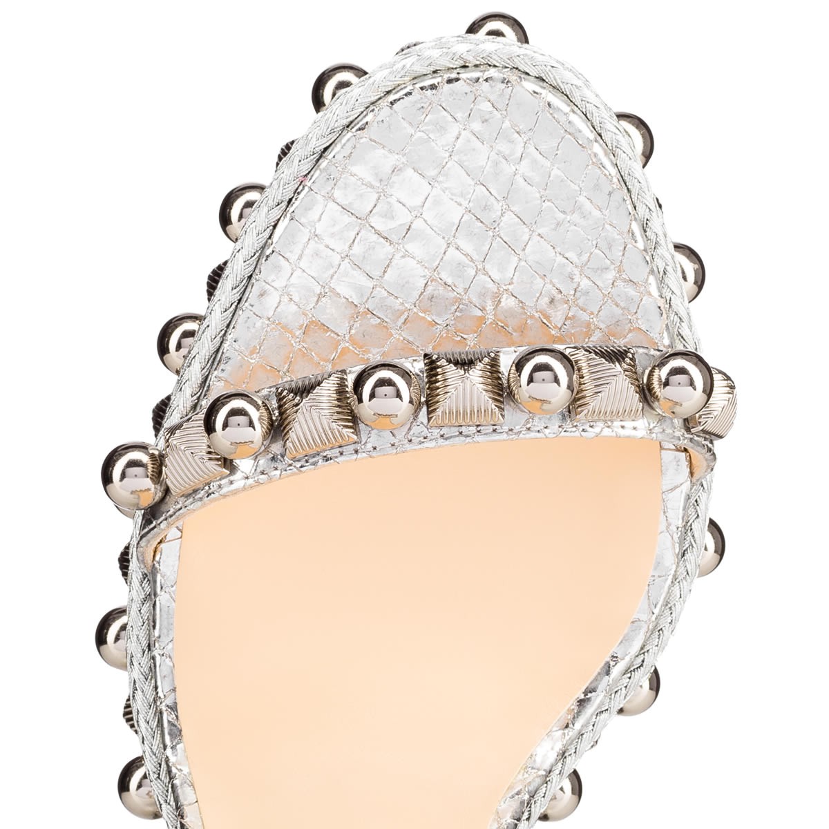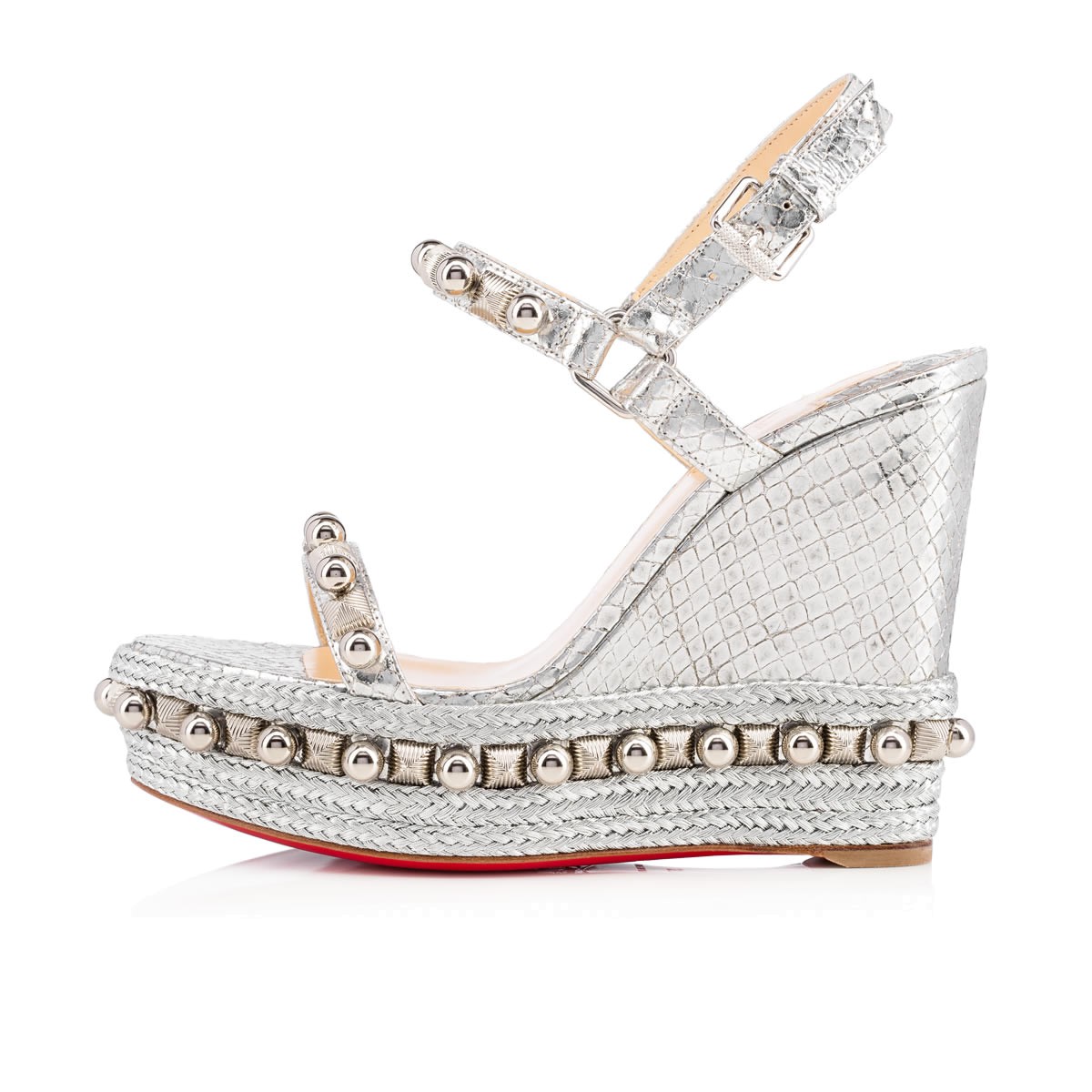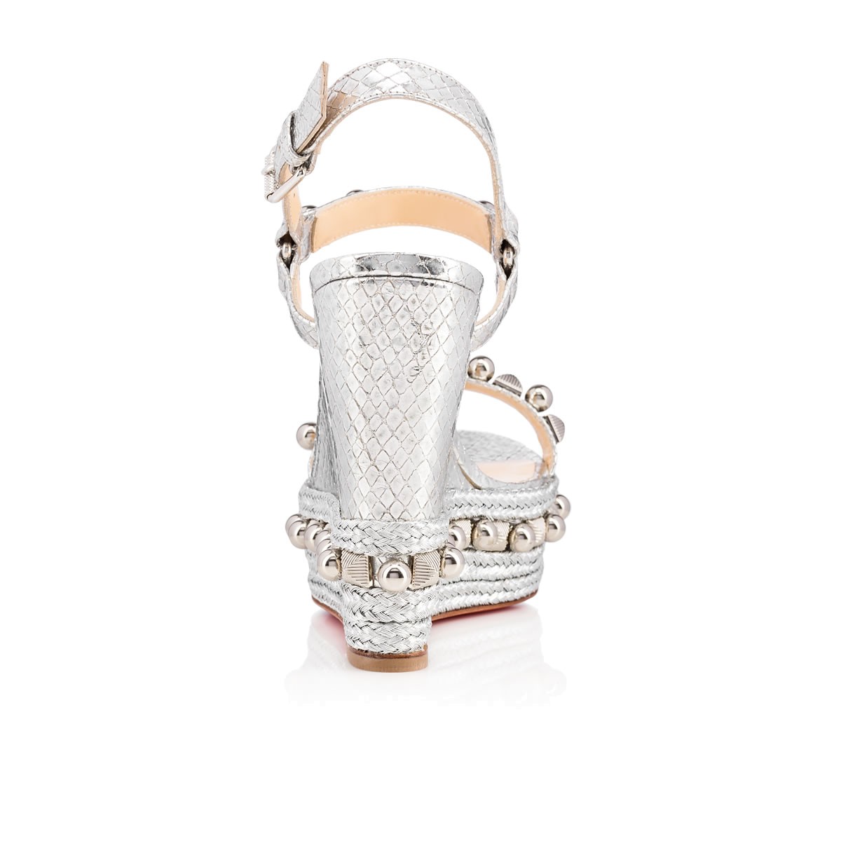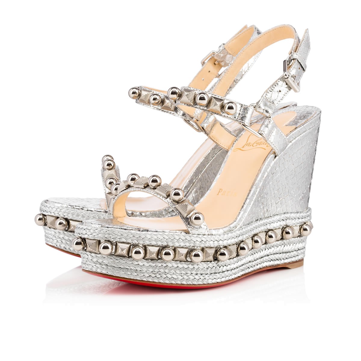 “Cataconico” is a Spring/Summer ’17 update on the classic beauty, “Cataclou”. The same 120mm sandal shape, this version is decorated in an alternating pattern of silver beads and striated pyramids with a braided wedge detail that complements the luminous lame sirene leather.