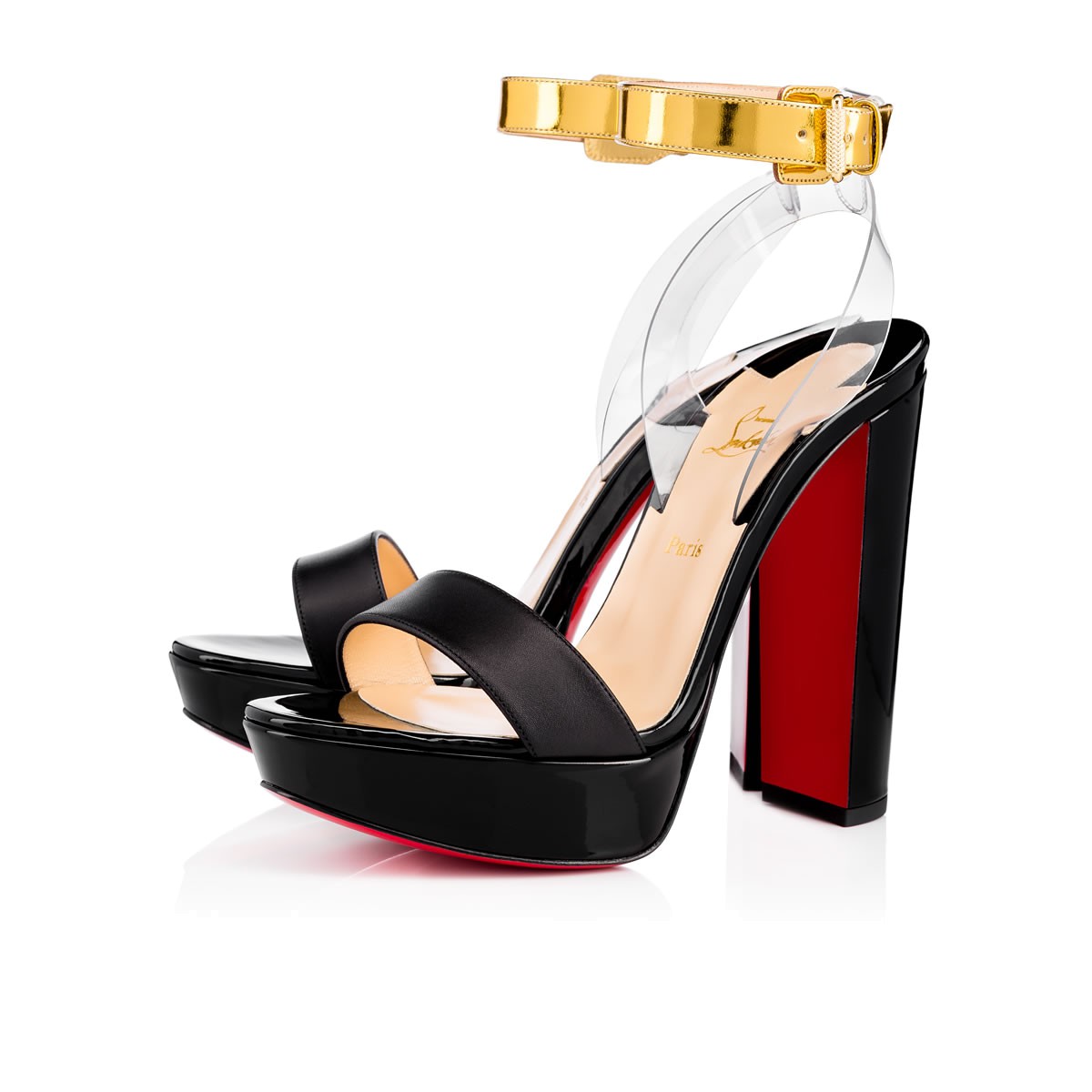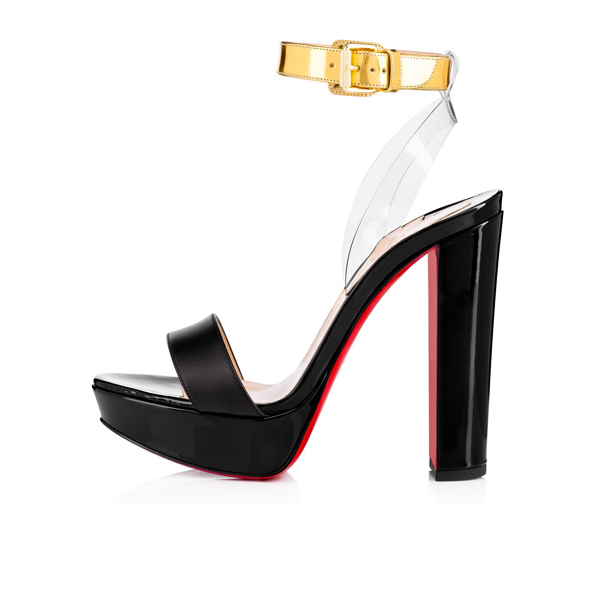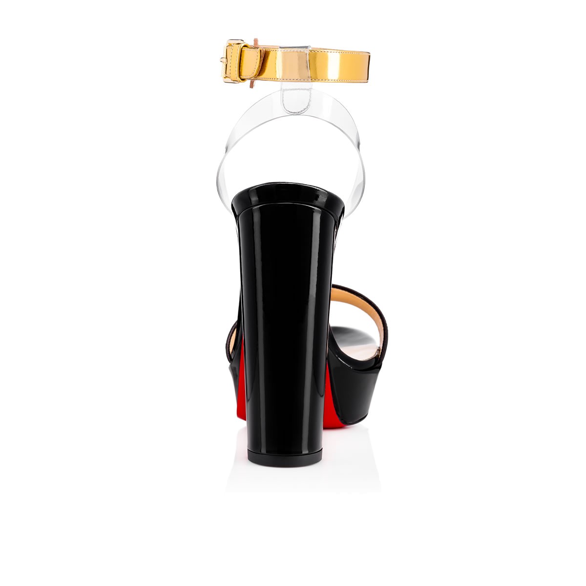 Rising sky-high, “Cherrysandal” dazzles with a hint of illusion. Featuring a transparent PVC slingback, this 140mm platform sandal in black is a minimalist silhouette with high impact.