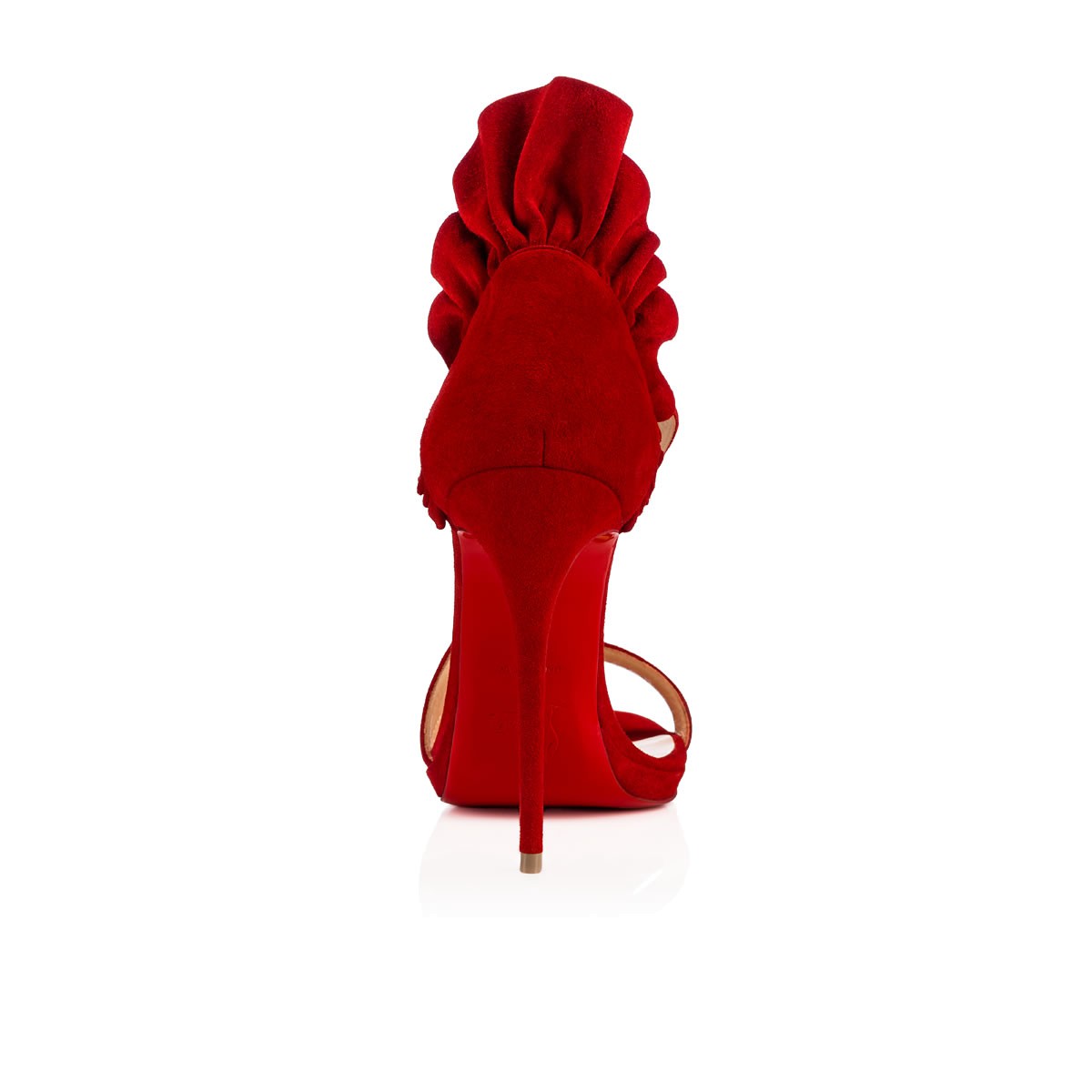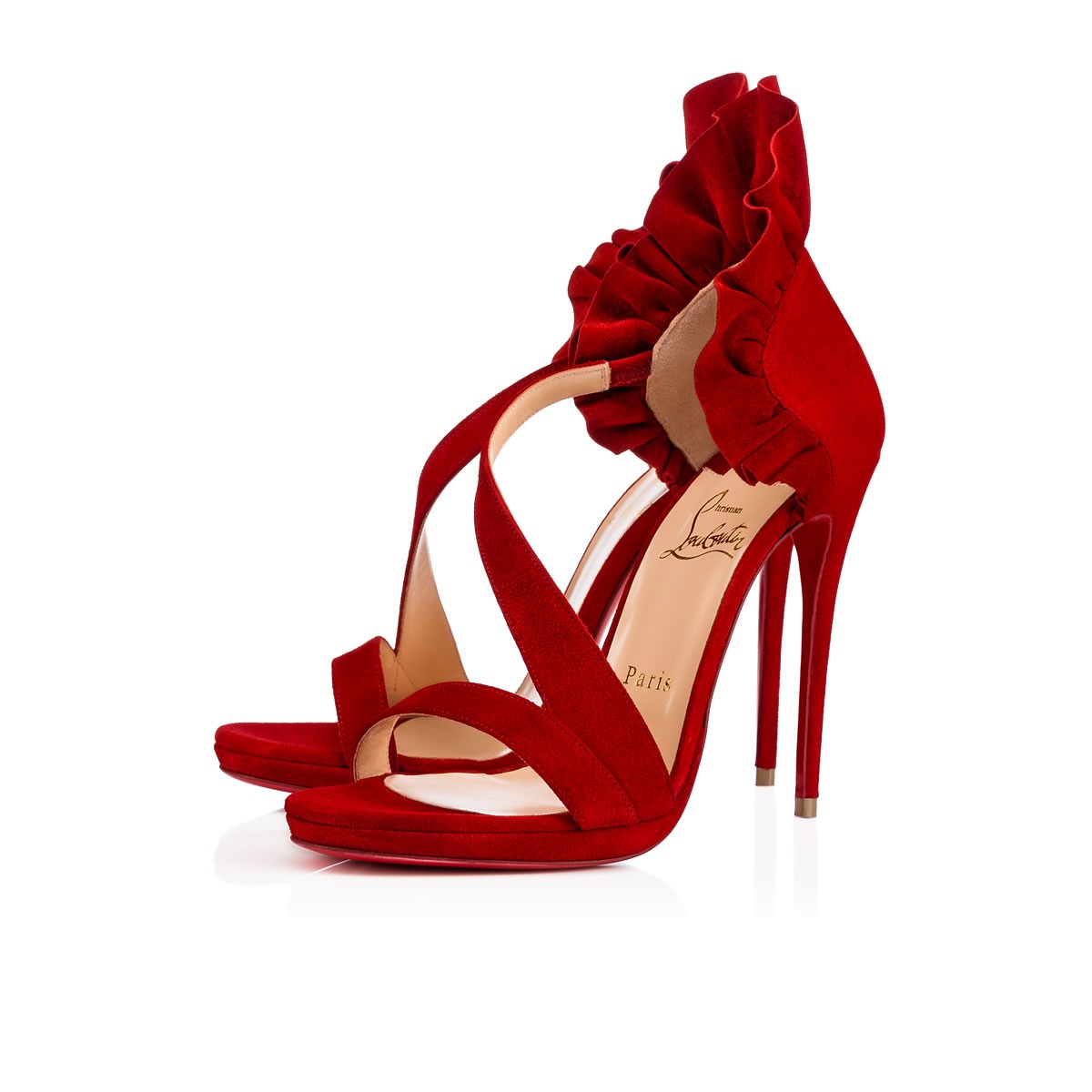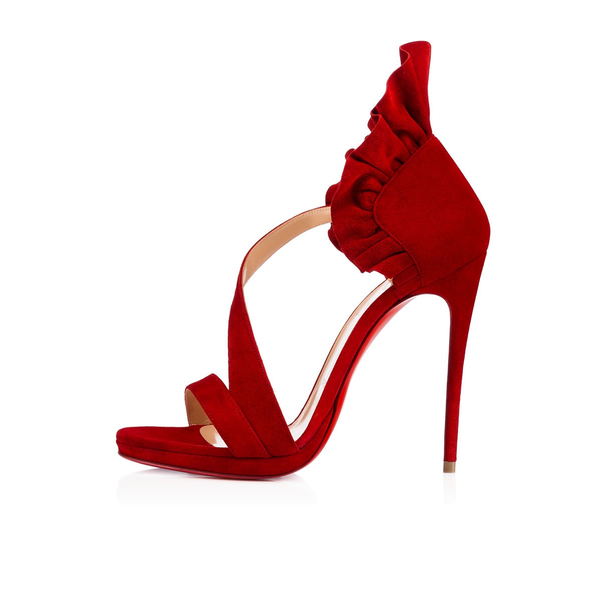 Add an elegant flair to your evening ensemble with “Colankle”. This asymmetric cross strap sandal in flamenco suede is exquisitely detailed with an elevated vamp heel that is like a ruffled collar for the ankle.