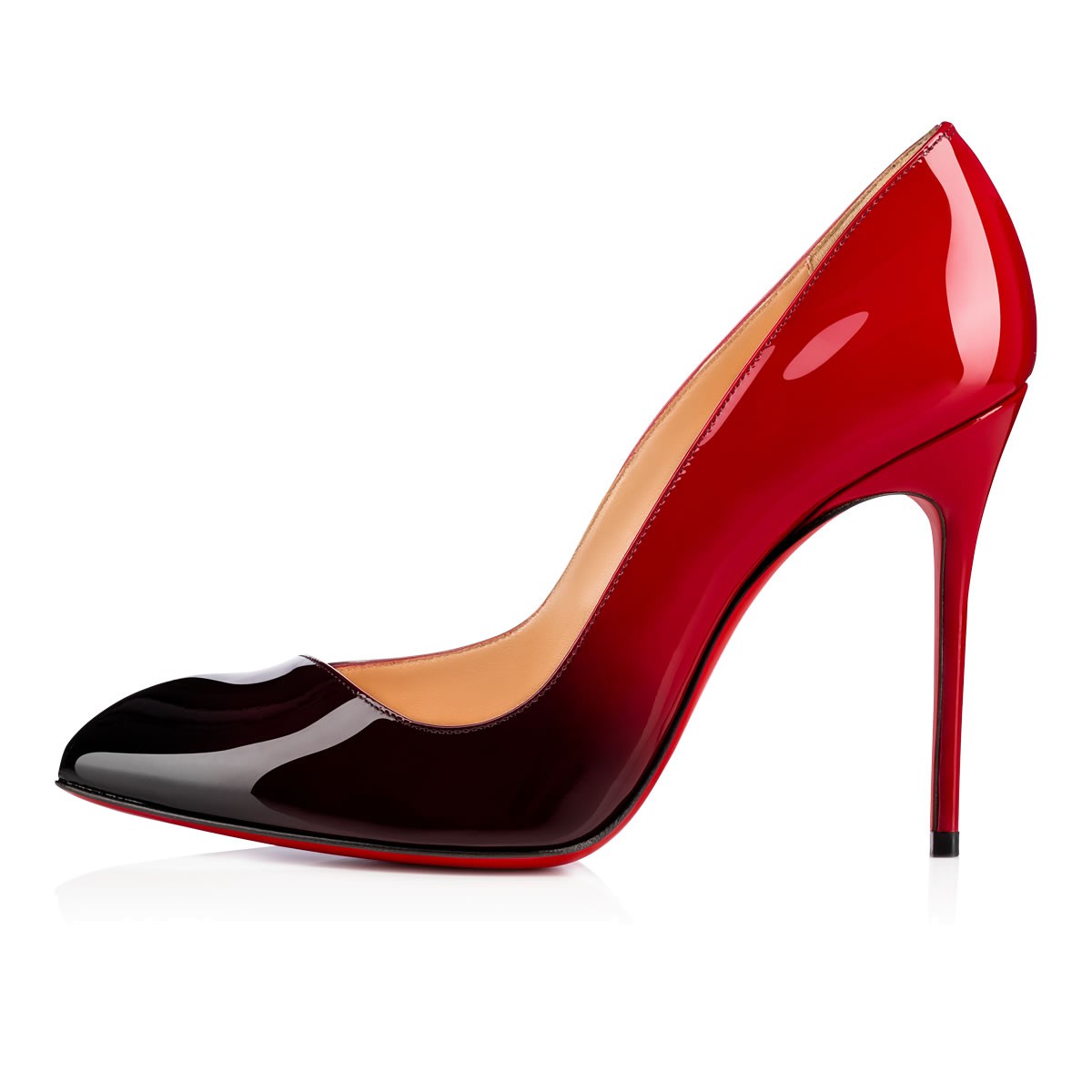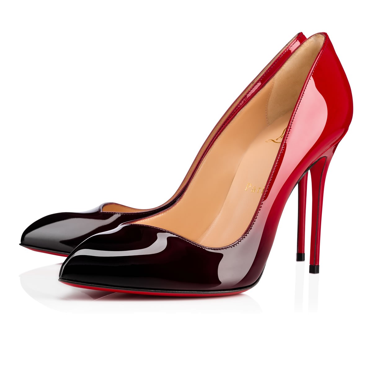 “Corneille’s” asymmetrical toe box is a sophisticated twist on the classic pointed-toe pump. In signature black-to-red dégradé patent leather, this timeless style is for the lady who speaks the language of luxury.