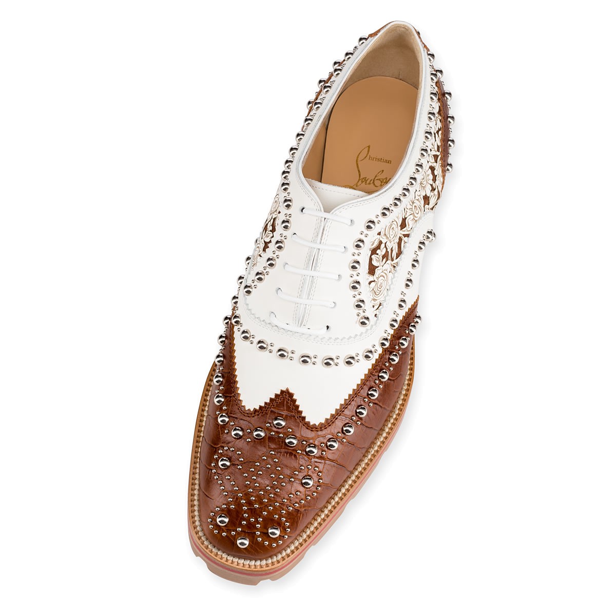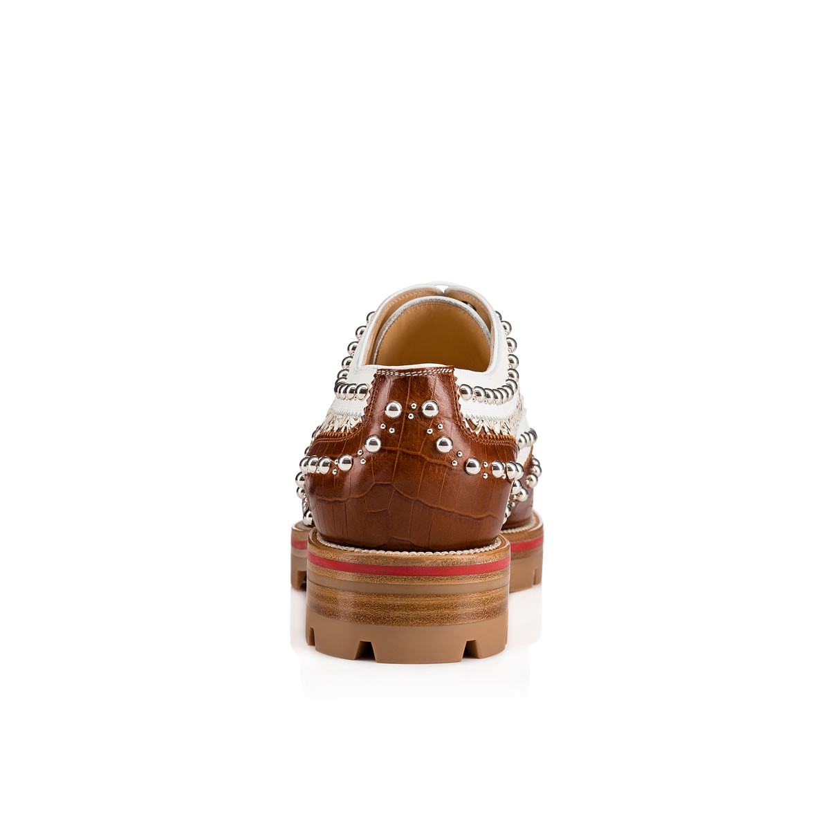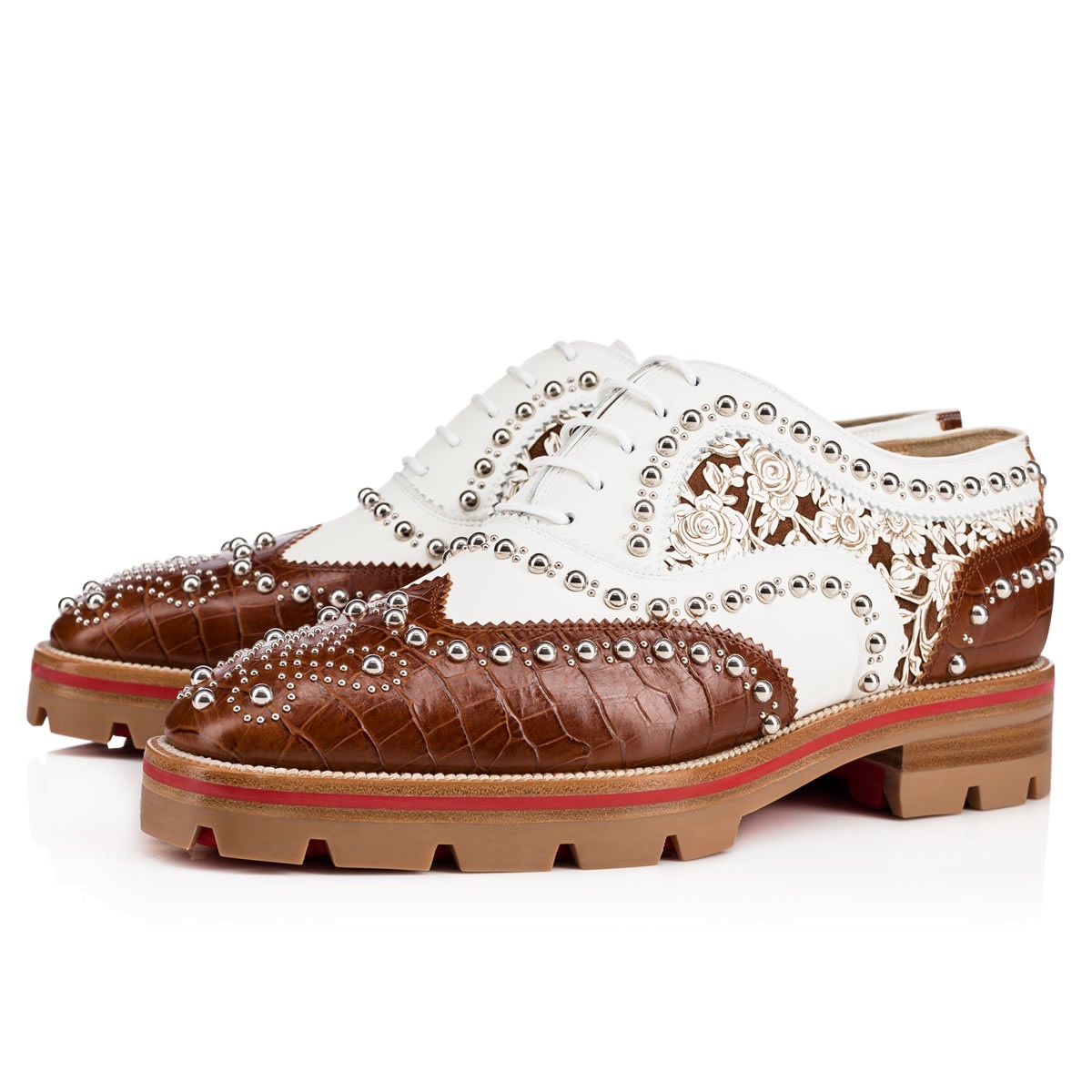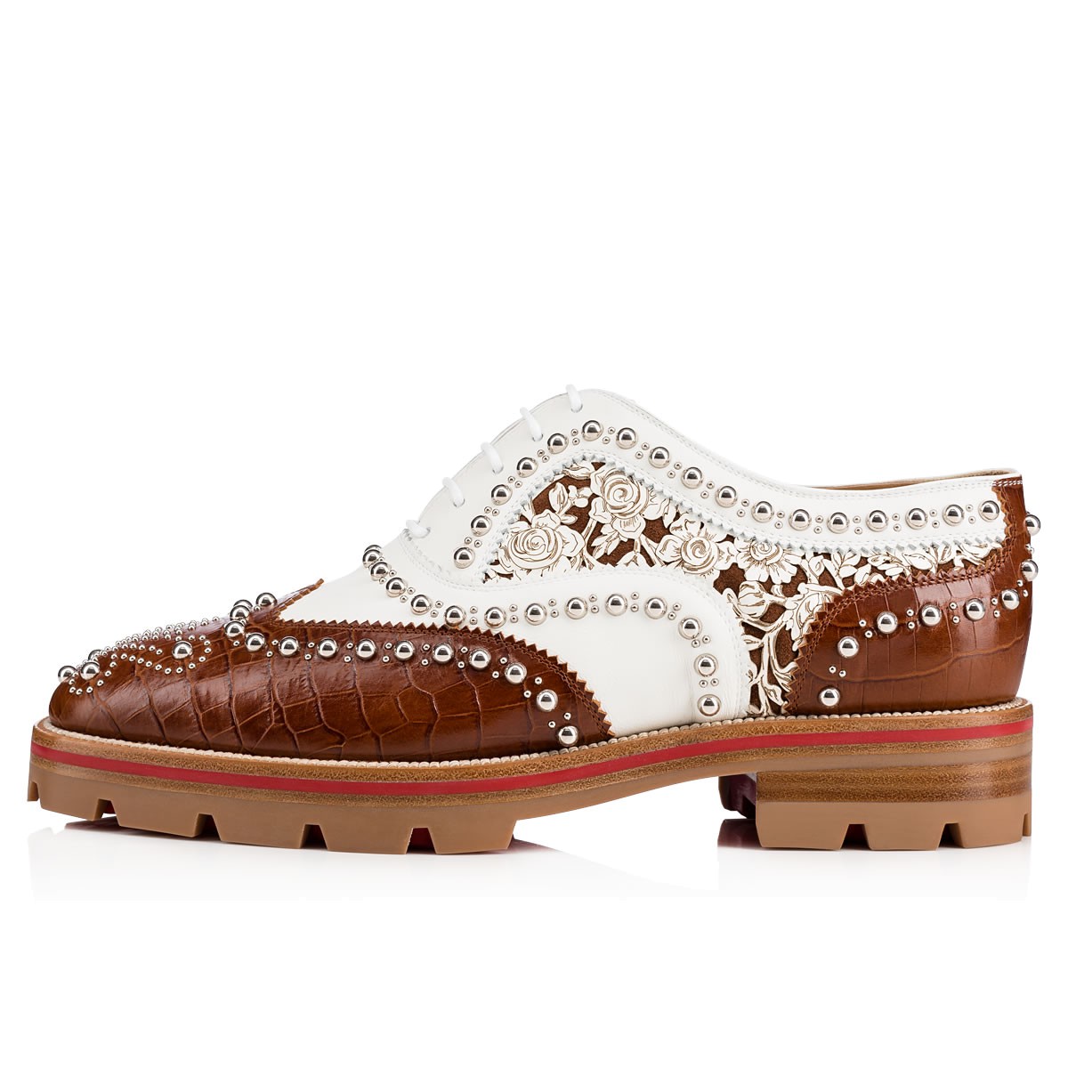 Blending a borrowed-from-the-boys shape with feminine detailing, “Crapadonna” is the ultimate garconne look. In cuoio crocodile embossed leather and latte ‘caballo laser’ floral leather detailing, this brogue studded oxford is finished with a matching white and Loubi red lined lug sole.