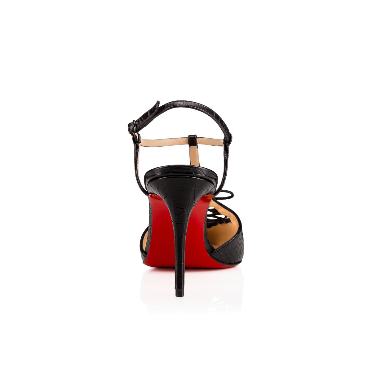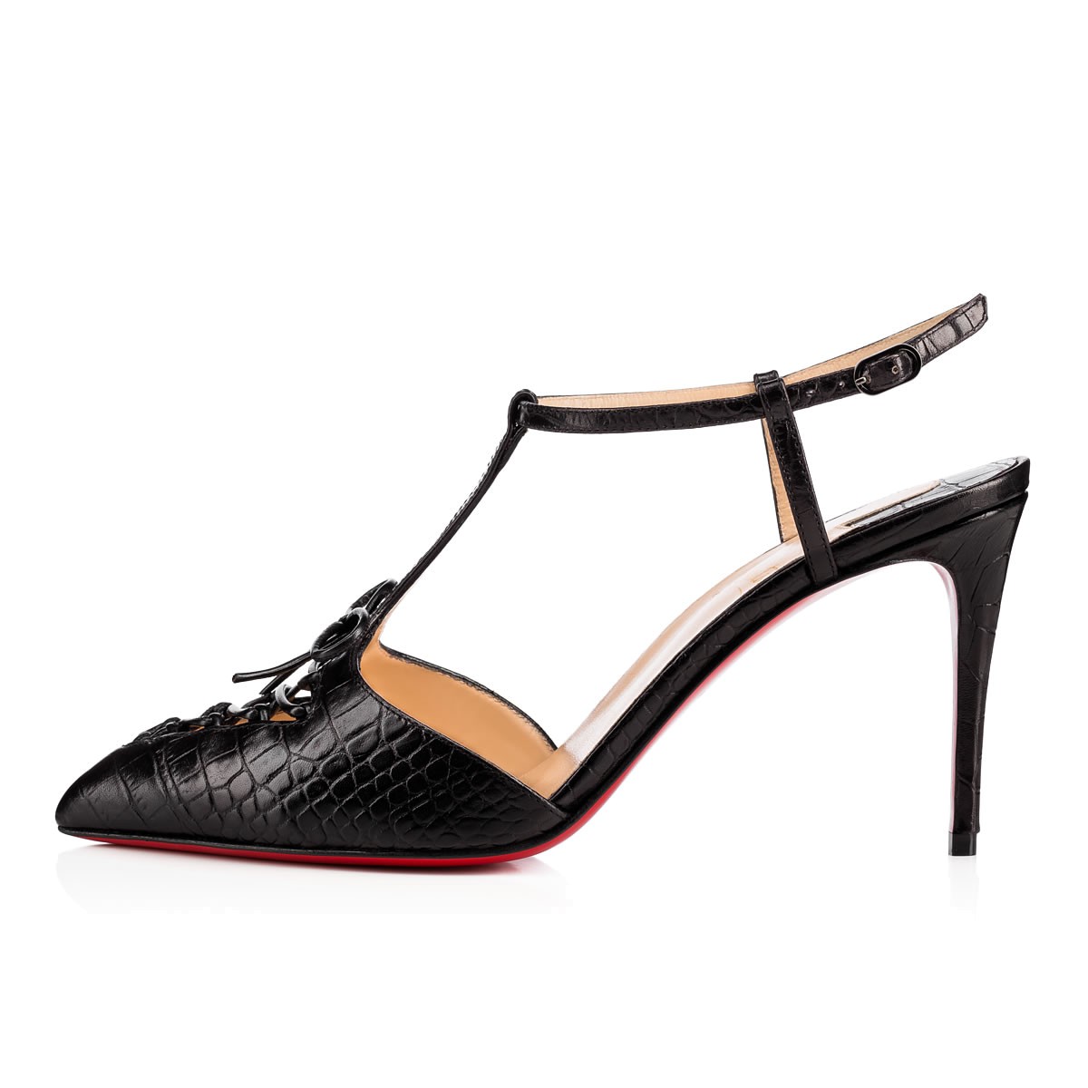 Embrace the look of luxury in “Crococuty”. This T-strap silhouette features a triangular cutout at the toe embellished by corset style lacing. In black crocodile embossed leather, it is finished with a chic 85mm heel.