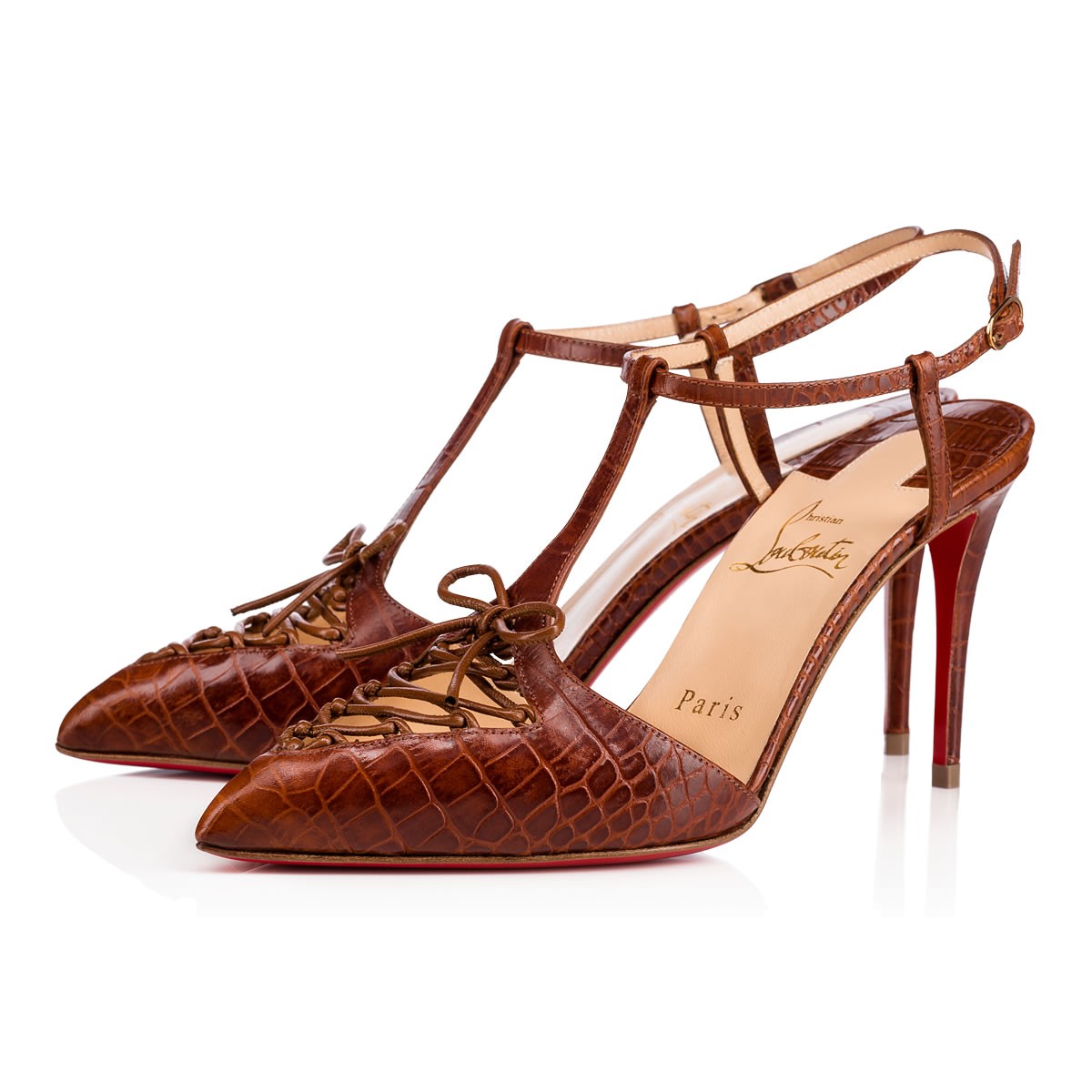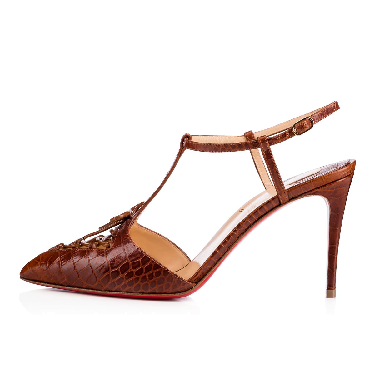 Embrace the look of luxury in “Crococuty”. This T-strap silhouette features a triangular cutout at the toe embellished by corset style lacing. In cuoio crocodile embossed leather, it is finished with a chic 85mm heel.