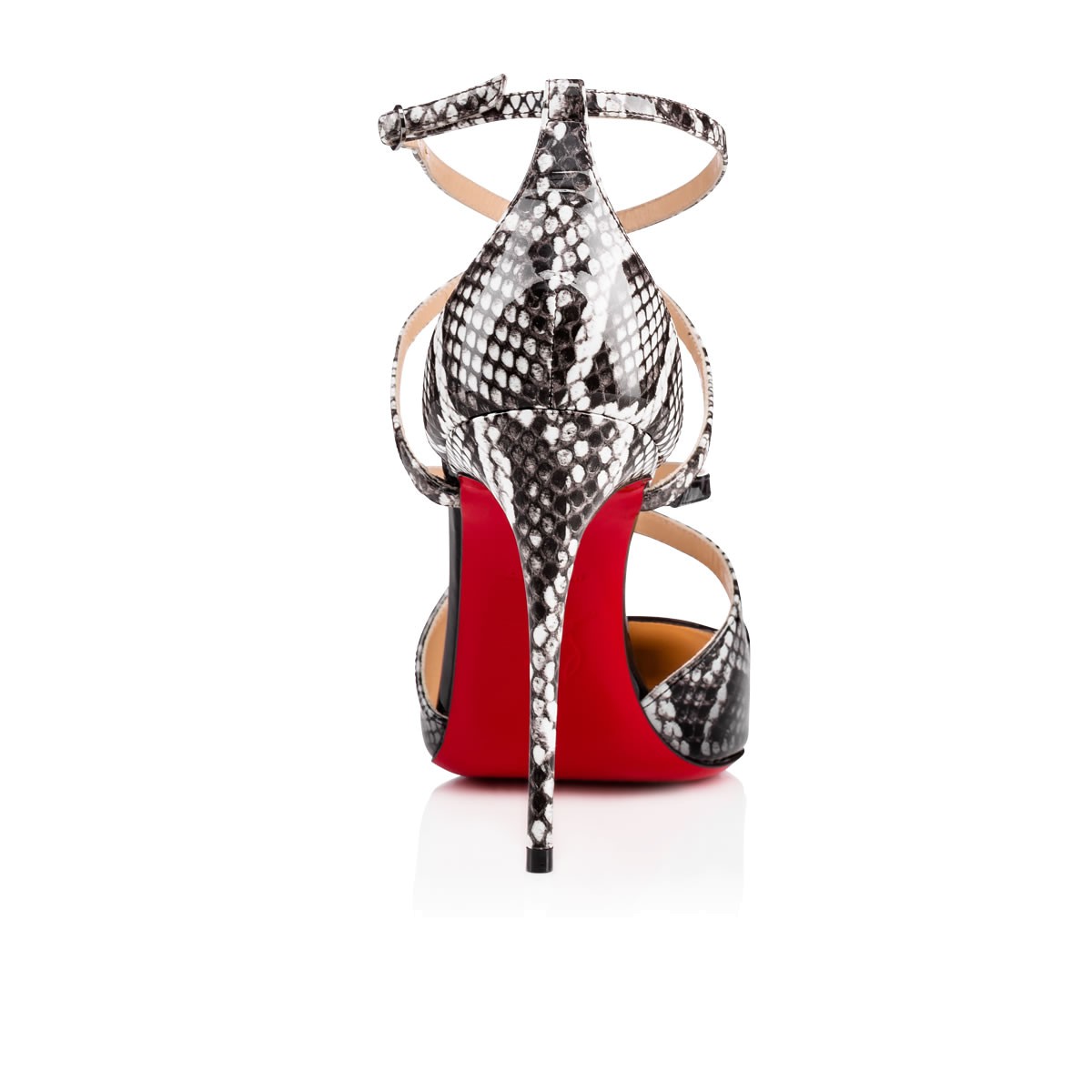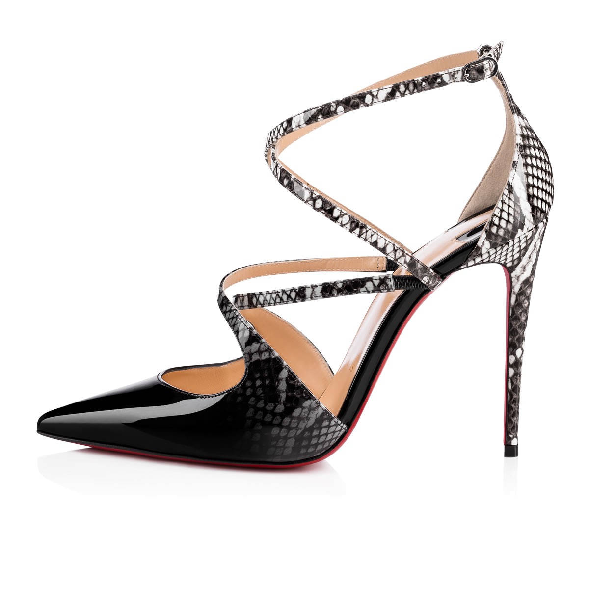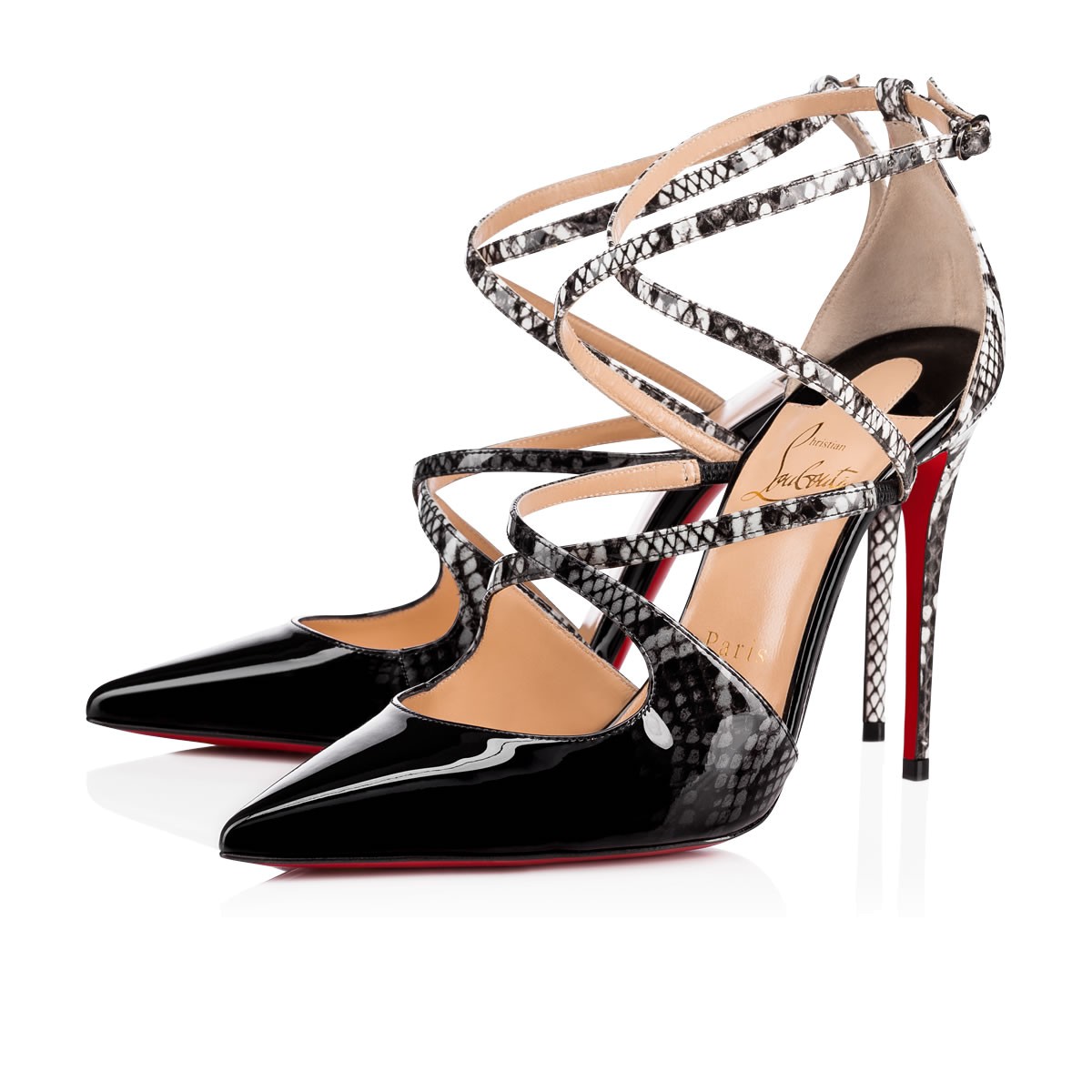 “Crossfliketa” is built on the signature classic “Decollete 554” silhouette, adding a double feature of slender cross straps that enwrap the foot in a most seductive manner. In black-to-roccia print dégradé patent leather, this 100mm pump is a ravishing staple piece.