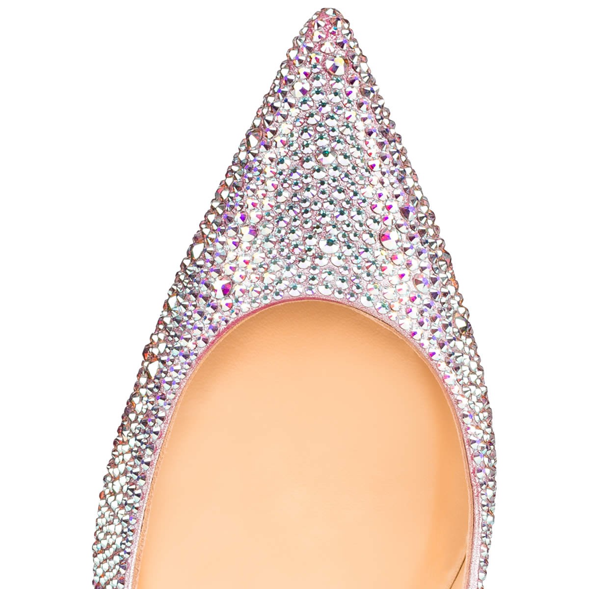 “Decollete 554” stands out for her long pointed toe and superfine stiletto heel. This sensational hand-placed aurora borealis crystal version infuses your evening looks with glistening glamor.
