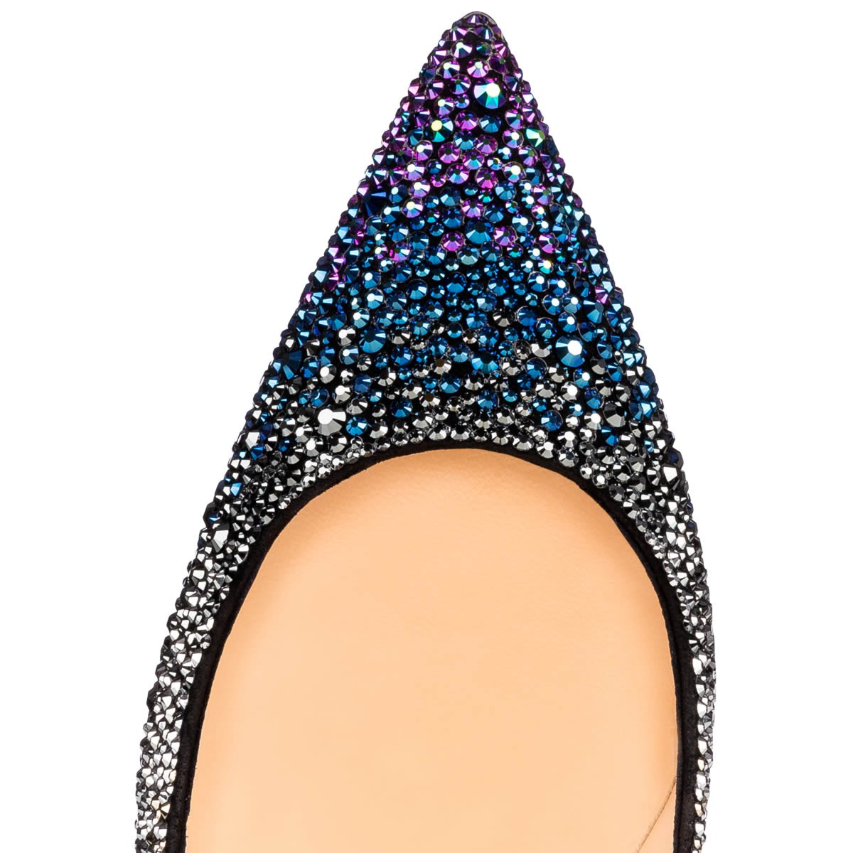 “Decollete 554” stands out for her long pointed toe and superfine stiletto heel. This sensational multicolored crystal gradient version infuses your evening looks with glistening glamor.