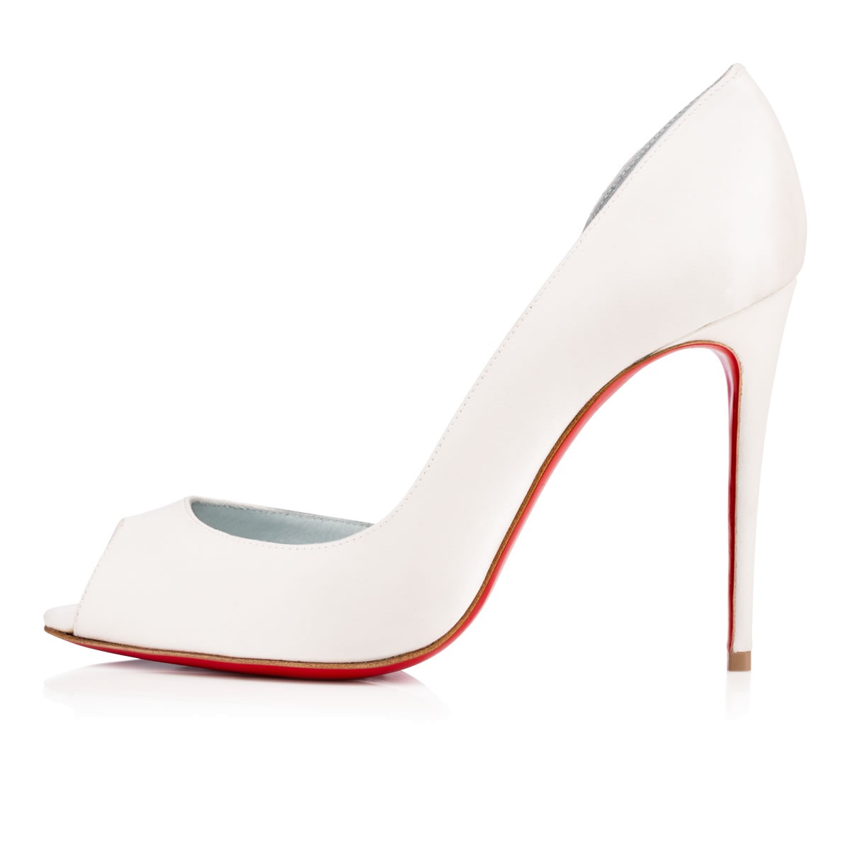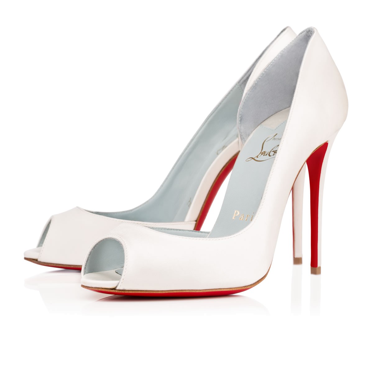 “Demi You’s” elegant half-d’Orsay, open toe silhouette is gorgeous for any season. This off-white crepe satin version is a soft and feminine look for a red sole wedding.