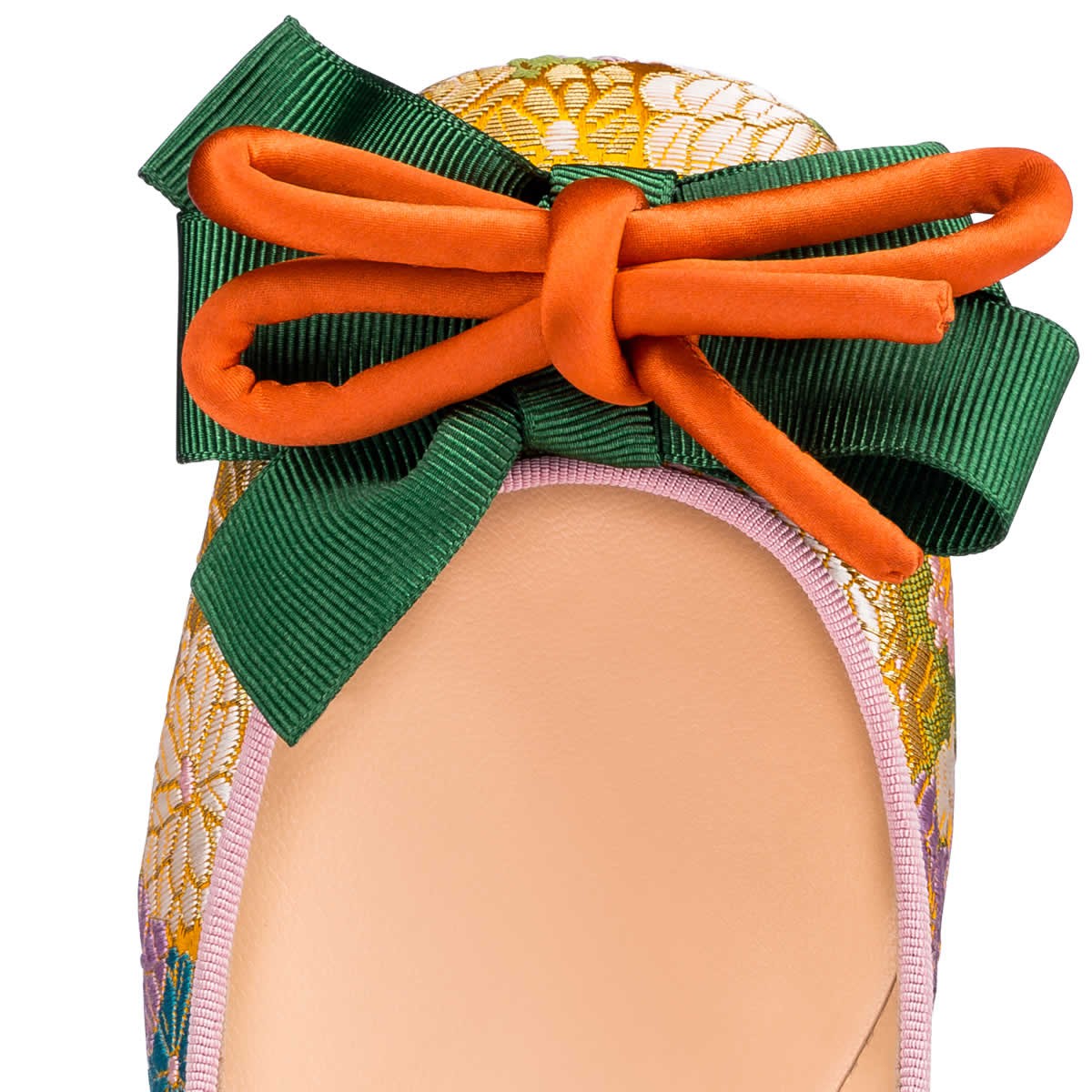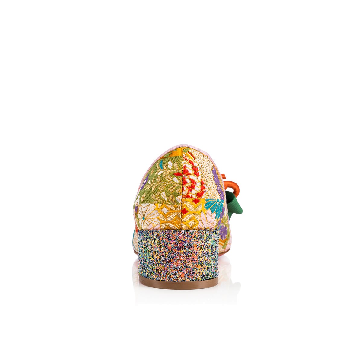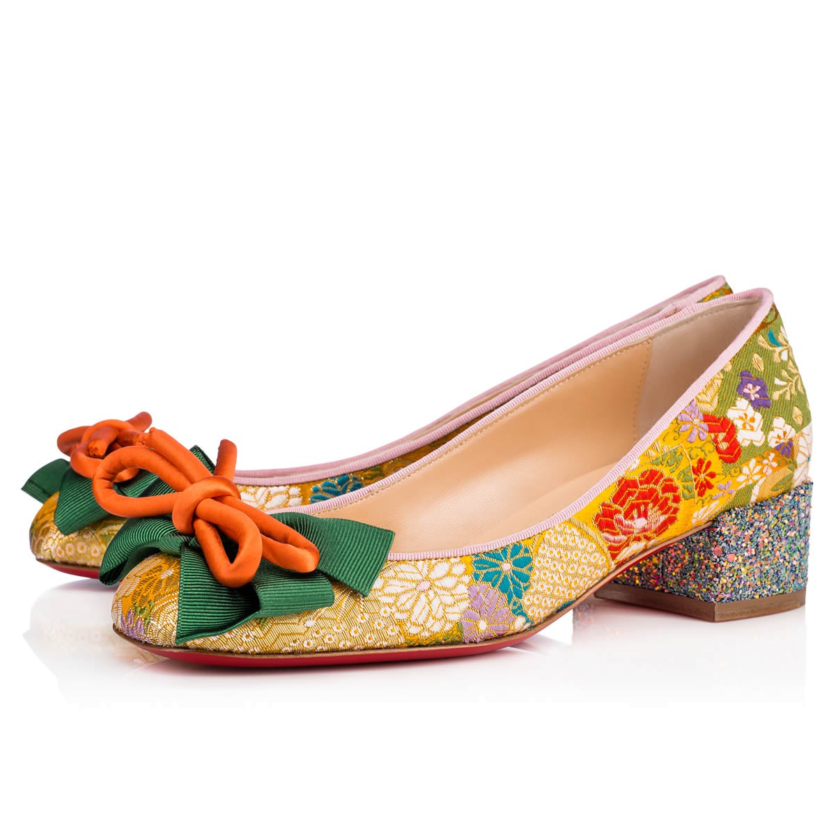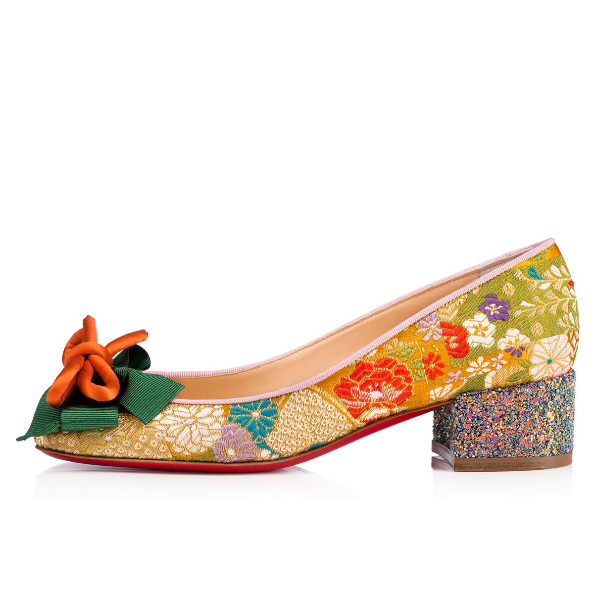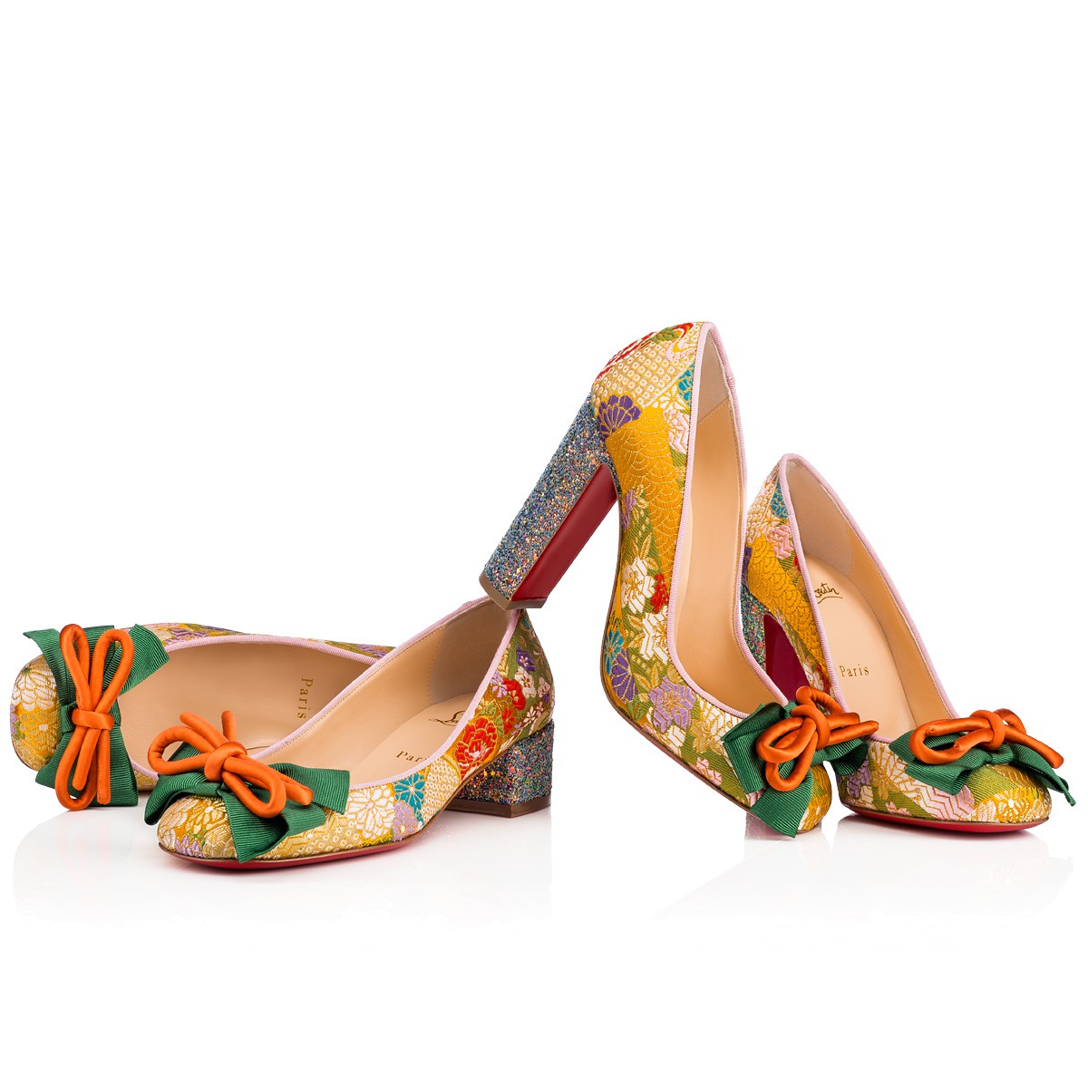 Christian Louboutin’s obsession with the Far East is evident in “Dolly Dola”. Her exotic floral print jacquard and kimono wrap inspired bow feature are very Madame Butterfly, while the 35mm dragonfly glitter heel is all Christian.