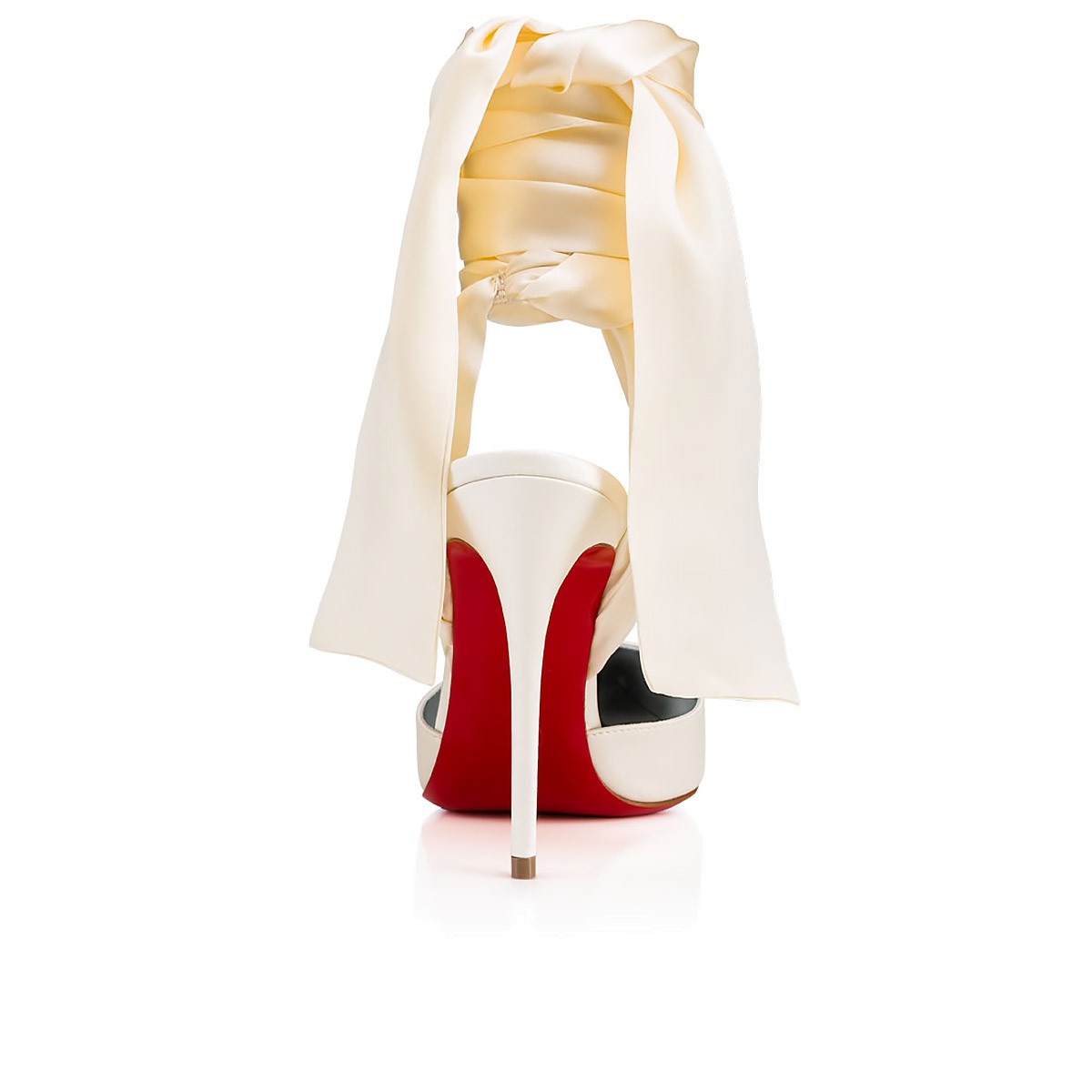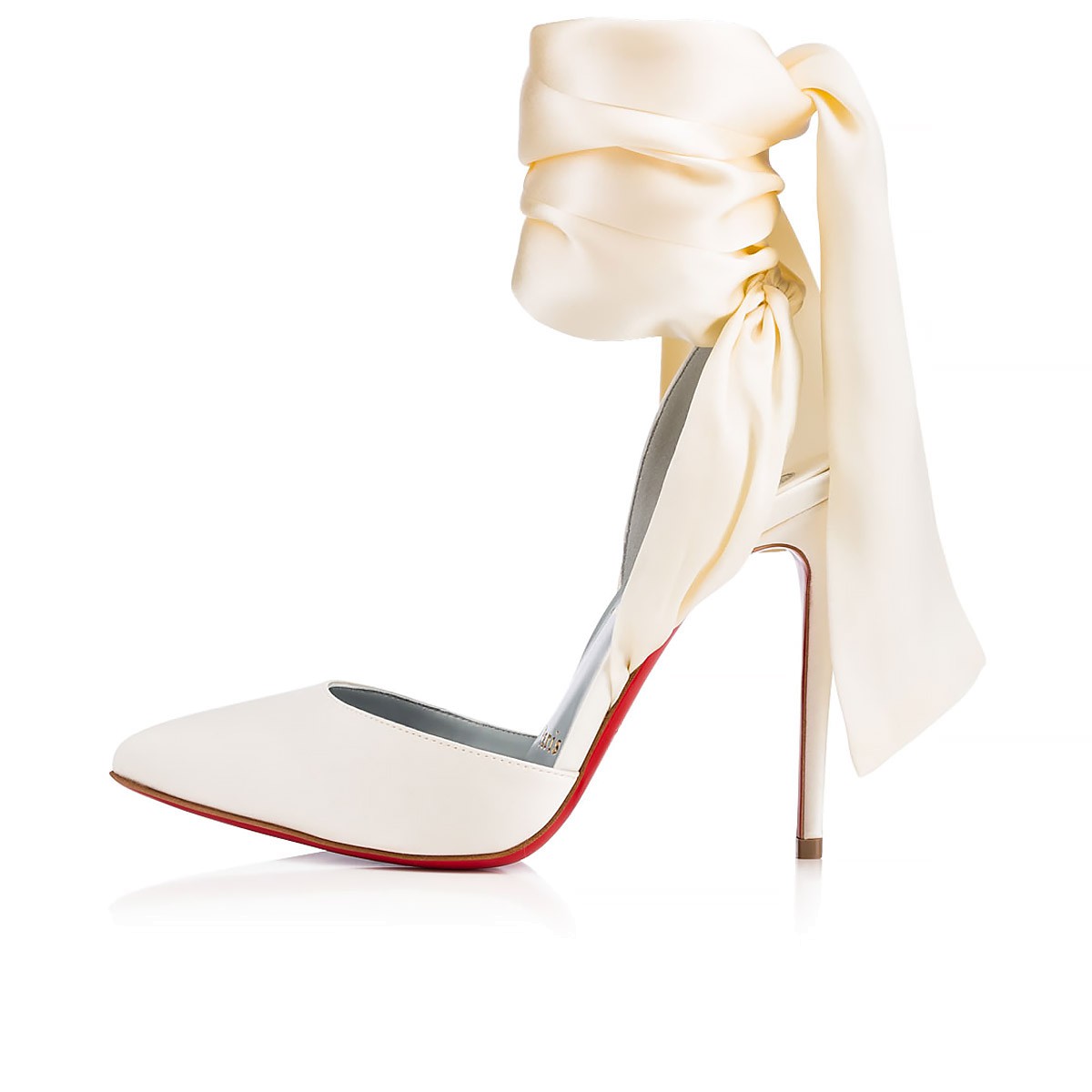 The broad wrap-around ankle ties on “Douce Du Desert” bring a sumptuous, organic feel to this elegant shoe. In off white crepe satin, this 100mm pair is a sublime bridal look.
