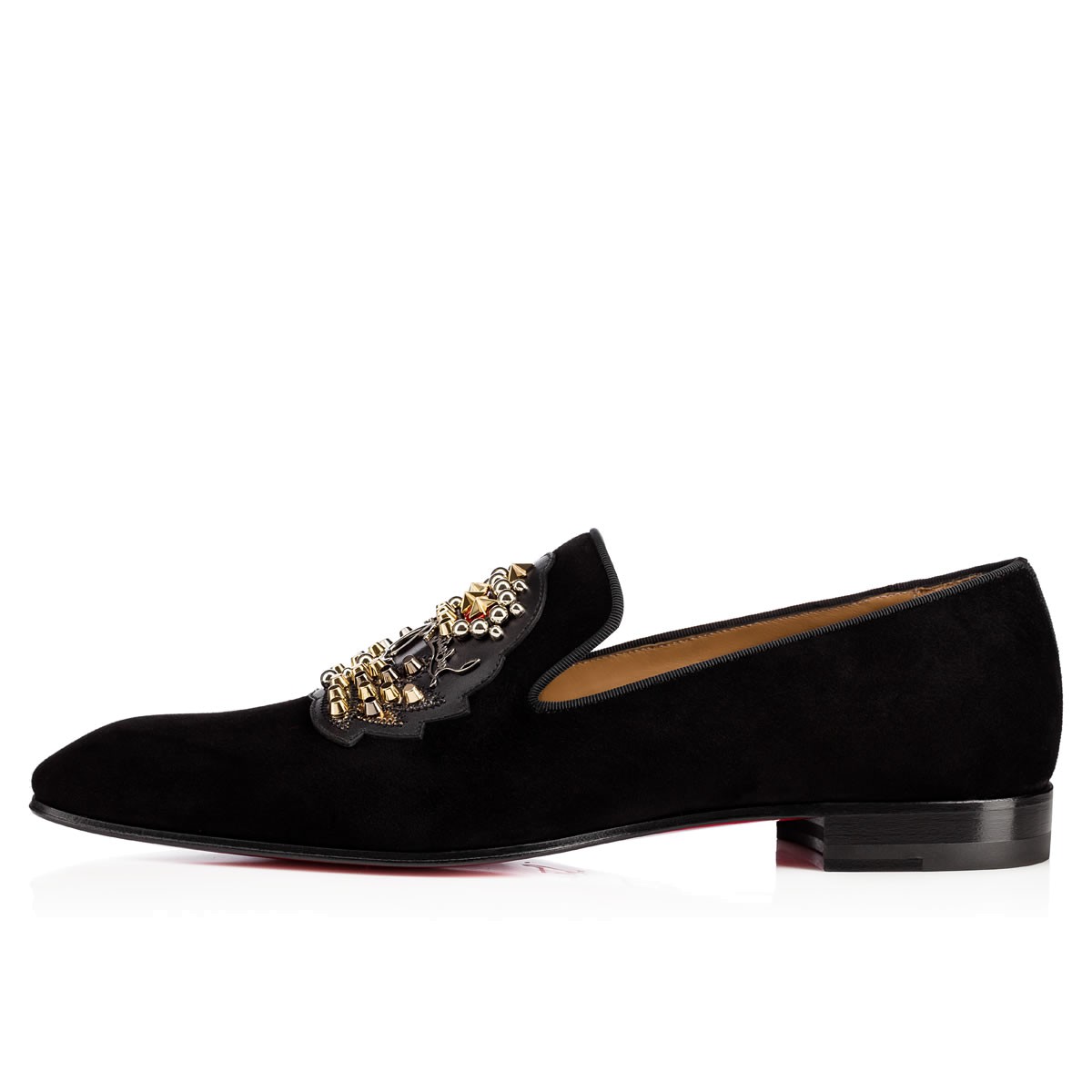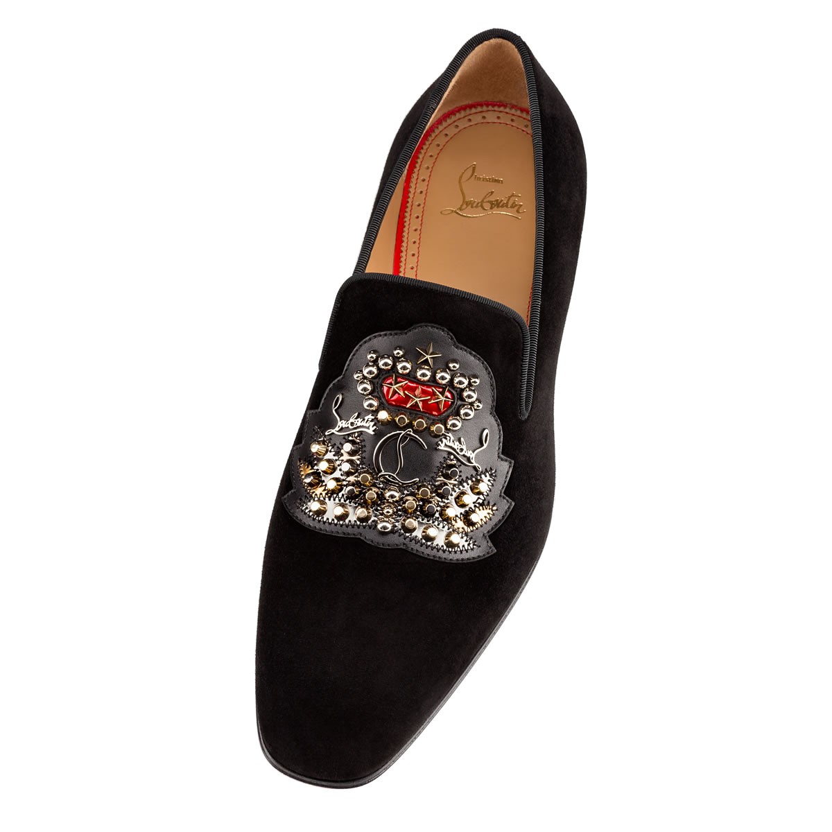 This season’s Christian Louboutin coat-of-arms embellished patch decorates the signature “Dandelion” to create “Ecupump Flat”. In smooth black suede, this pair brings a distinguished air to your formal ensembles.