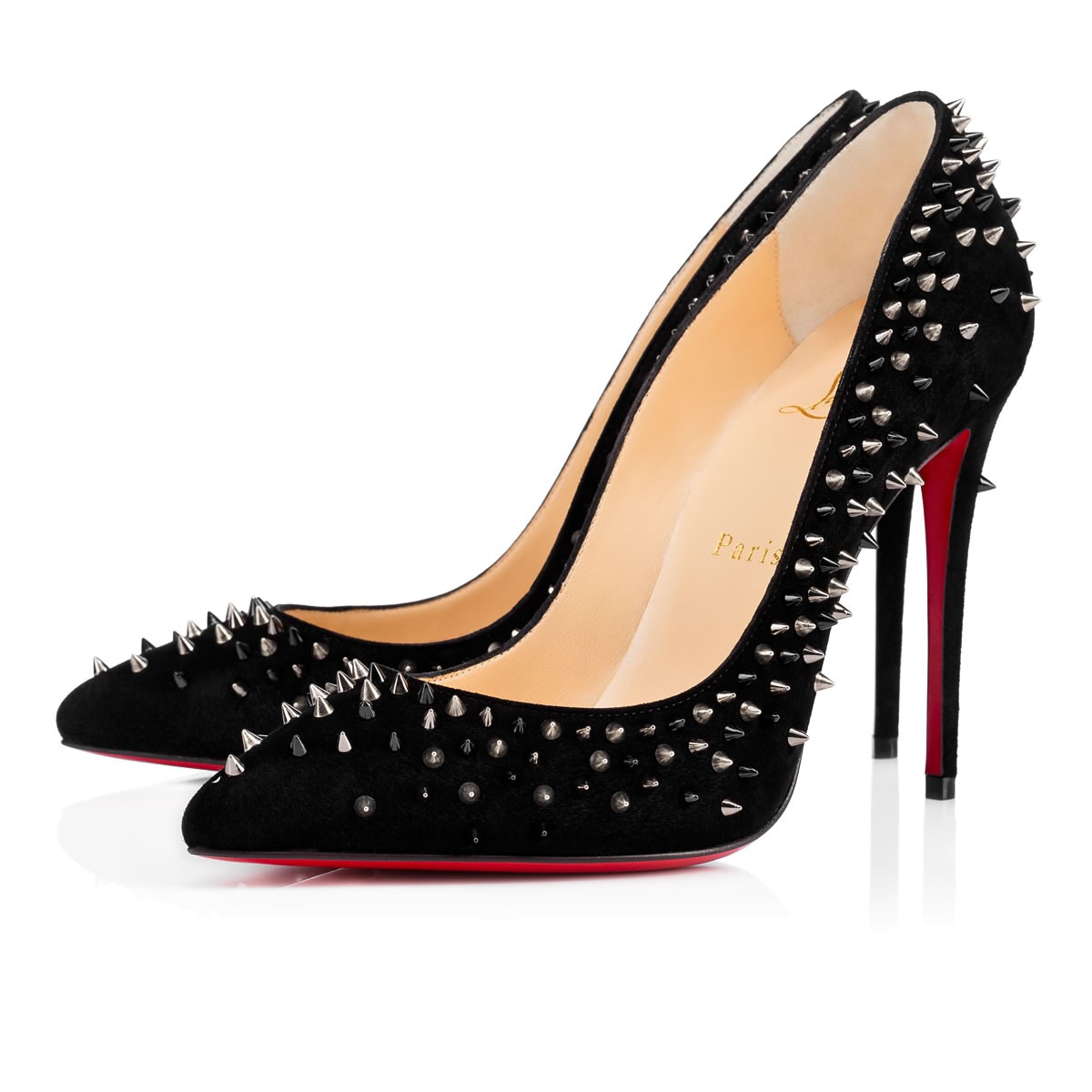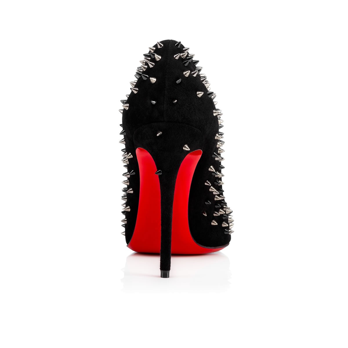 Embellished in a symphony of signature spikes, “Escarpic” makes you the rose to its thorns. In black suede with a mixed metallic spike dégradé, this 100mm pump is pure Louboutin magic.