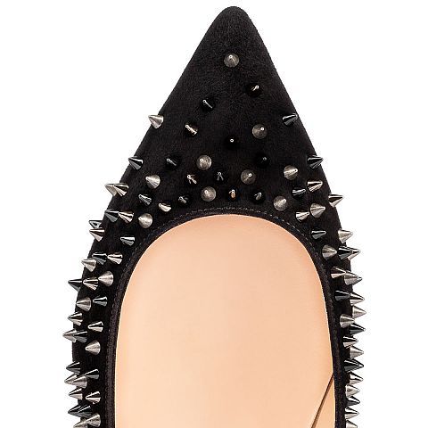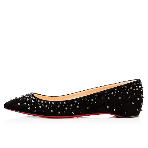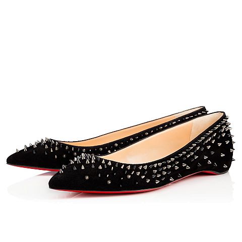 Embellished in a symphony of signature spikes, “Escarpic Flat” makes you the rose to its thorns. In black suede with a mixed metallic spike dégradé, this pointed-toe flat is pure Louboutin magic.