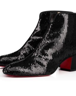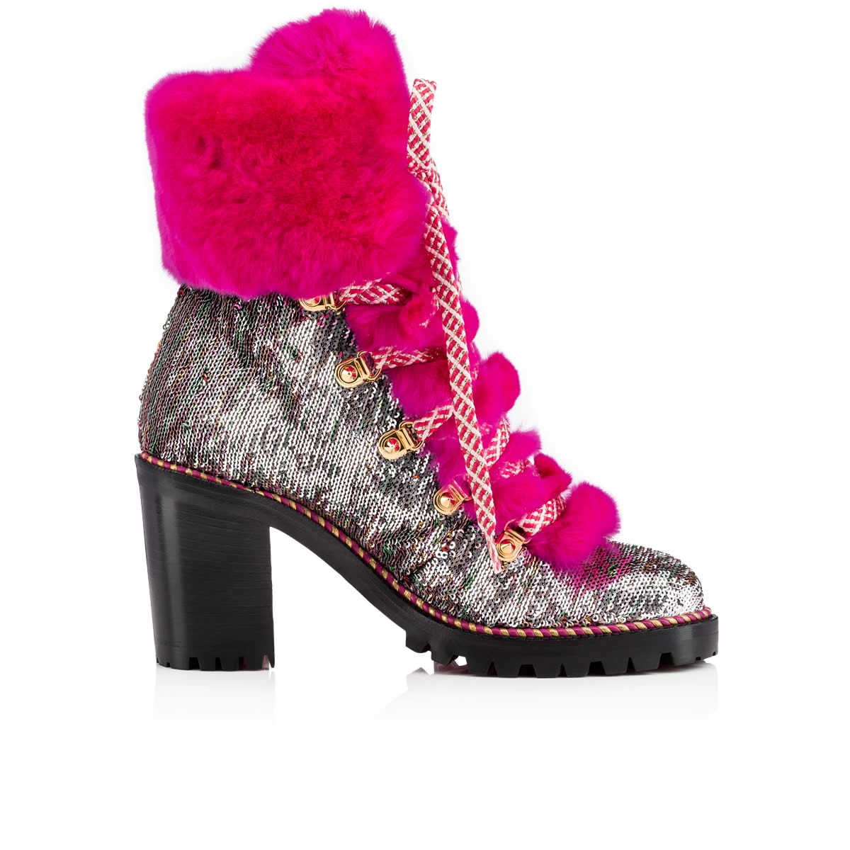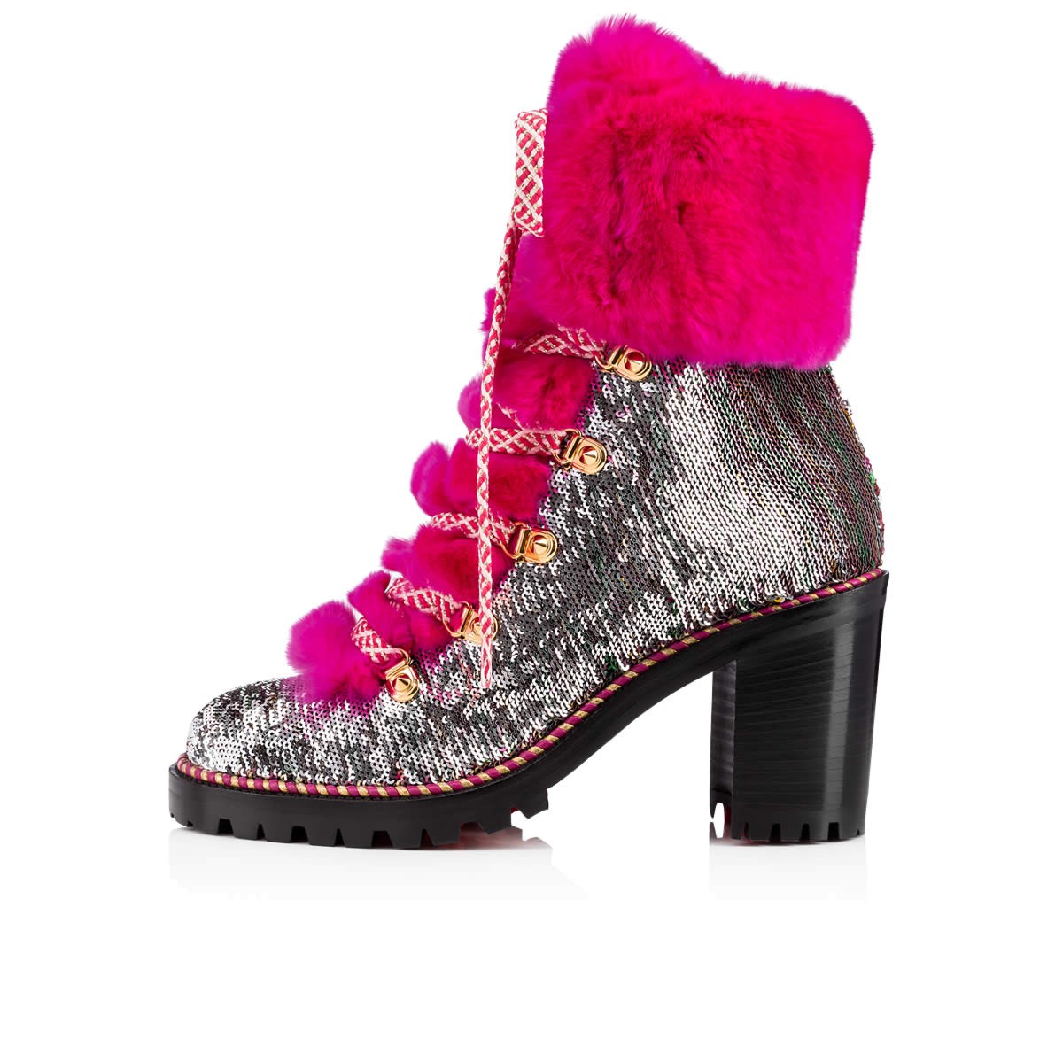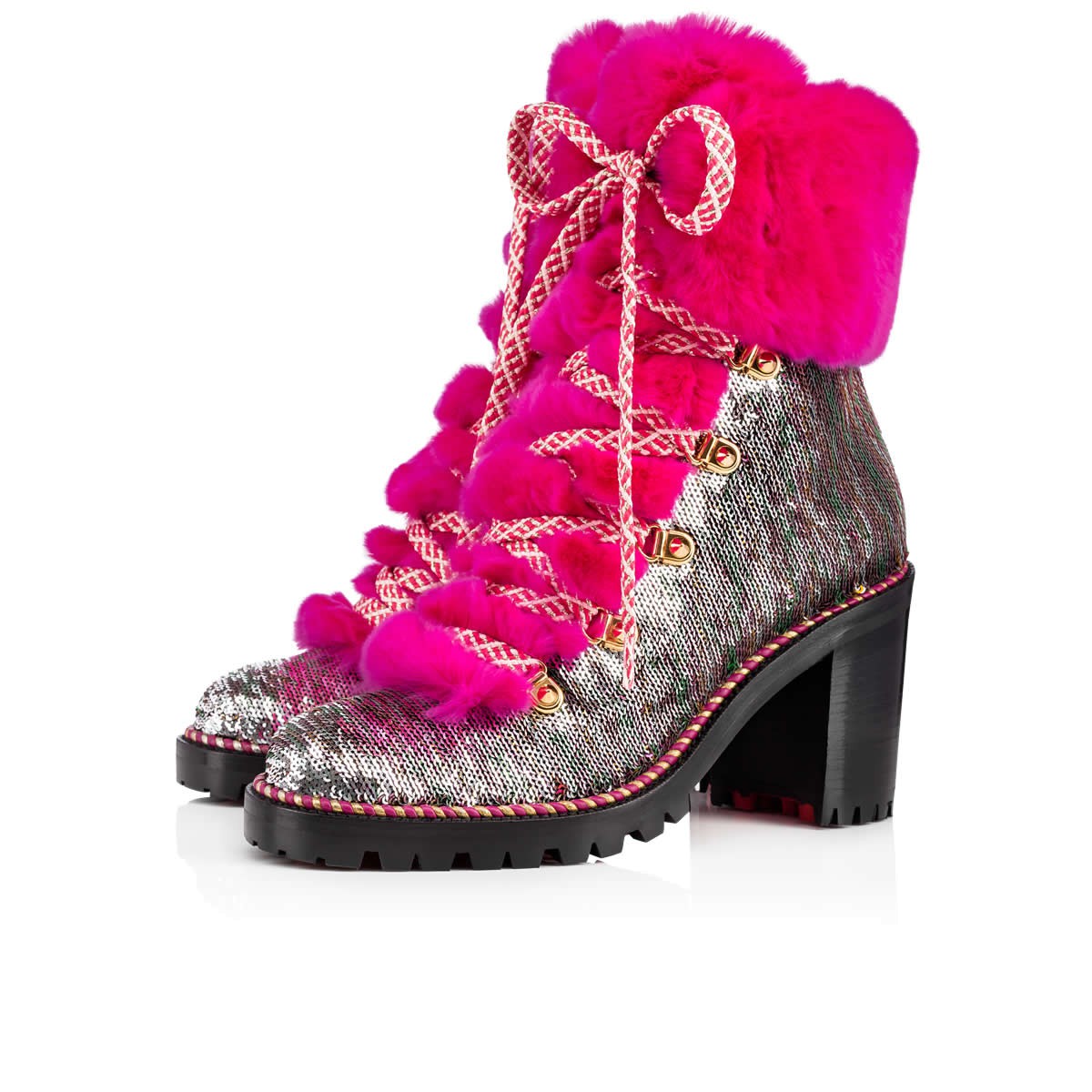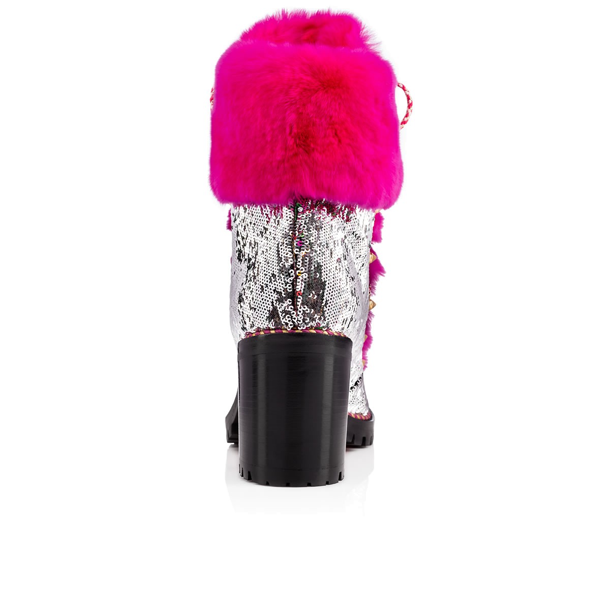 “Fanny 70” is Alpine glamor at its finest. This 70mm lug sole boot in caress sequins is embellished with a luxurious shock of ultra rose orylag rabbit fur at the tongue and ankle cuff. The look alternates from silver to multicolored (and somewhere in-between) with a simple graze of the hand.