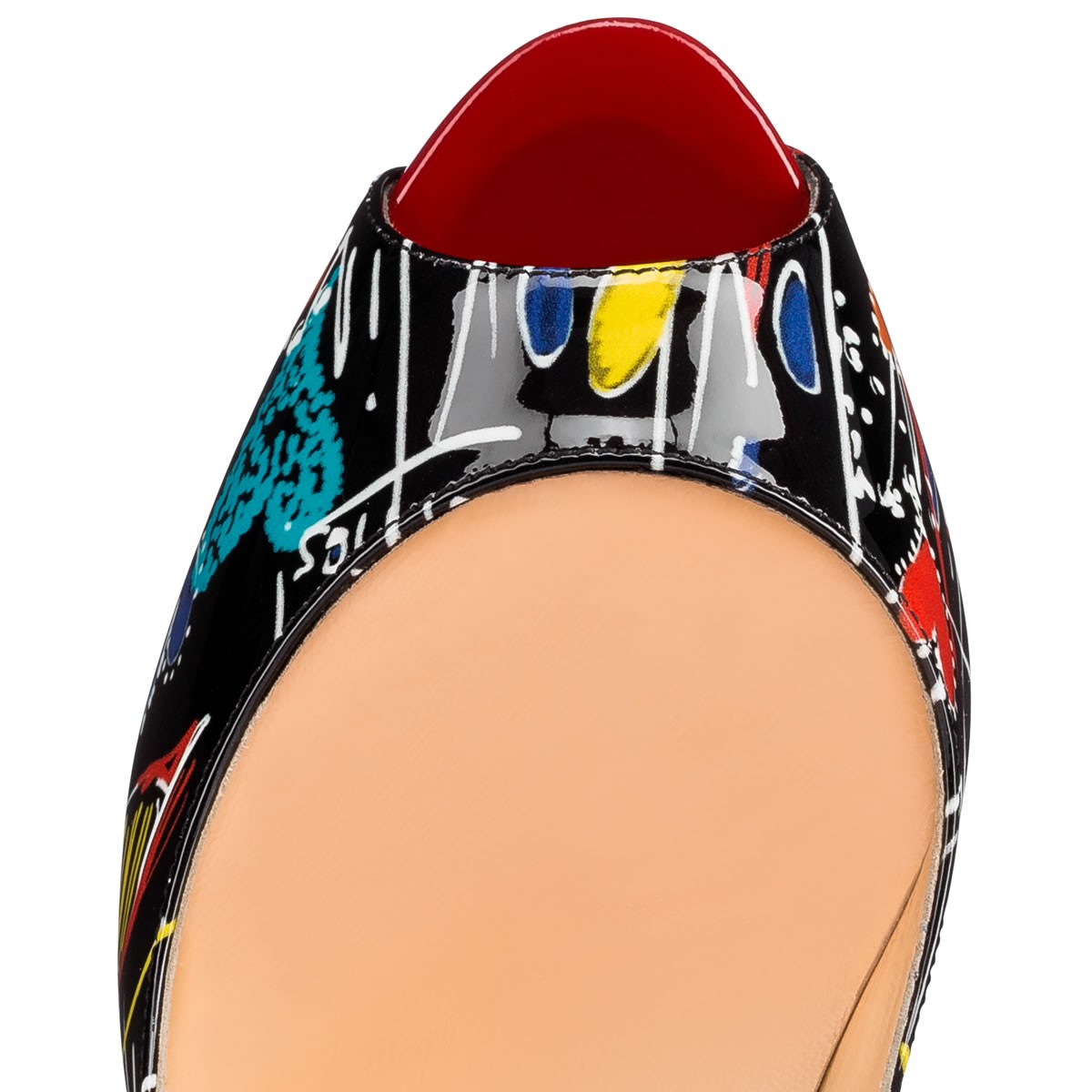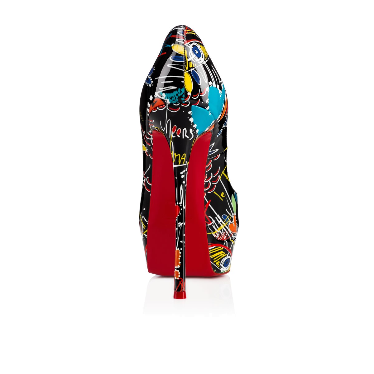 “Fetish Peep” is pin-up perfect. An alluring update of the signature classic “Lady Peep,” this 140mm peep-toe pump in Christian’s hand-scribbled ‘Loubitag’ printed patent leather stands confidently atop a slender fetish heel.