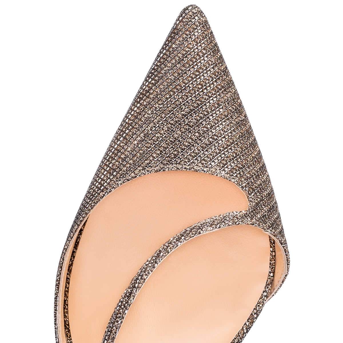 “Fliketta’s” asymmetric cross strap is the image of understated glamor. In roche glitter chain, this 100mm d’Orsay is finished with a chic receded heel and slender ankle strap.