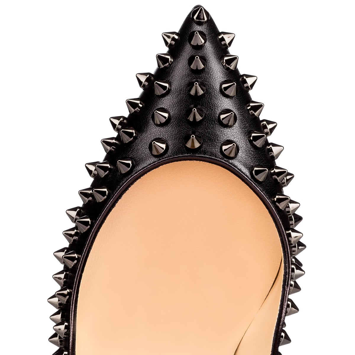 For the party girl in you, behold “Follies Spikes”. Hand-embellished in a full covering of this season’s black gunmetal signature spikes, this feminine 100mm pump in lustrous black leather is all you need to become an empress of the evening.