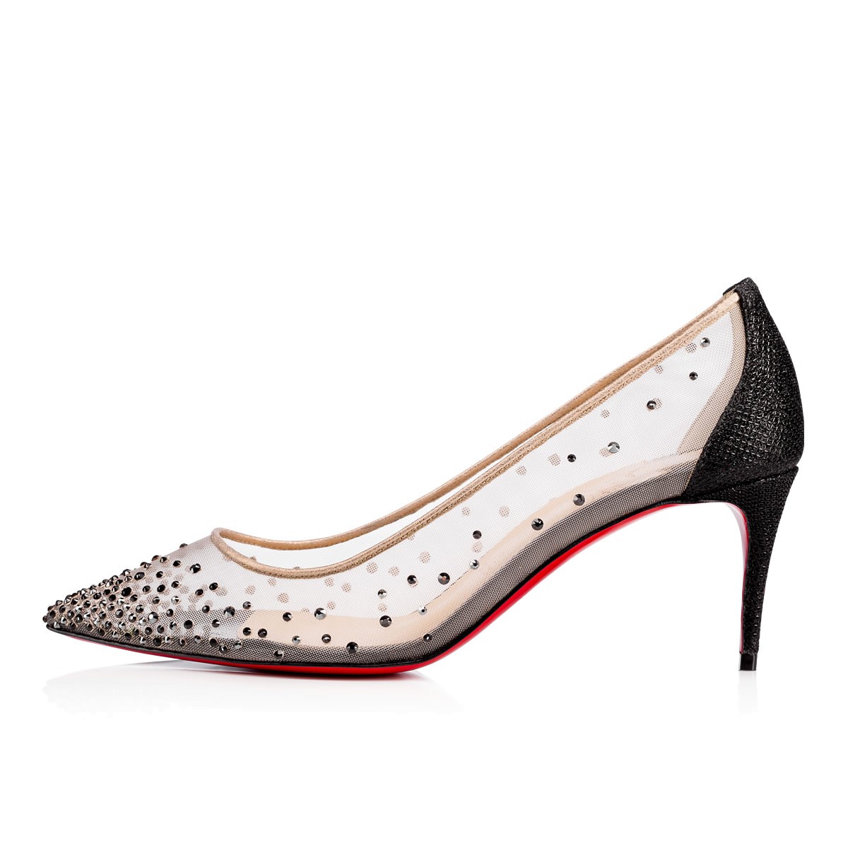 Evening glamor begins with “Follies Strass”. A glistening black Swarovski crystal dégradé set in transparent mesh gives this 70mm pump a dreamlike allure. Finished with a black woven glitter heel, this pair is a jewel for the foot.
