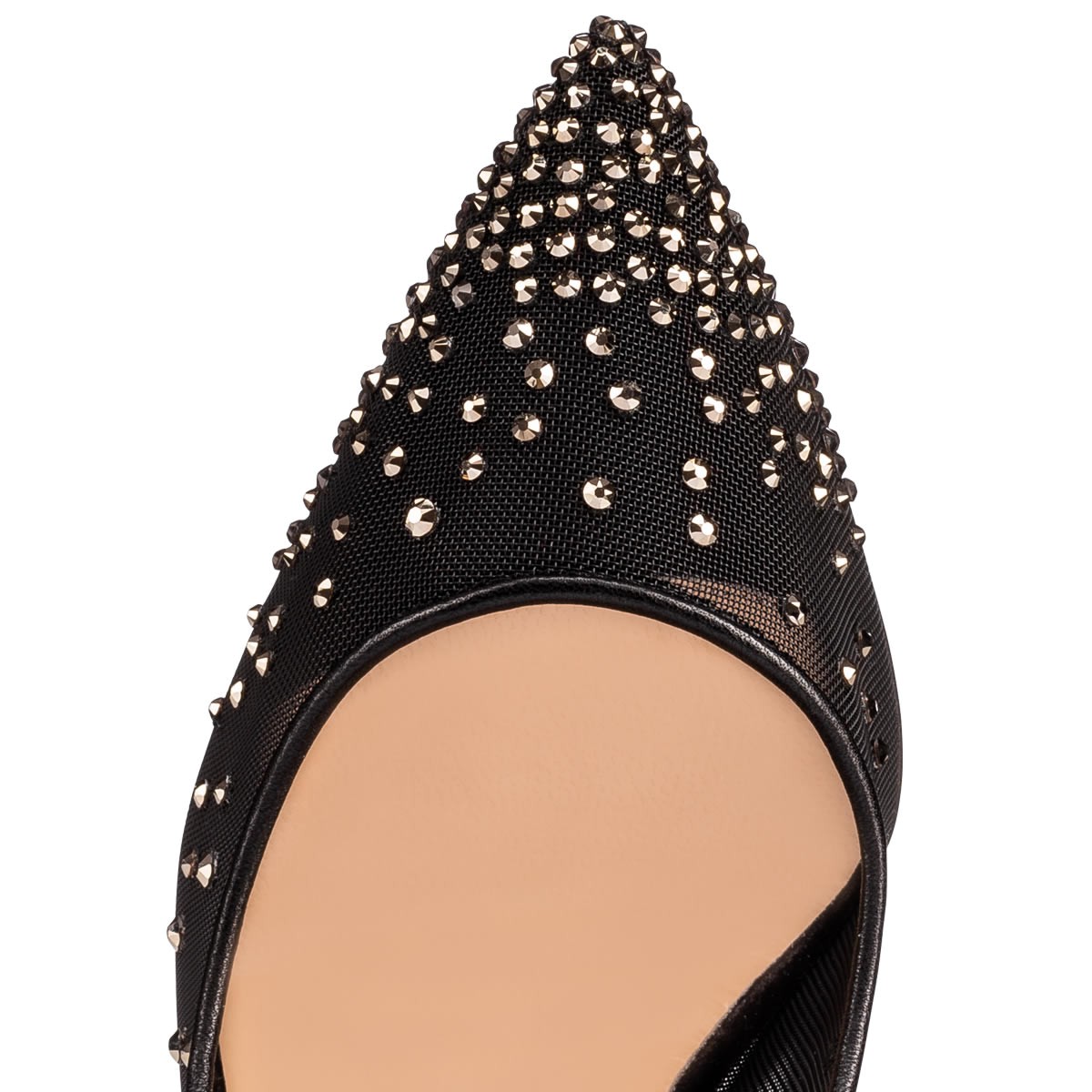 Light up the evening in “Follies Strass”. Her black mesh upper is embellished with a sparkling gradient of hand-placed crystals and finished with a smooth 100mm velvet heel.