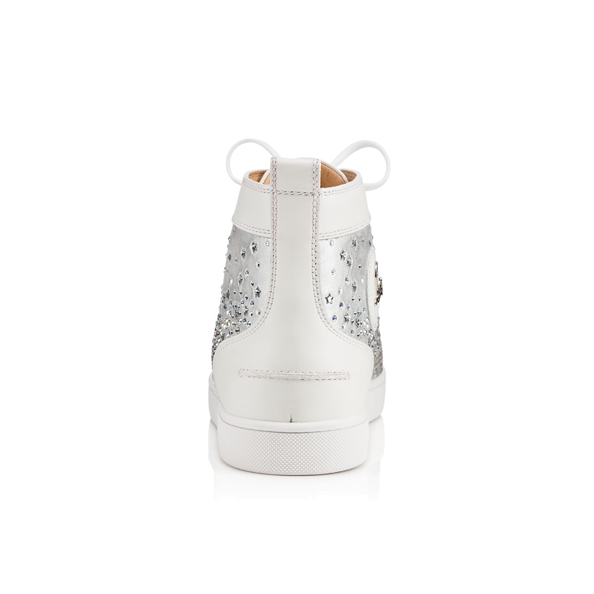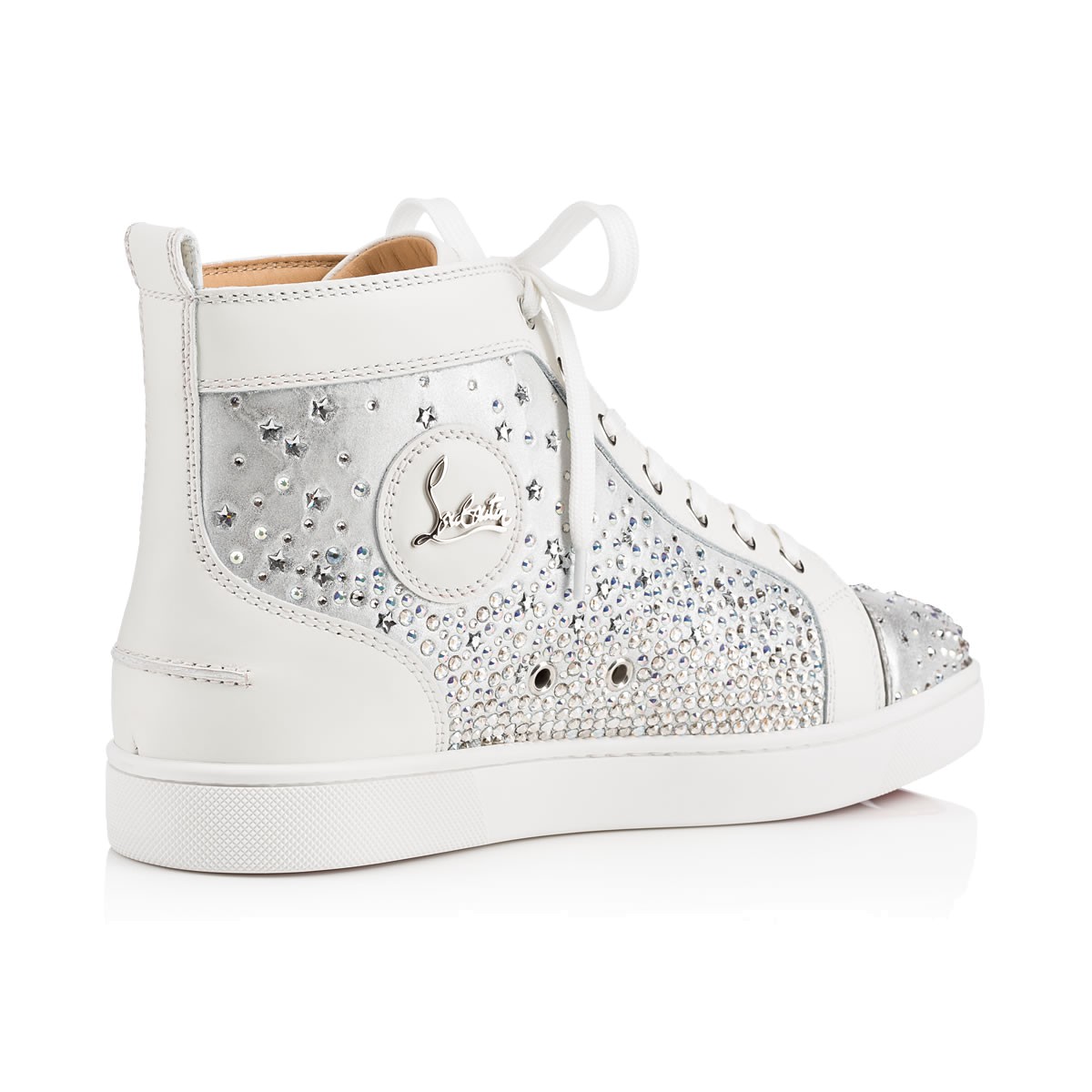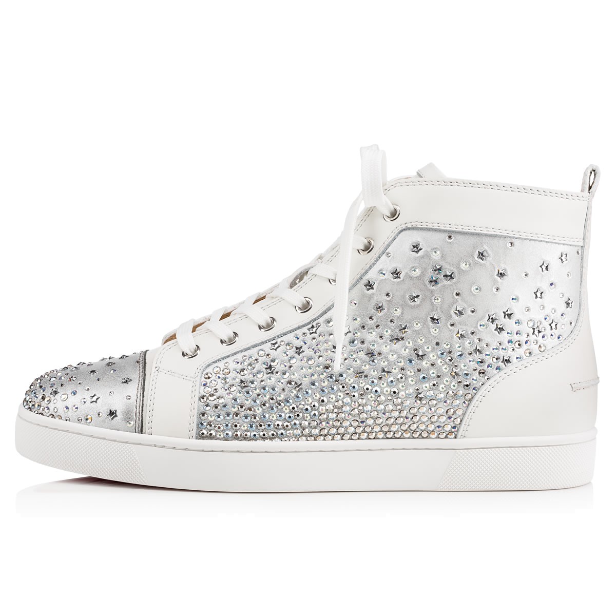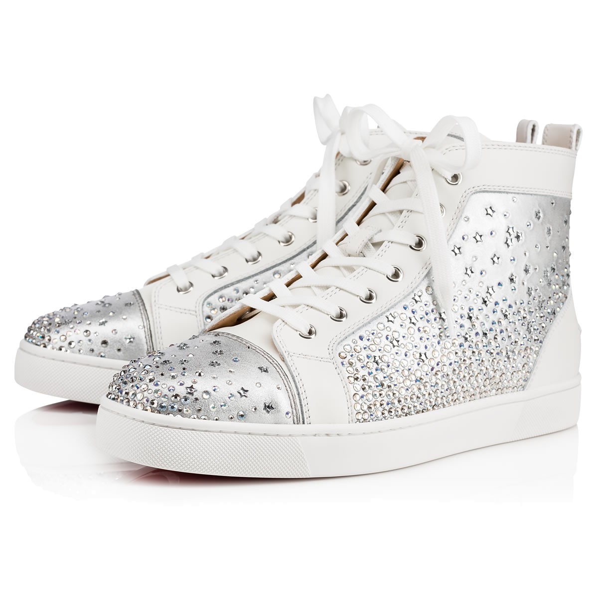 Catapult your look this season with “Galaxtidude Flat”. Encrusted with a celestial dusting of Swarovski crystals, this latte metal suede and leather hightop is a Louboutin collectsor’s item.