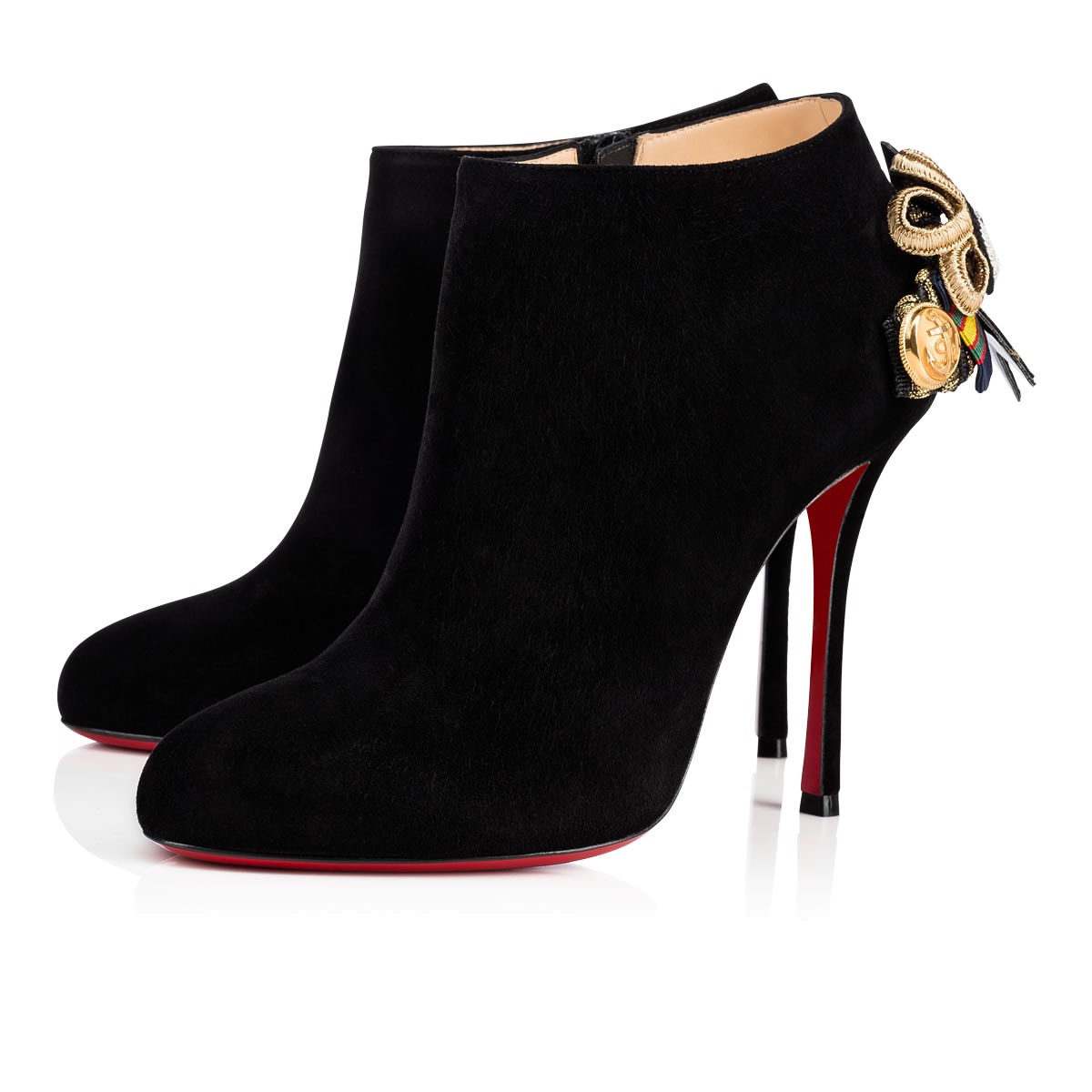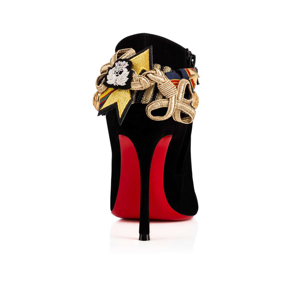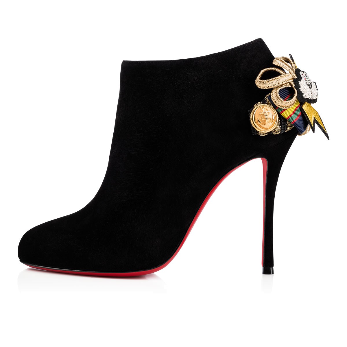 “Galobella” puts a Parisian spin on classic Western wear with a heel stirrup formed of military inspired ribbon, CL logo2 crest patches and naval buttons. In smooth black suede, this 100mm ankle boot adds a distinctive flair to any look.