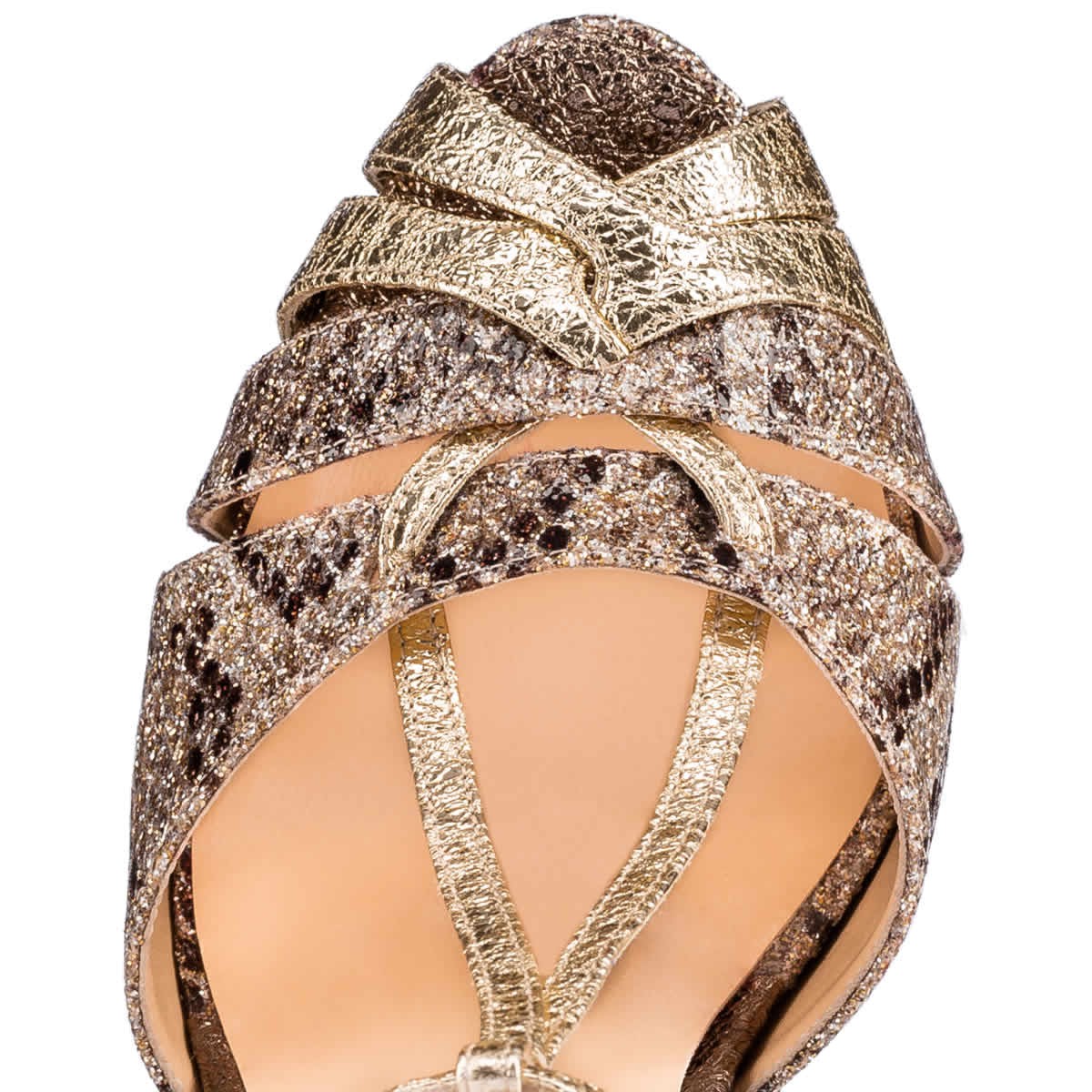 “Glennalta” brings fresh inspiration to your evening styles this season. Crafted in an architectural strap configuration, this sky-high 140mm platform sandal in roccia python printed eve glitter and gold vintage specchio leather is an effervescent party look.