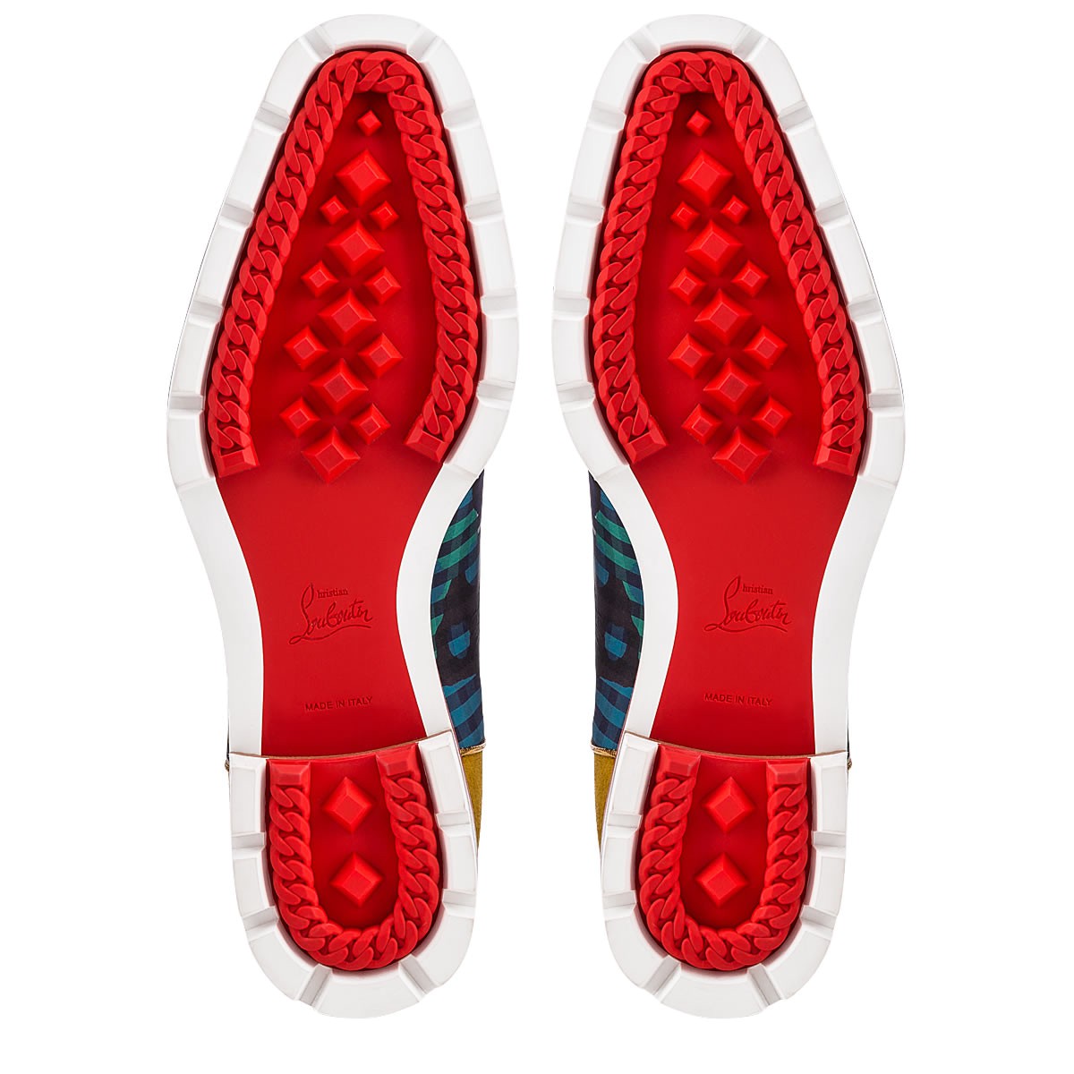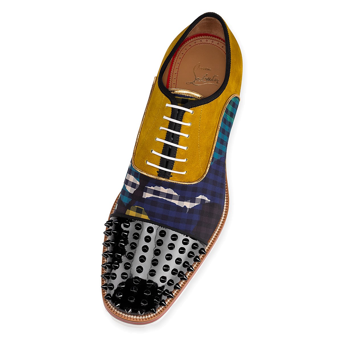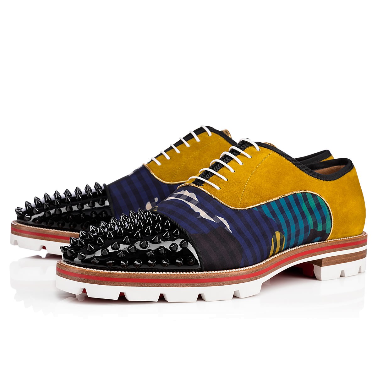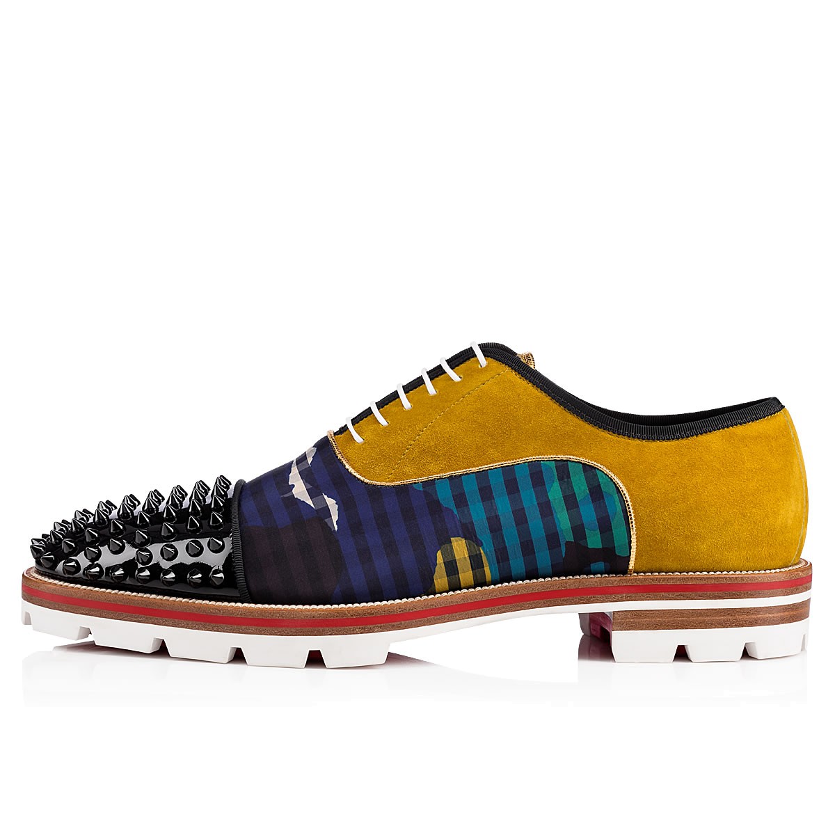 “Hubertus Orlato Spikes” brings new energy to the classic oxford silhouette. Cloaked in a dynamic blend of ’60s print gingham, black patent leather and liquer suede, with a signature spiked toe box, the Loubi red lined lug sole adds a laid-back, utilitarian touch.