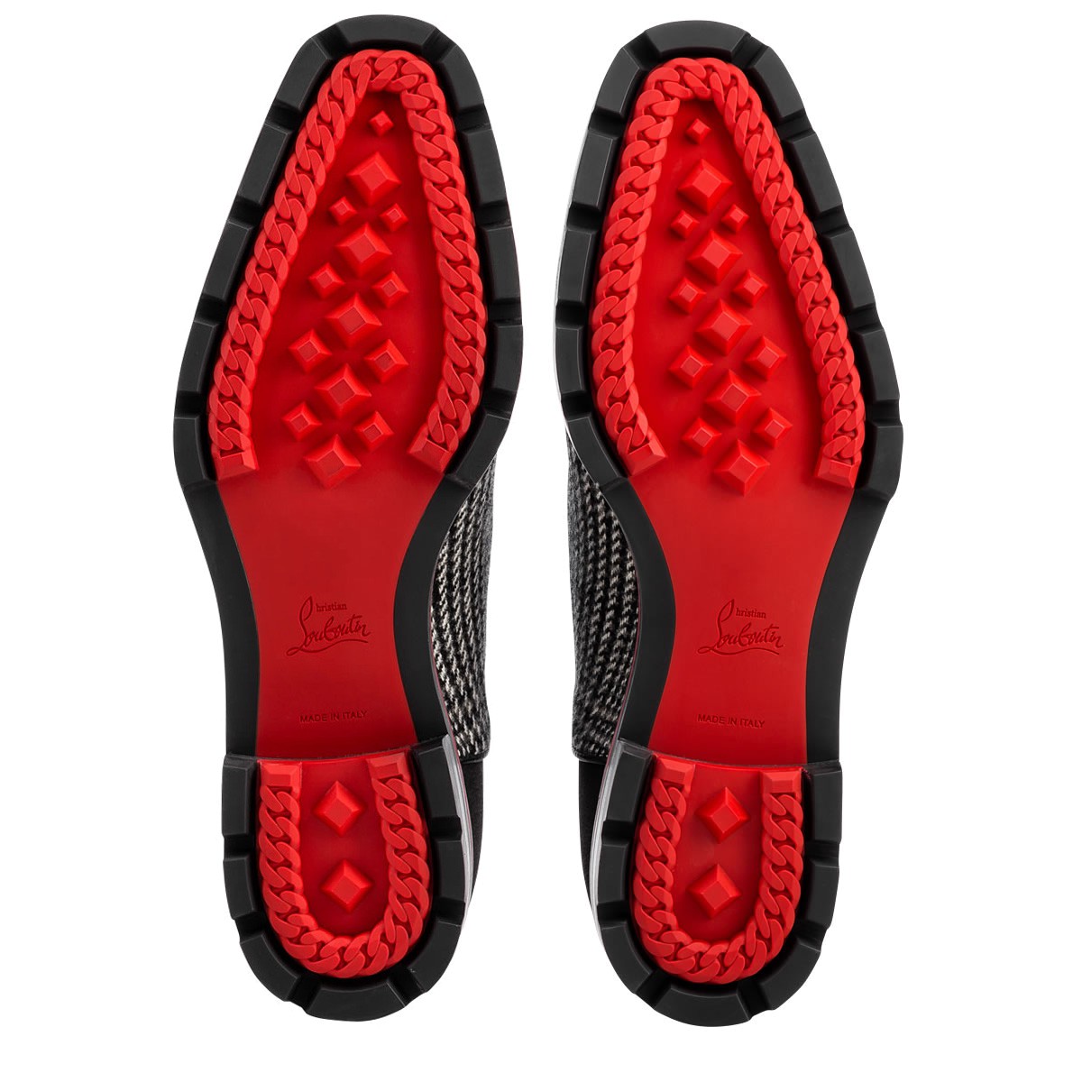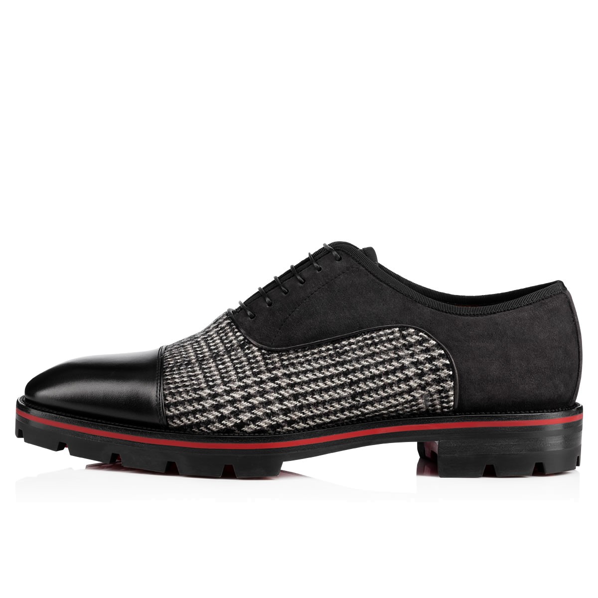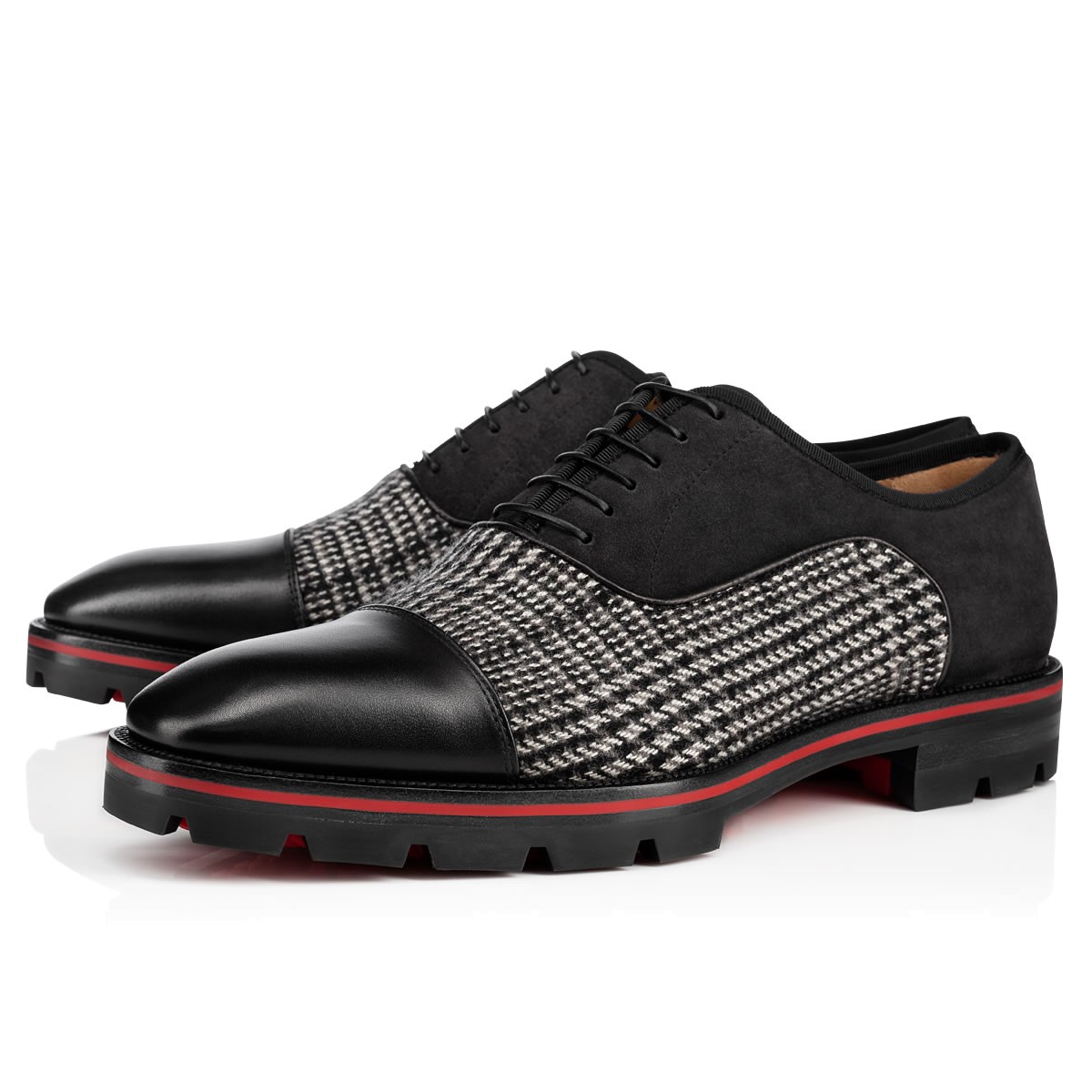 “Hubertus Orlato” brings new energy to the classic oxford silhouette. Cloaked in a refined blend of Welsh tweed, black leather and charbon suede, the Loubi red lined lug sole adds a season-friendly touch.
