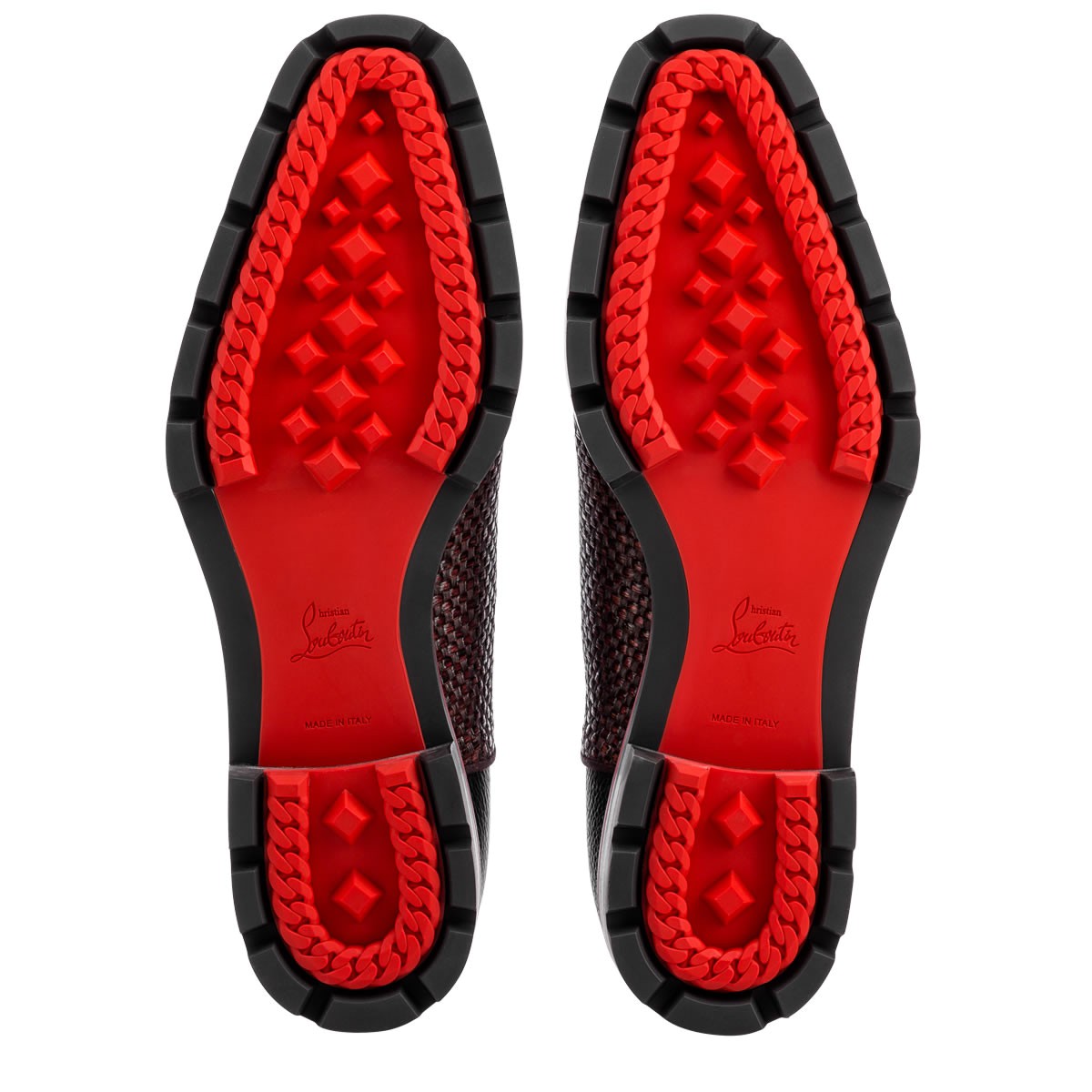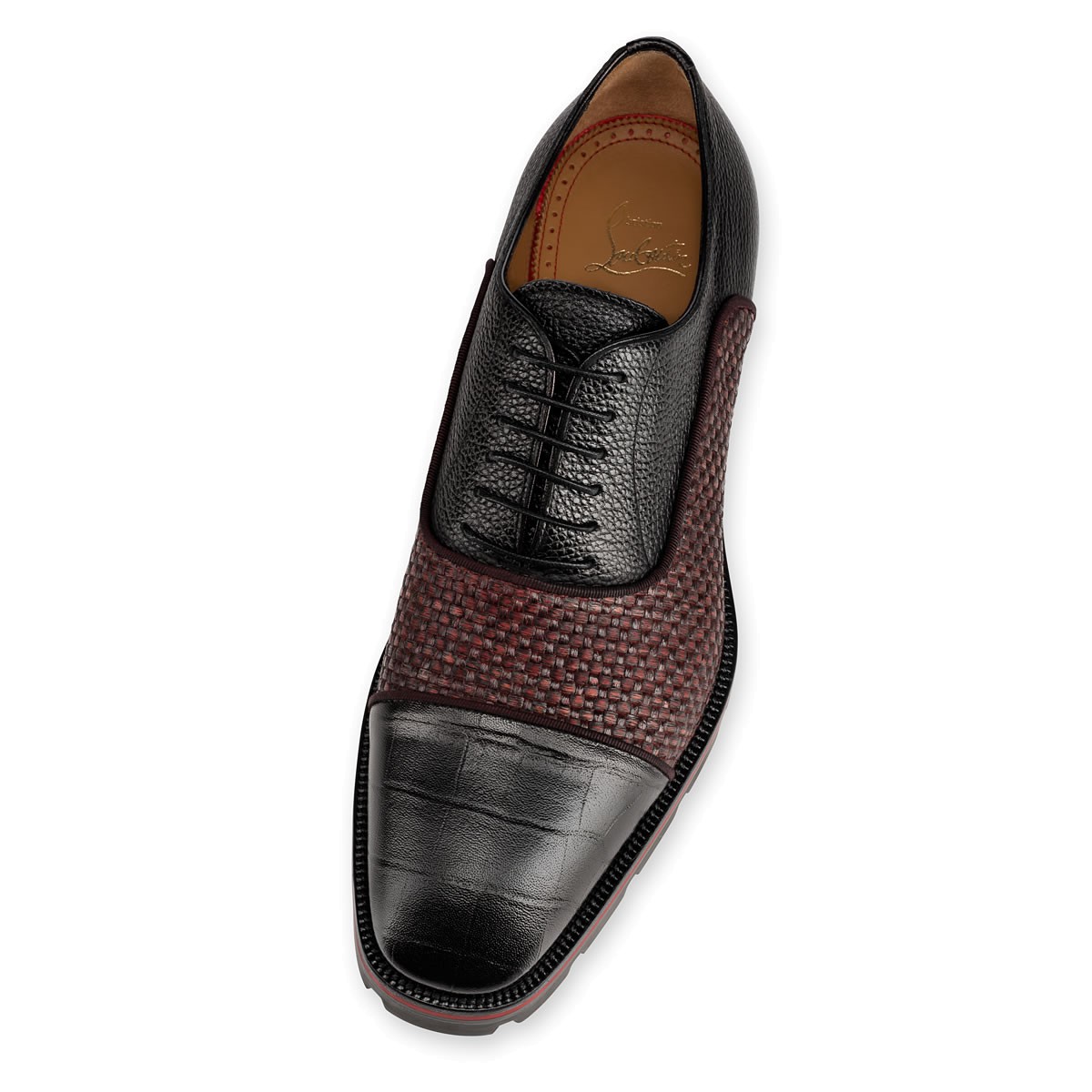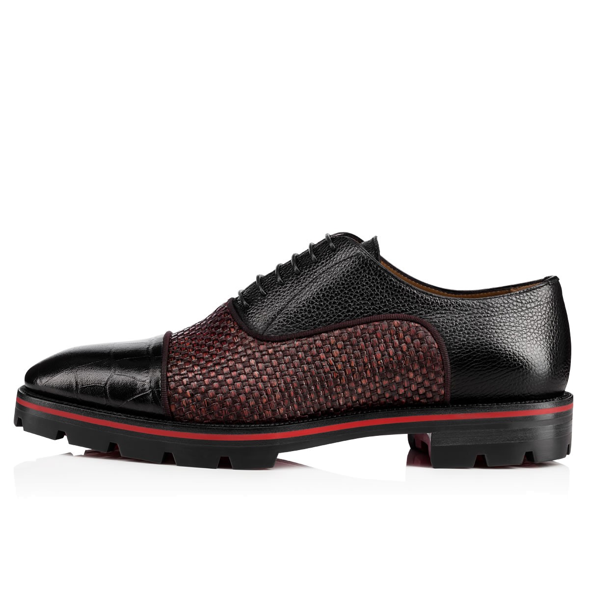 “Hubertus Orlato Flat” brings new energy to the classic oxford silhouette. Cloaked in a luxurious blend of woven raffia and crocodile embossed leather with a Loubi red lined lug sole, this black and bordeaux lace-up is a Fall/Winter style statement.