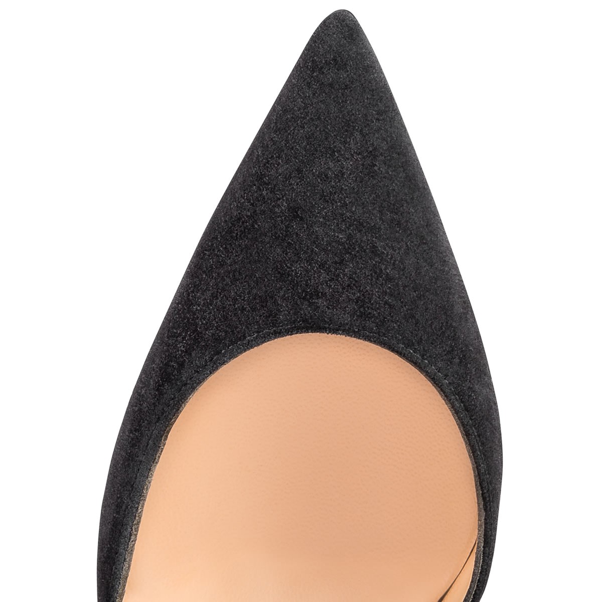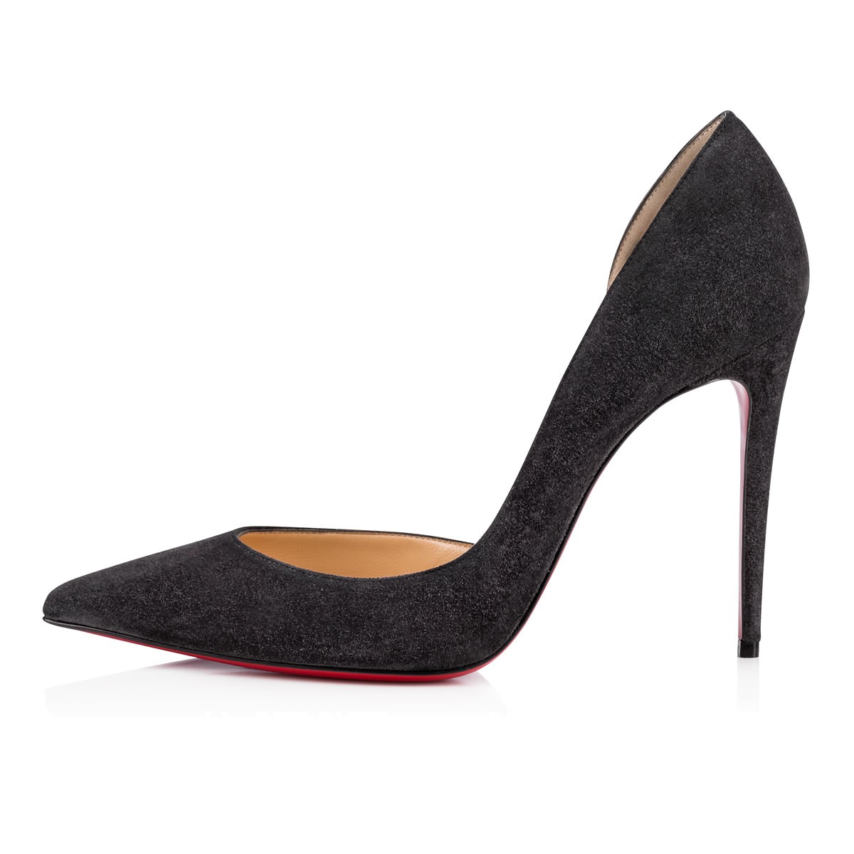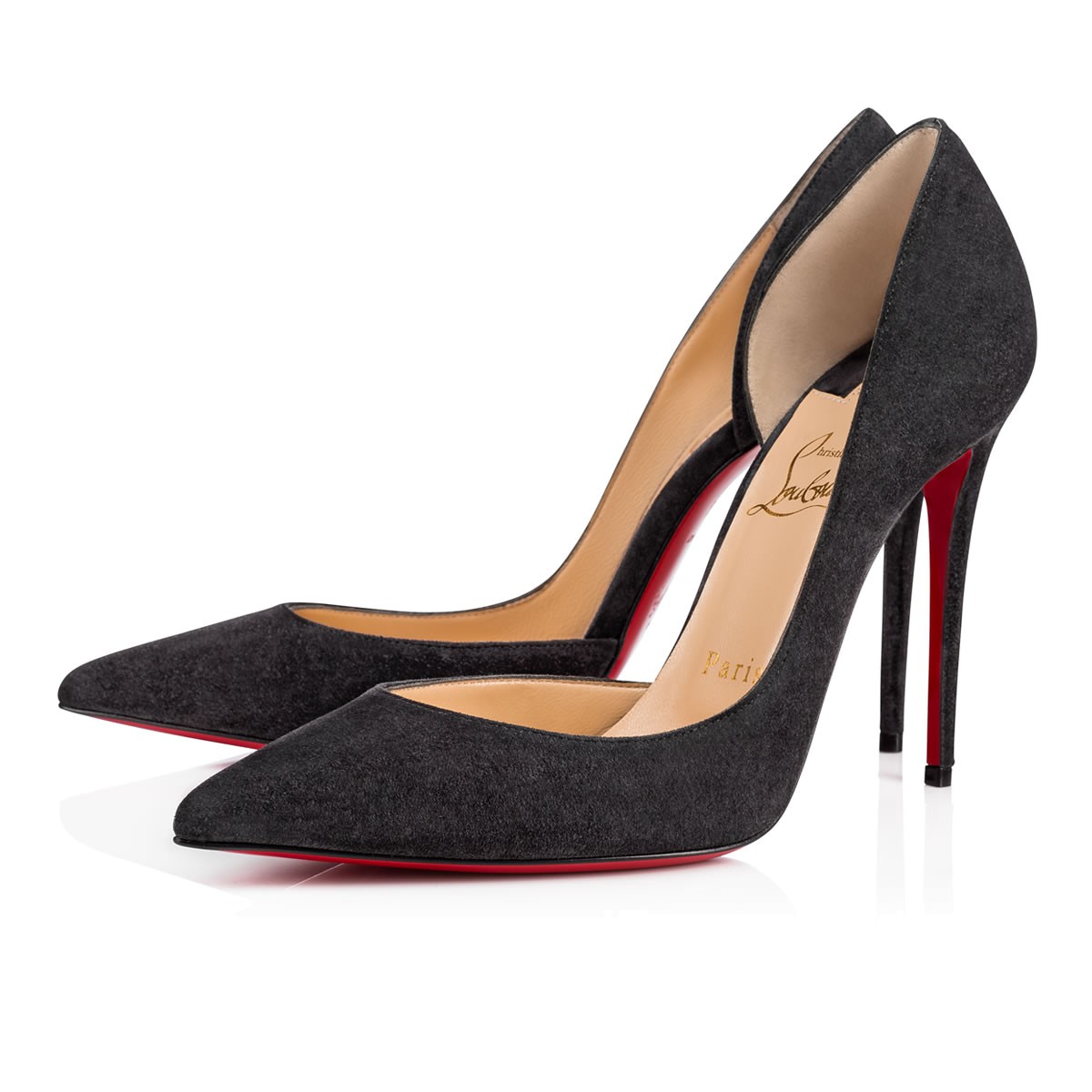 Christian Louboutin’s signature half d’Orsay, “Iriza,” is a stunning look for women who aren’t afraid to be a little bit exposed. Her cut-out vamp creates a sexy and utterly feminine shape. Make this 100mm charbon suede version your staple shoe this season.