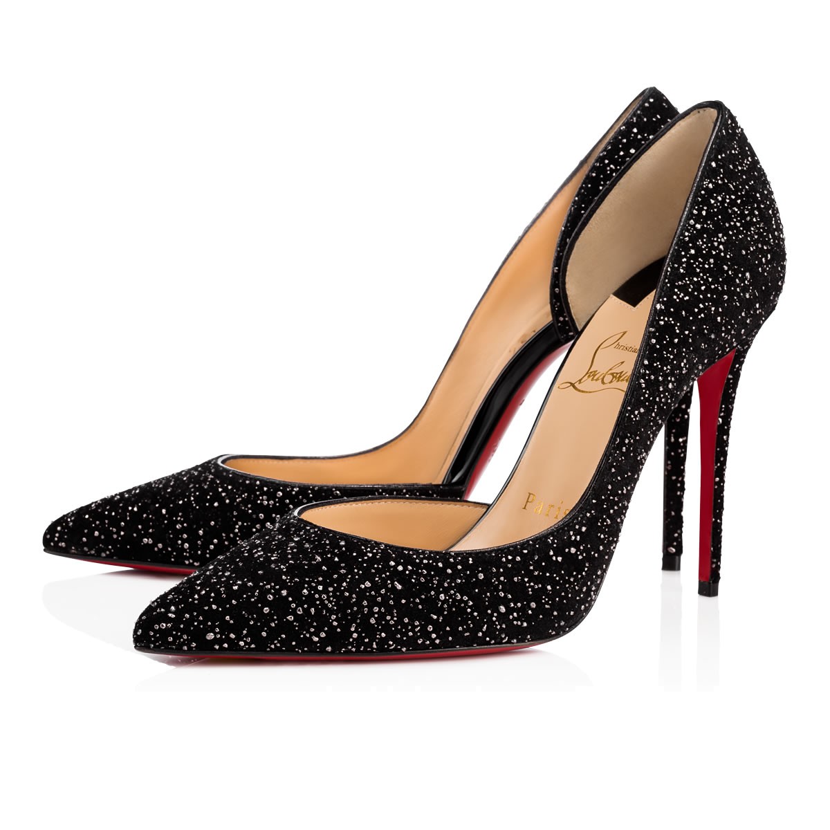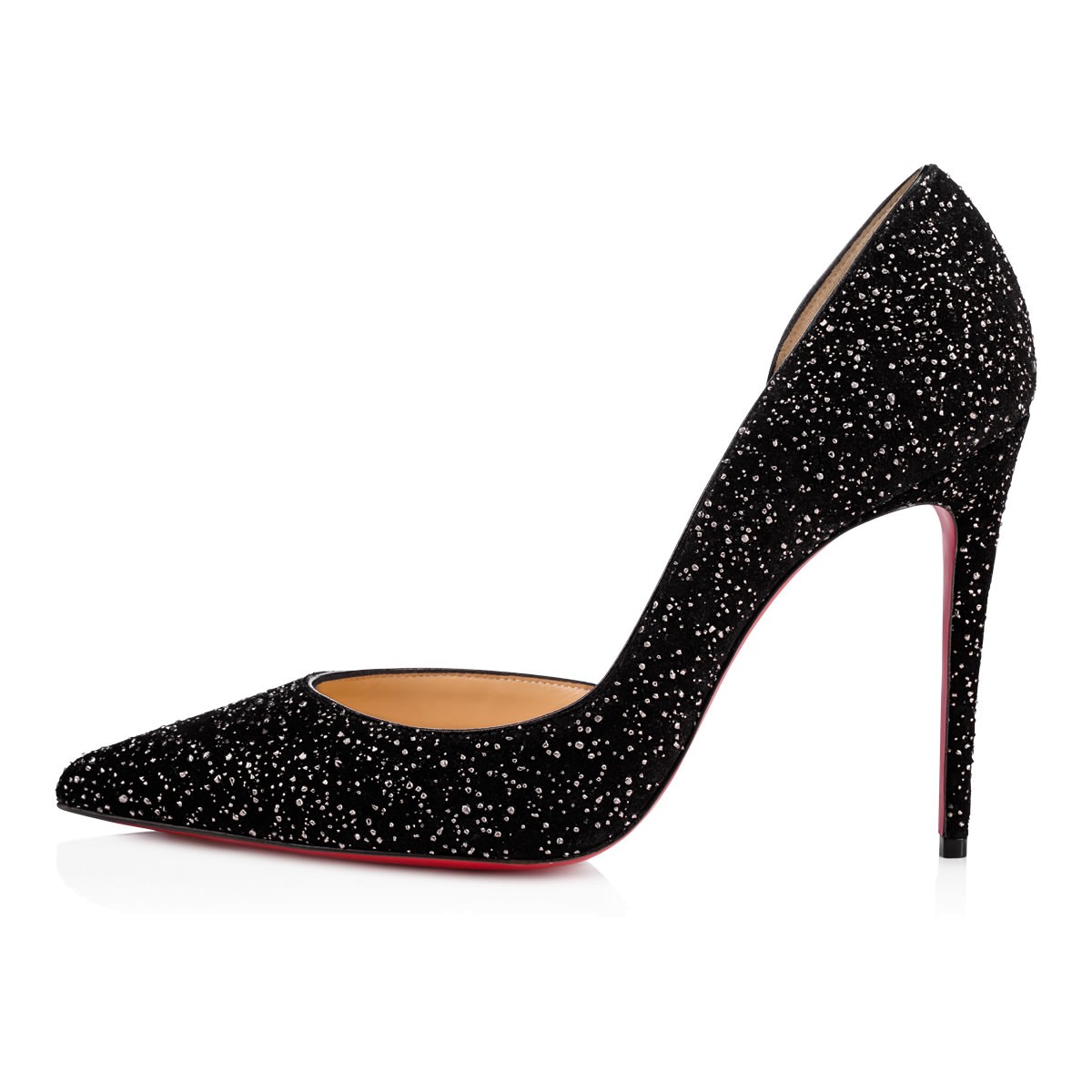 Christian Louboutin’s signature half d’Orsay, “Iriza”, is a stunning look for women who aren’t afraid to be a little bit exposed. Her cut-out vamp creates an alluring and utterly feminine shape. This 100mm brass-flecked ‘meteor’ crosta leather version is a glistening statement shoe.