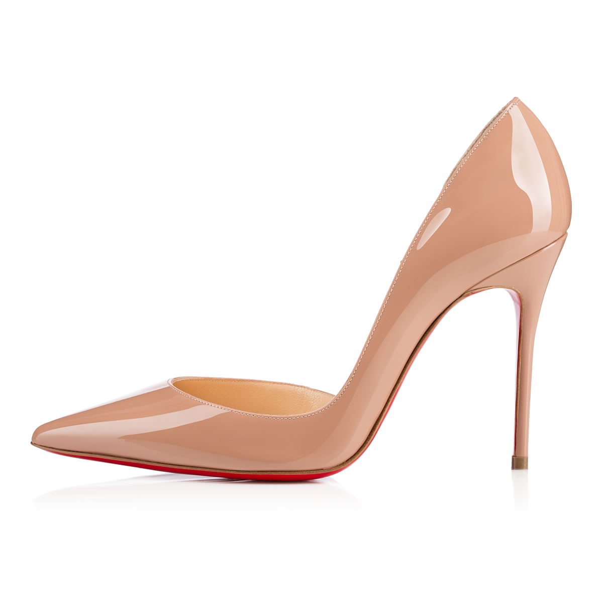 Christian Louboutin’s signature half d’Orsay, “Iriza”, is a stunning look for women who aren’t afraid to be a little bit exposed. Her cut-out vamp creates an alluring and utterly feminine shape. This 100mm nude patent leather version is an all-season classic.