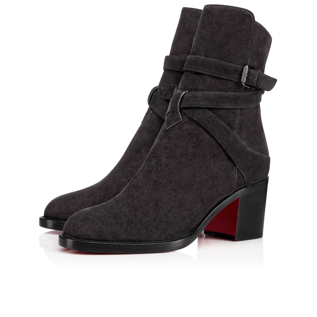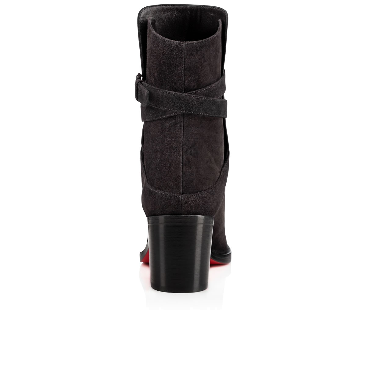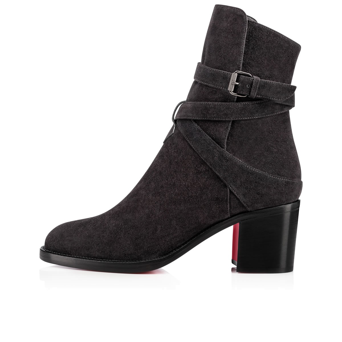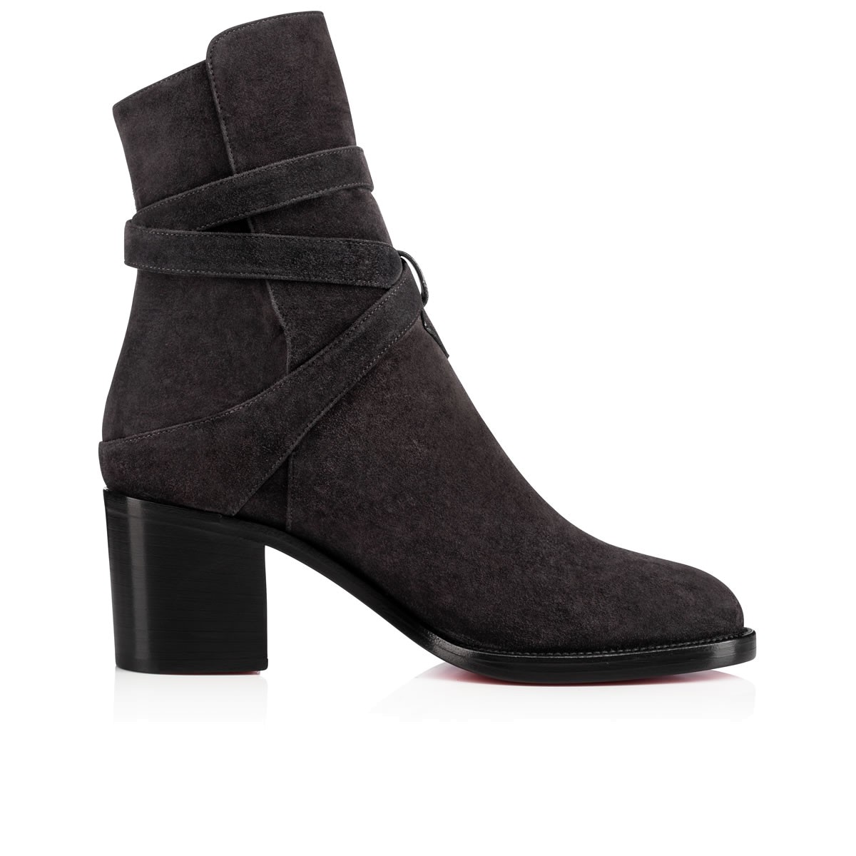 “Karistrap’s” winding striated buckle strap adds a touch of leatherwork eloquence to this 70mm ankle boot. Featuring a slightly higher front panel, this casual-chic charbon suede style is a closet catch this season.