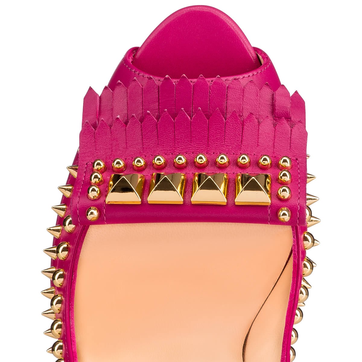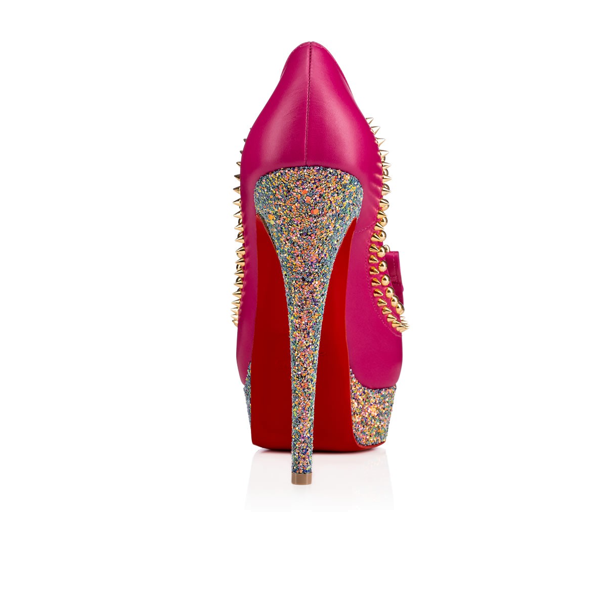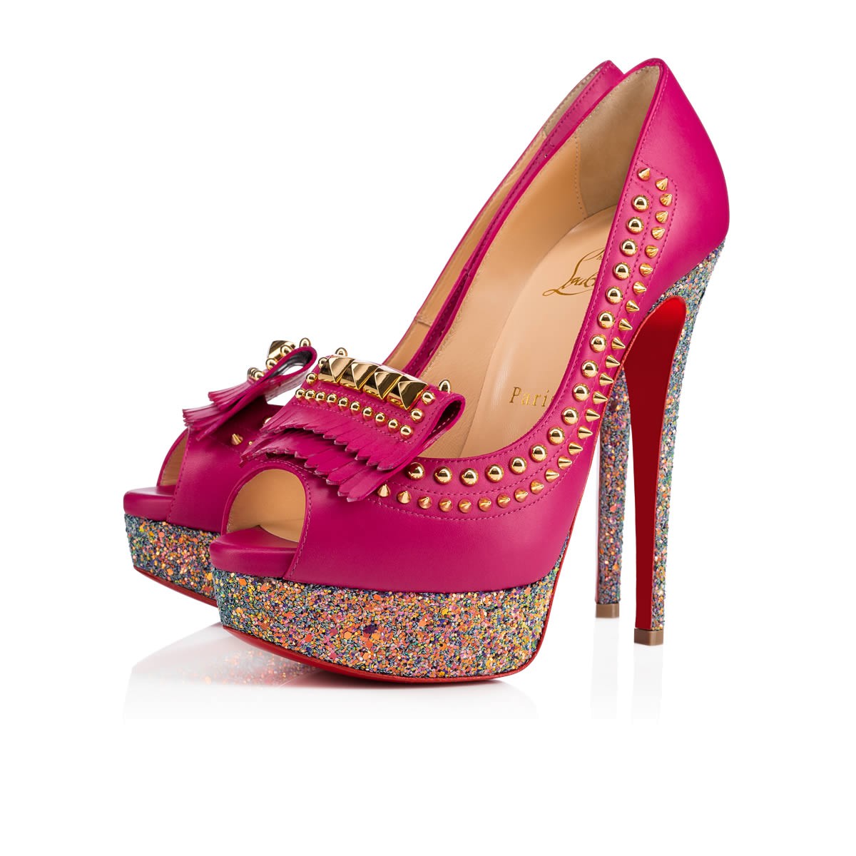 “Lady Chichi” is one of Monsieur Louboutin’s favorite styles this Fall/Winter. Blending traditional kiltie fringe with signature hardware detailing, this towering 140mm peep-toe pump in ultra rose leather and etincelle dragonfly glitter is glitz and glamor nonpareil.