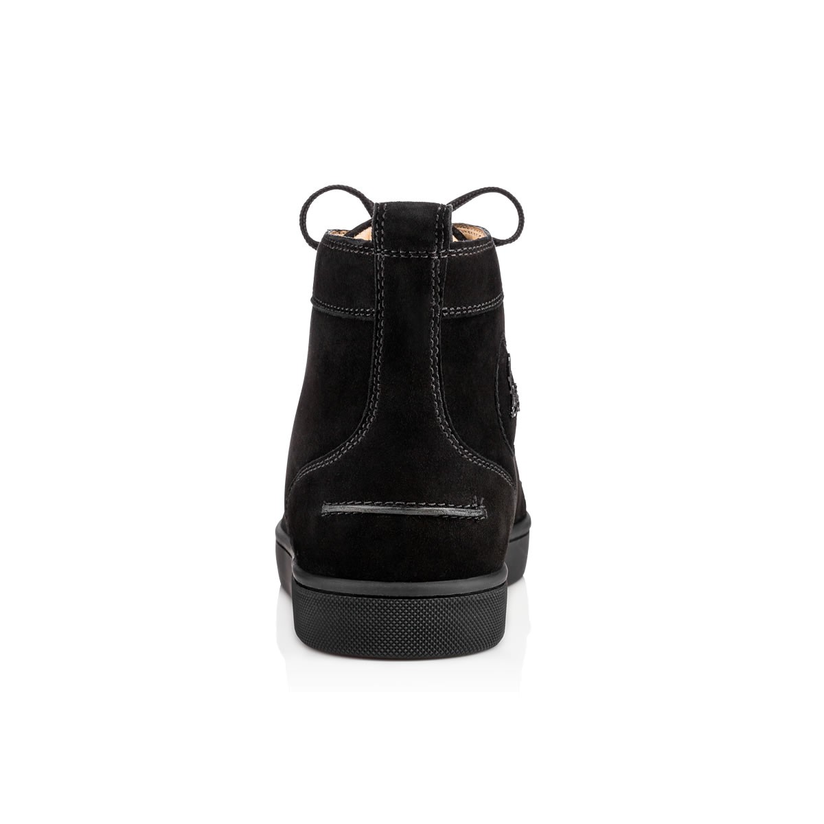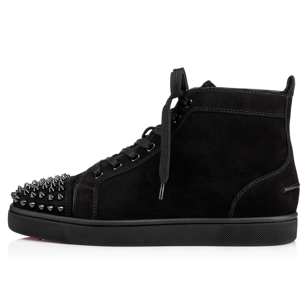 Update your red sole sneaker collectsion with “Lou Spikes” in classic black-on-black suede and spikes. This coveted Louboutin hightop makes an irresistible addition to your casual looks.