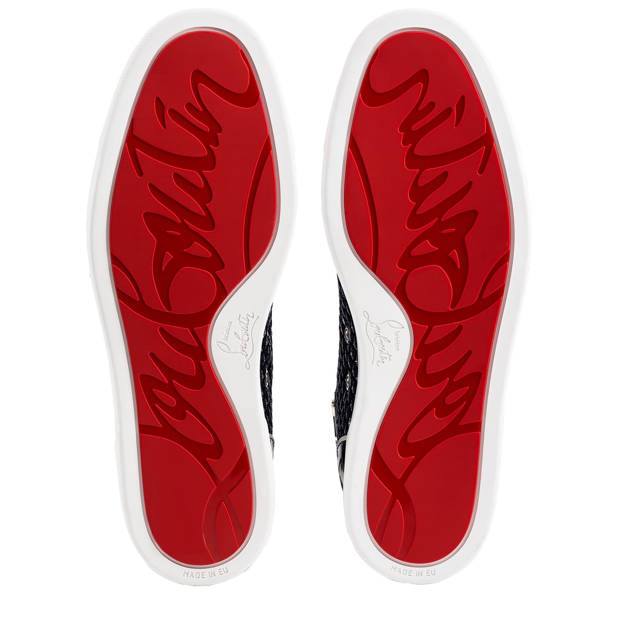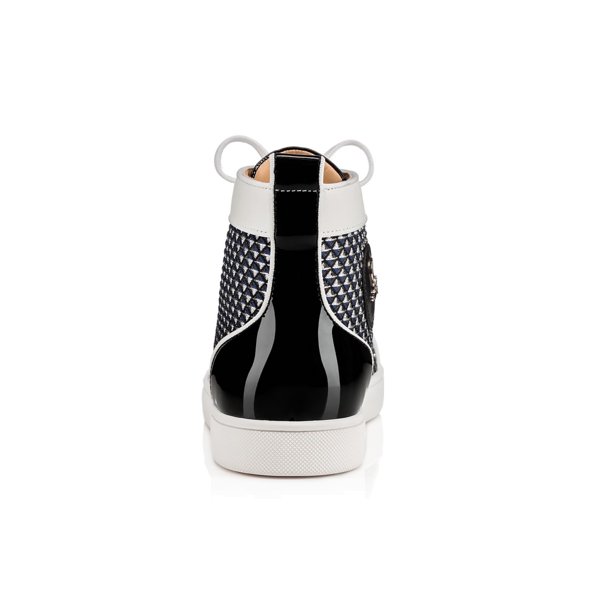 Update your red sole sneaker collectsion with “Lou Spikes Orlato Flat” in navy glitter pyramid with black patent and white leather trim. This coveted Louboutin hightop makes an irresistible addition to your casual looks.